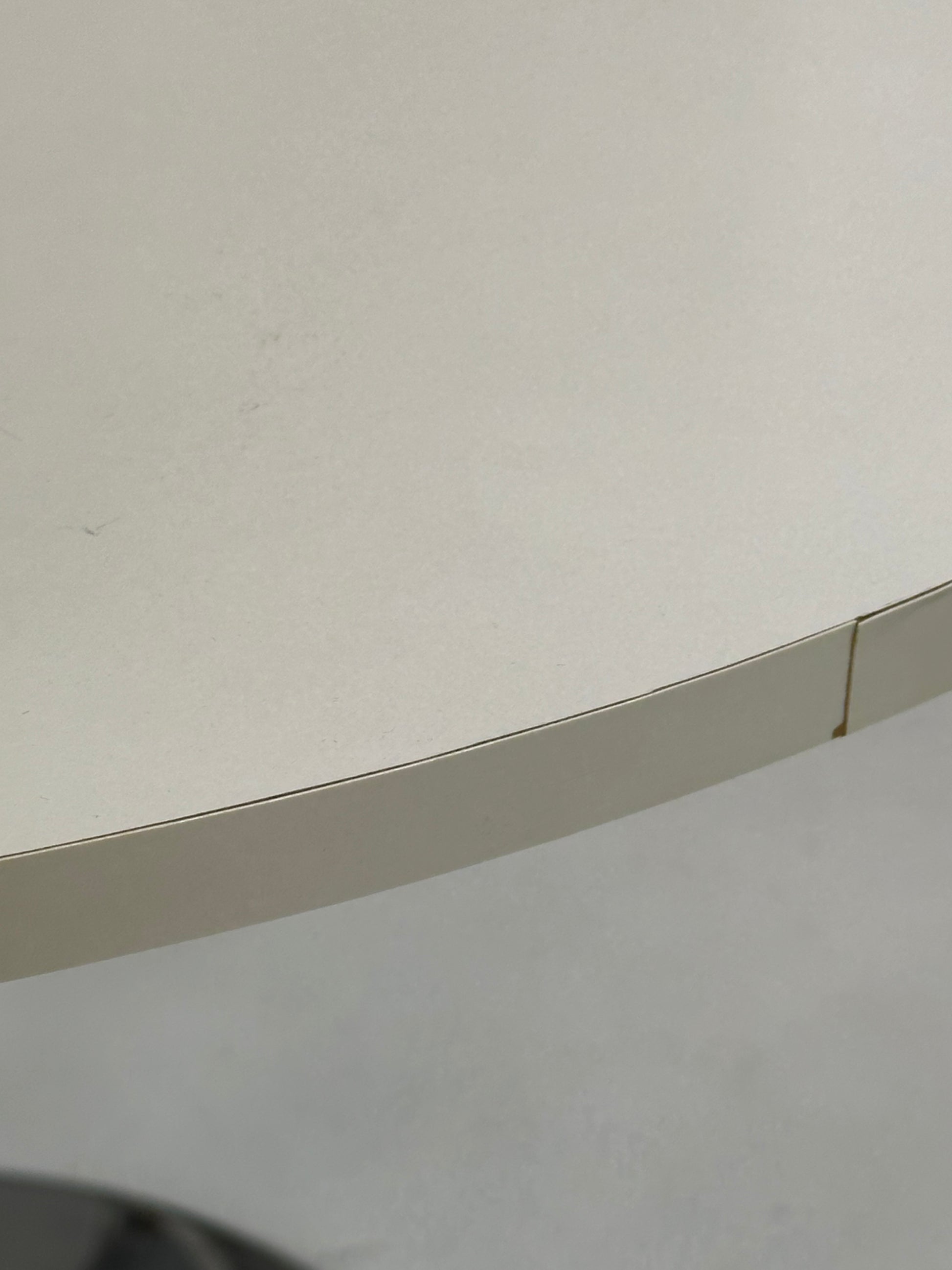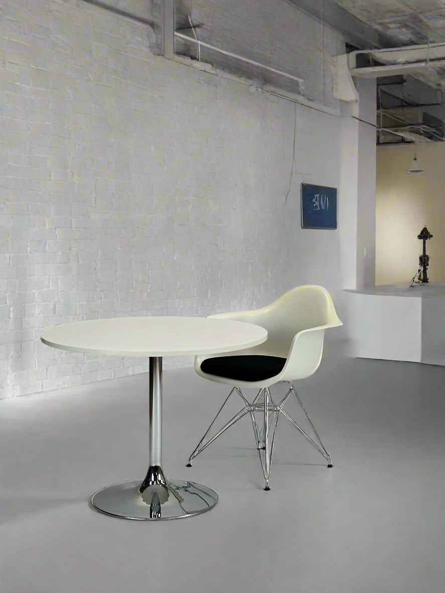 Dette elegante runde bord er en stilren og funktionel løsning til både caféområder, mødelokaler og uformelle kontorzoner. Bordet er udstyret med en hvid laminatbordplade, der giver et lyst og imødekommende udtryk, samt et centralt søjlestel i krom med rund fod, som sikrer stabilitet og giver god benplads hele vejen rundt.