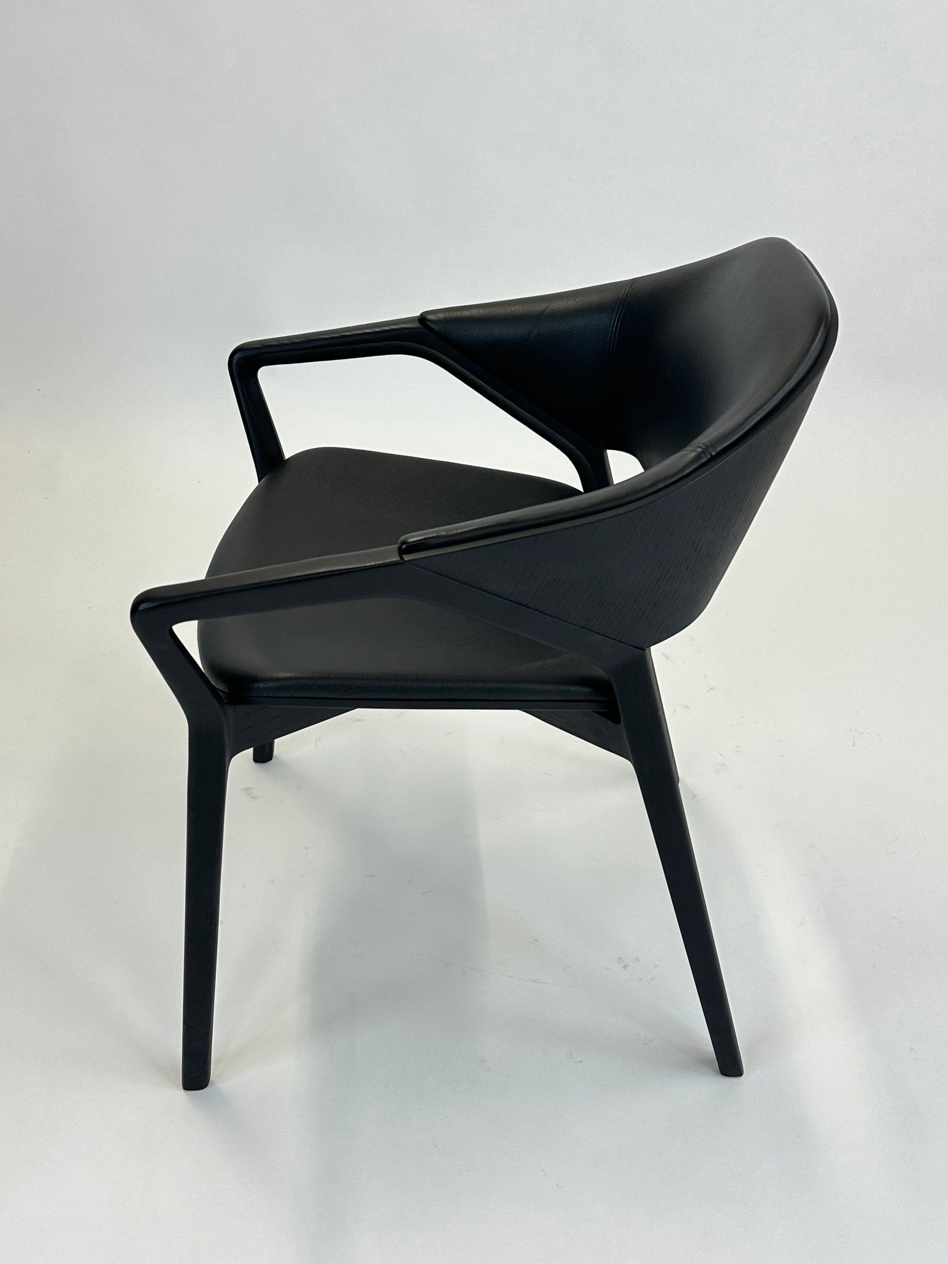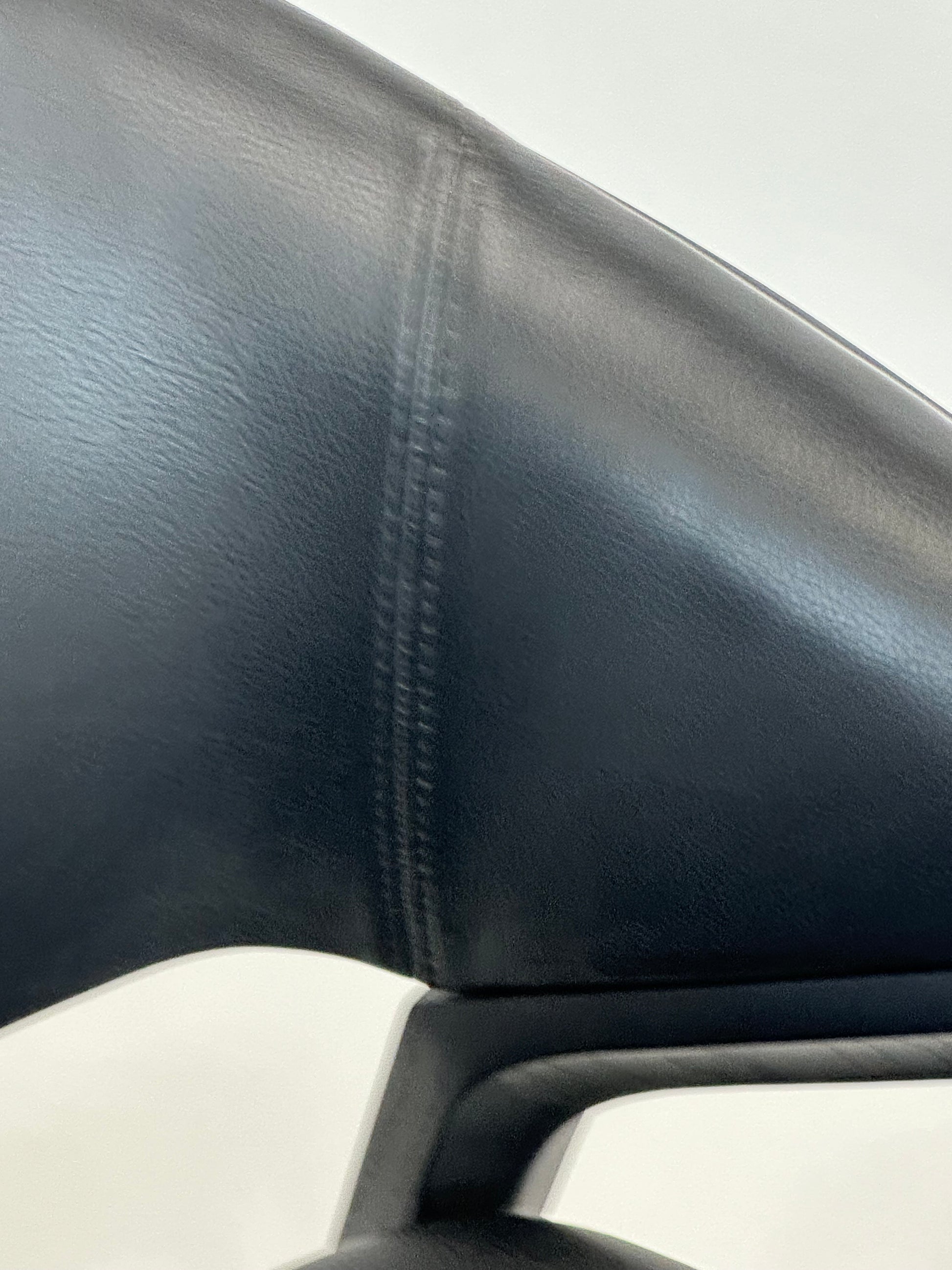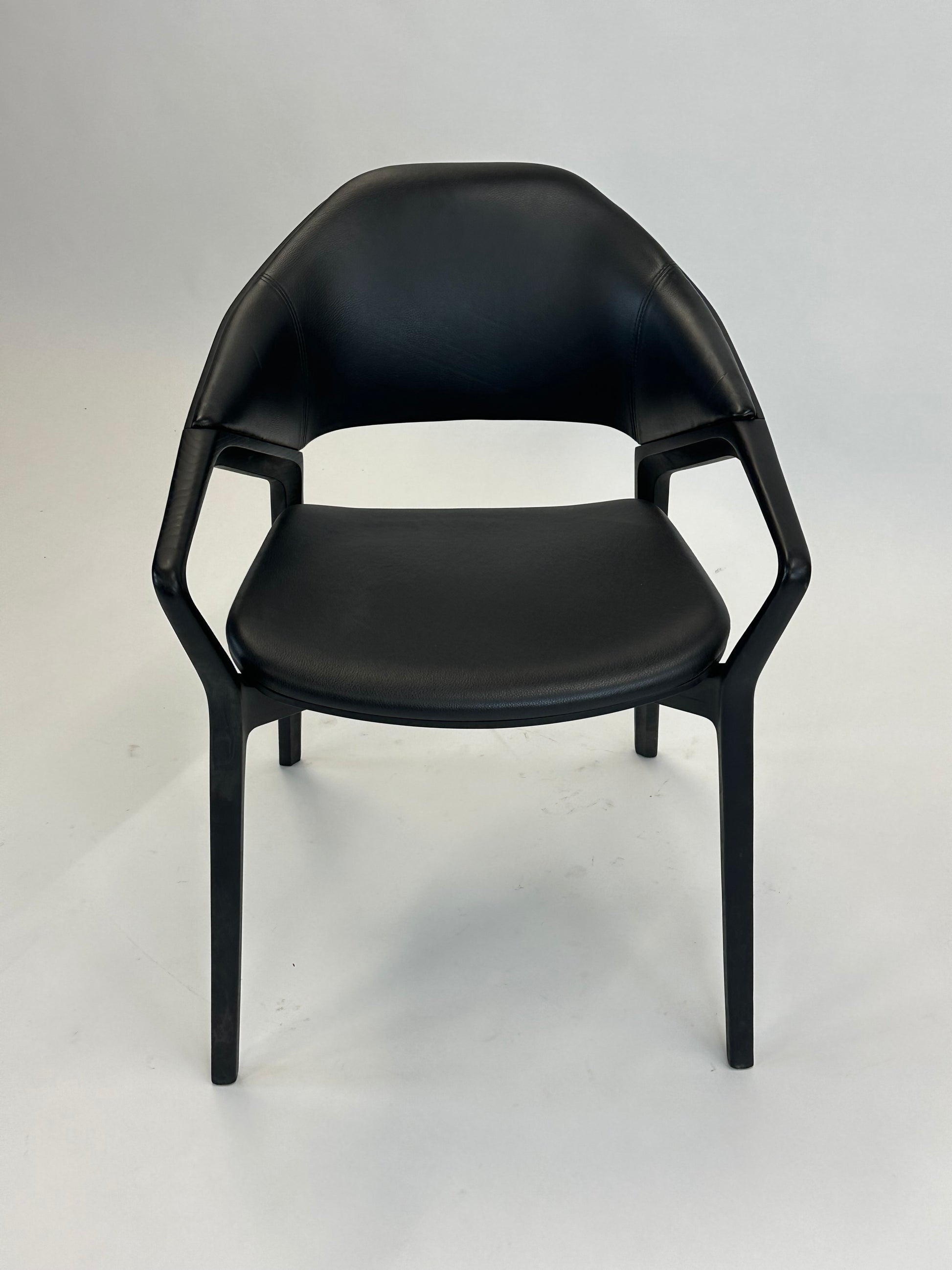 Stolen er polstret i sort læder med en træ ryg, hvilket giver en luksuriøs og elegant finish, mens den formstøbte konstruktion sikrer optimal støtte og komfort. Stellet er udført i slidstærkt materiale med en let og moderne silhuet, der både er robust og visuelt let. ICO Chair er desuden designet med integrerede armlæn, der giver en ergonomisk siddeoplevelse og understøtter stolens eksklusive udtryk.