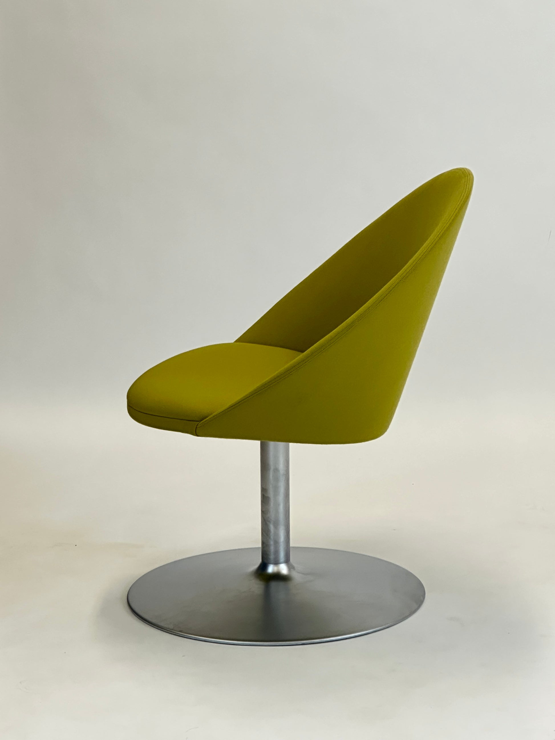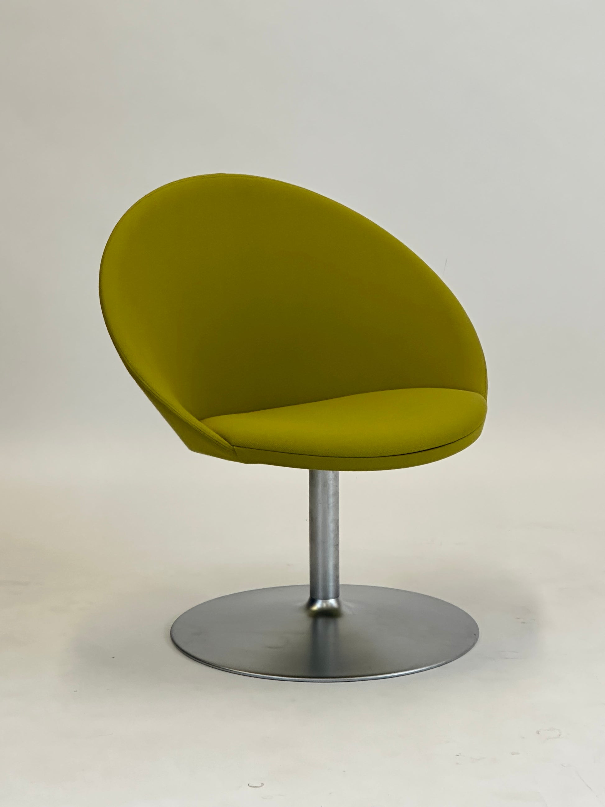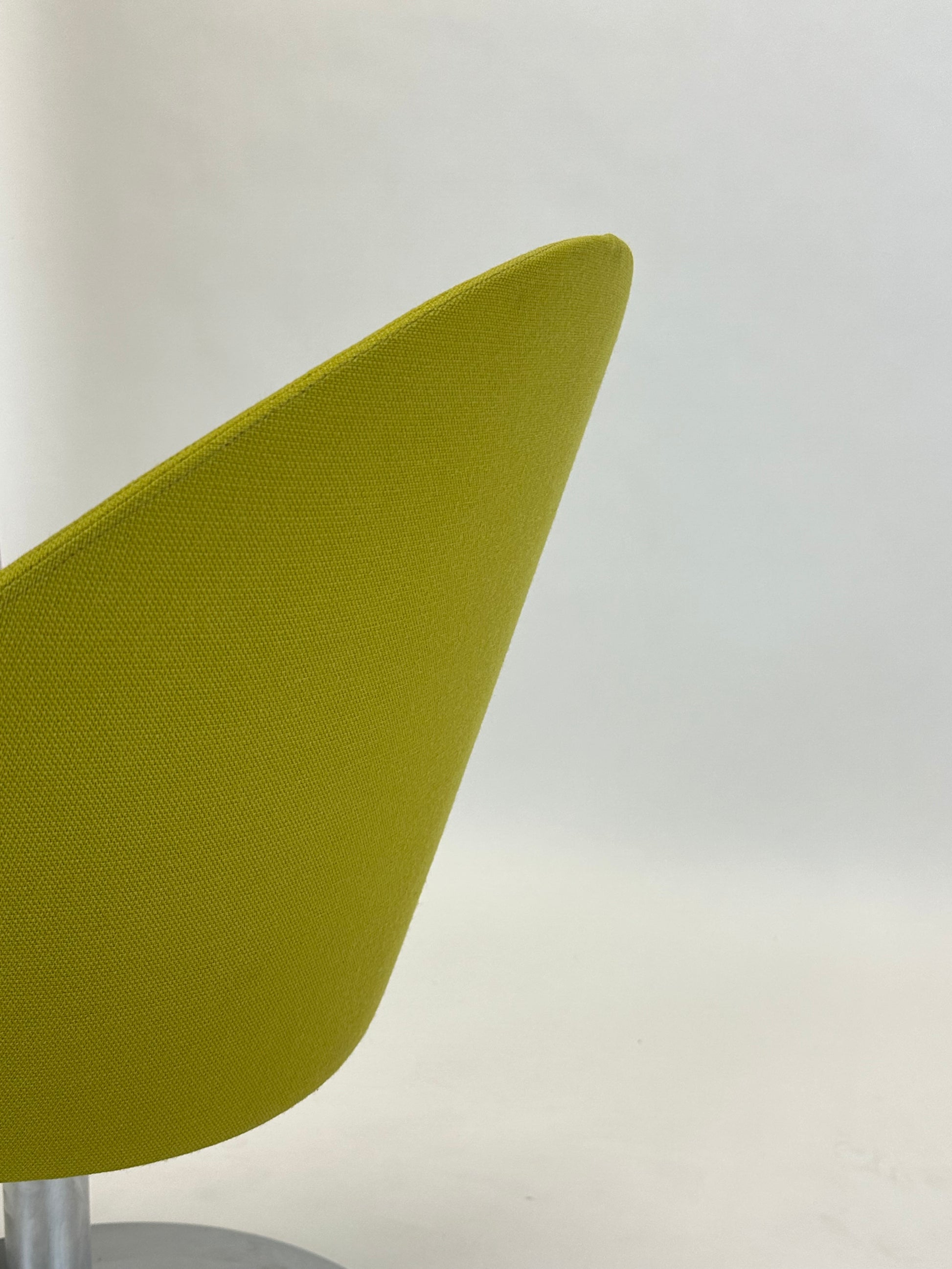 Den buede ryg og det polstrede sæde giver en komfortabel siddeoplevelse, mens den stabile drejefod i børstet aluminium tilføjer en moderne kant. Den limegrønne polstring skaber et friskt og stilfuldt indslag i både kontorlandskaber, receptionsområder og private hjem.