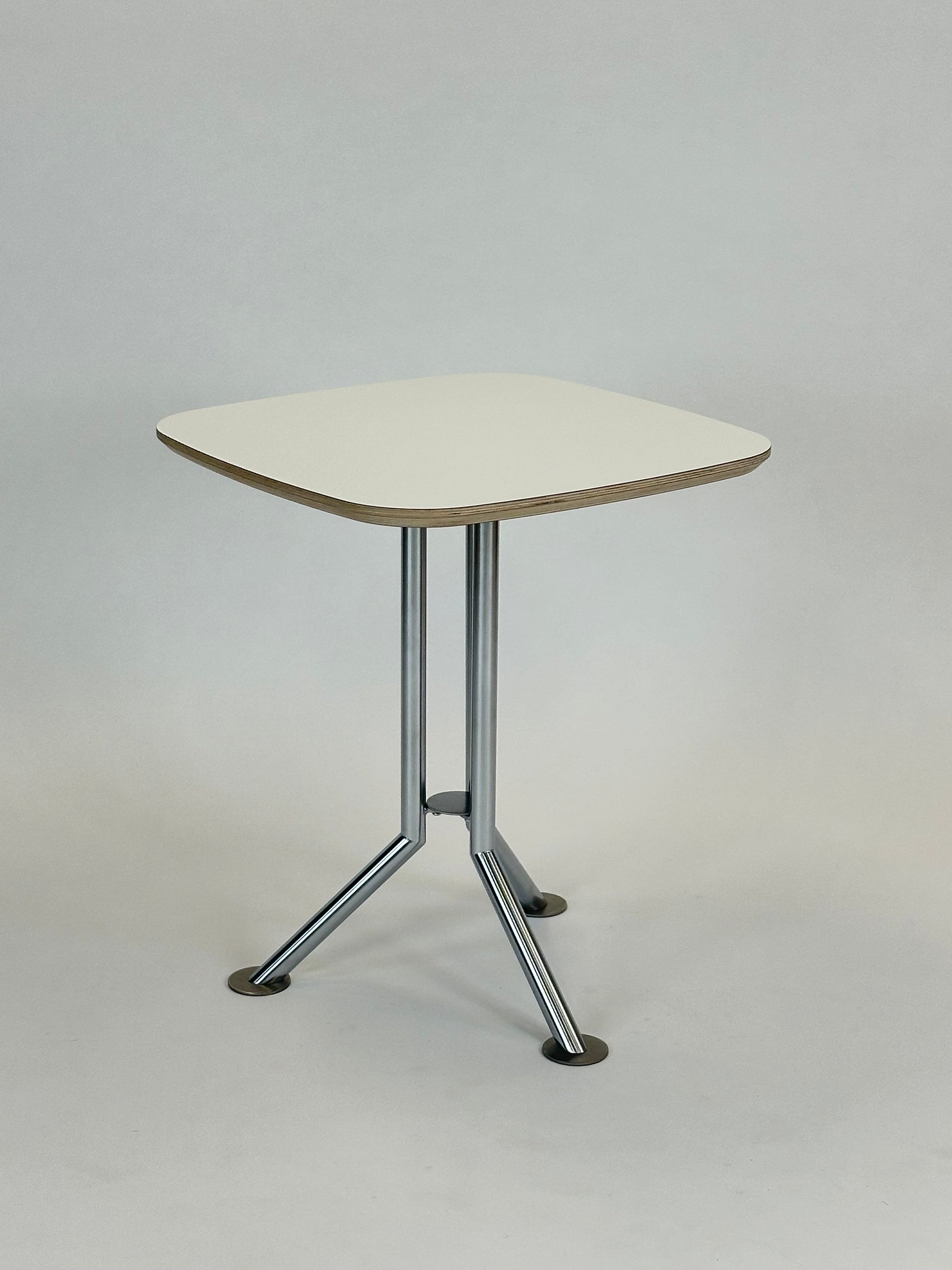 - Bordplade: Kvadratisk bordplade i højtrykslaminat, der sikrer en modstandsdygtig og let rengørlig overflade.