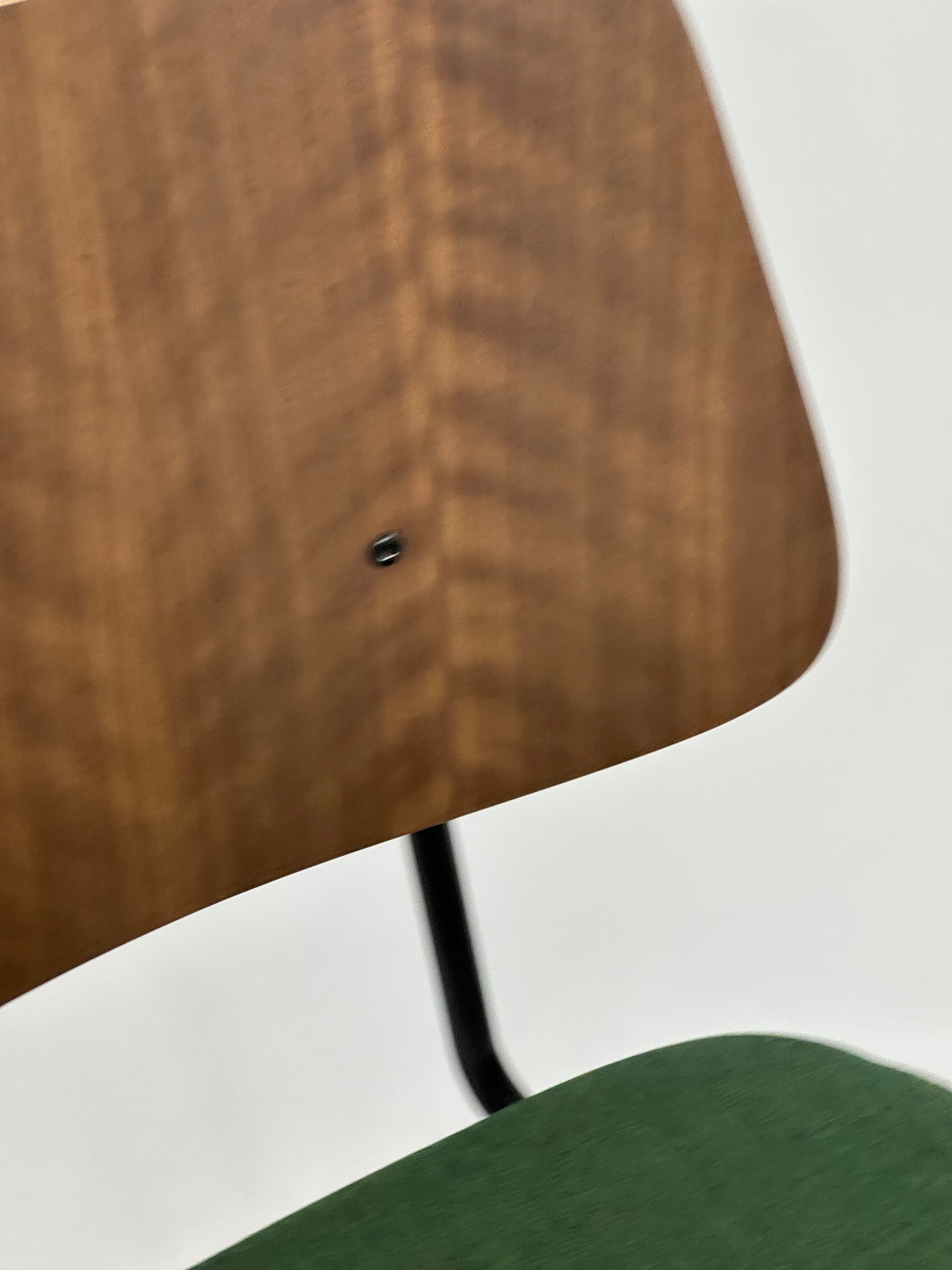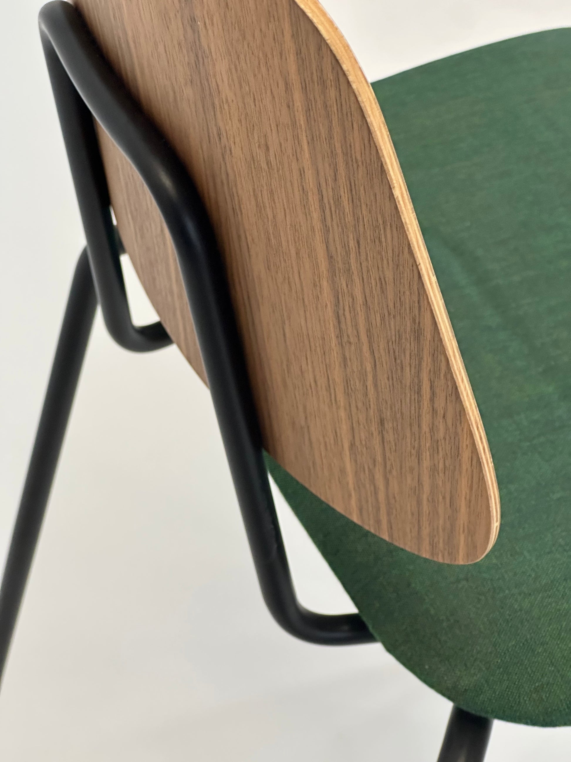 - Sæde & Ryg: Ryggen er fremstillet i træfiner, der giver en elegant og klassisk finish, sædet har en blød grøn polstring som beklæder den trælige ryg.