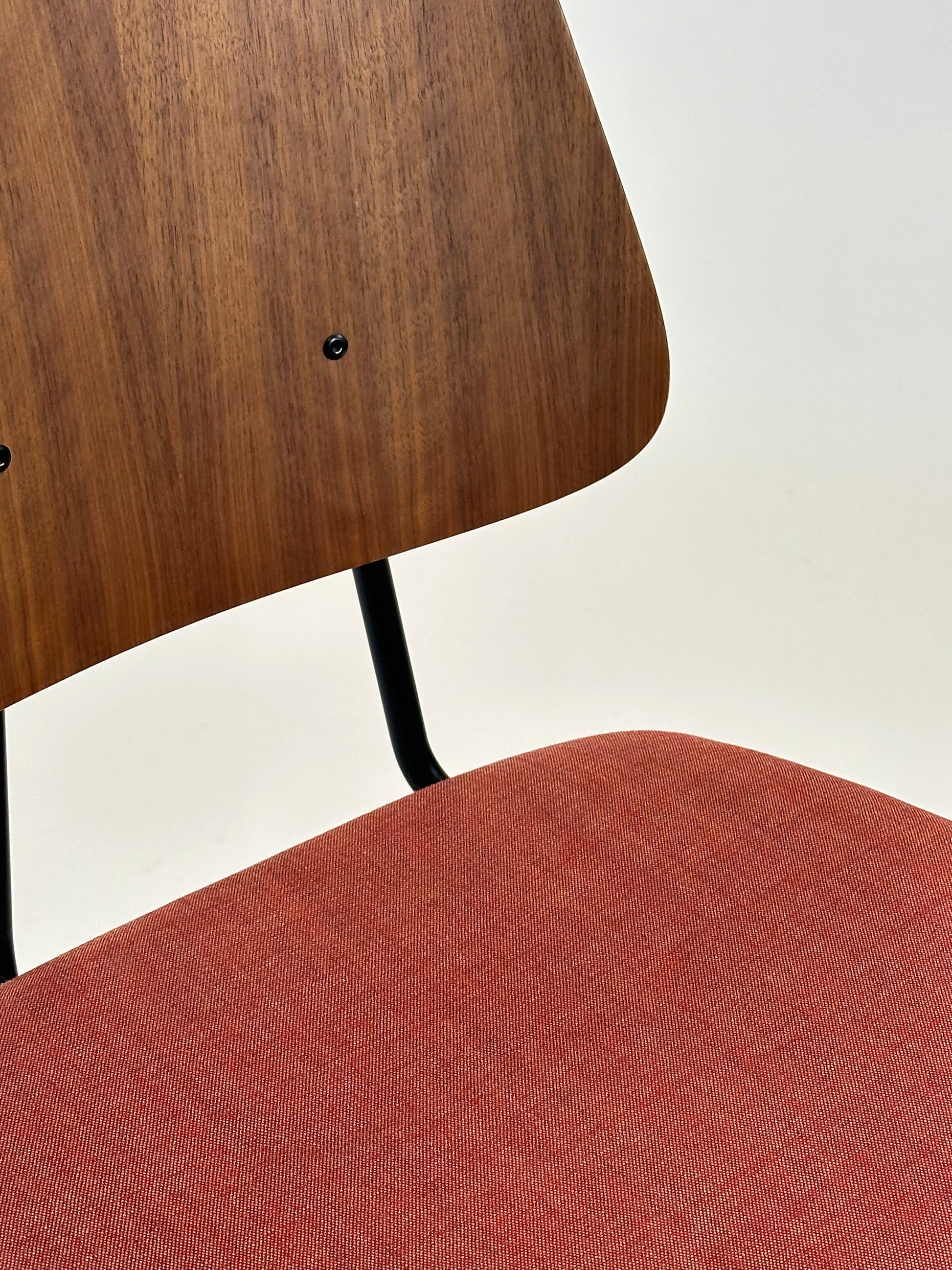 - Sæde & Ryg: Ryggen er fremstillet i træfiner, der giver en elegant og klassisk finish, sædet har en skarp rød polstring som beklæder den trælige ryg.