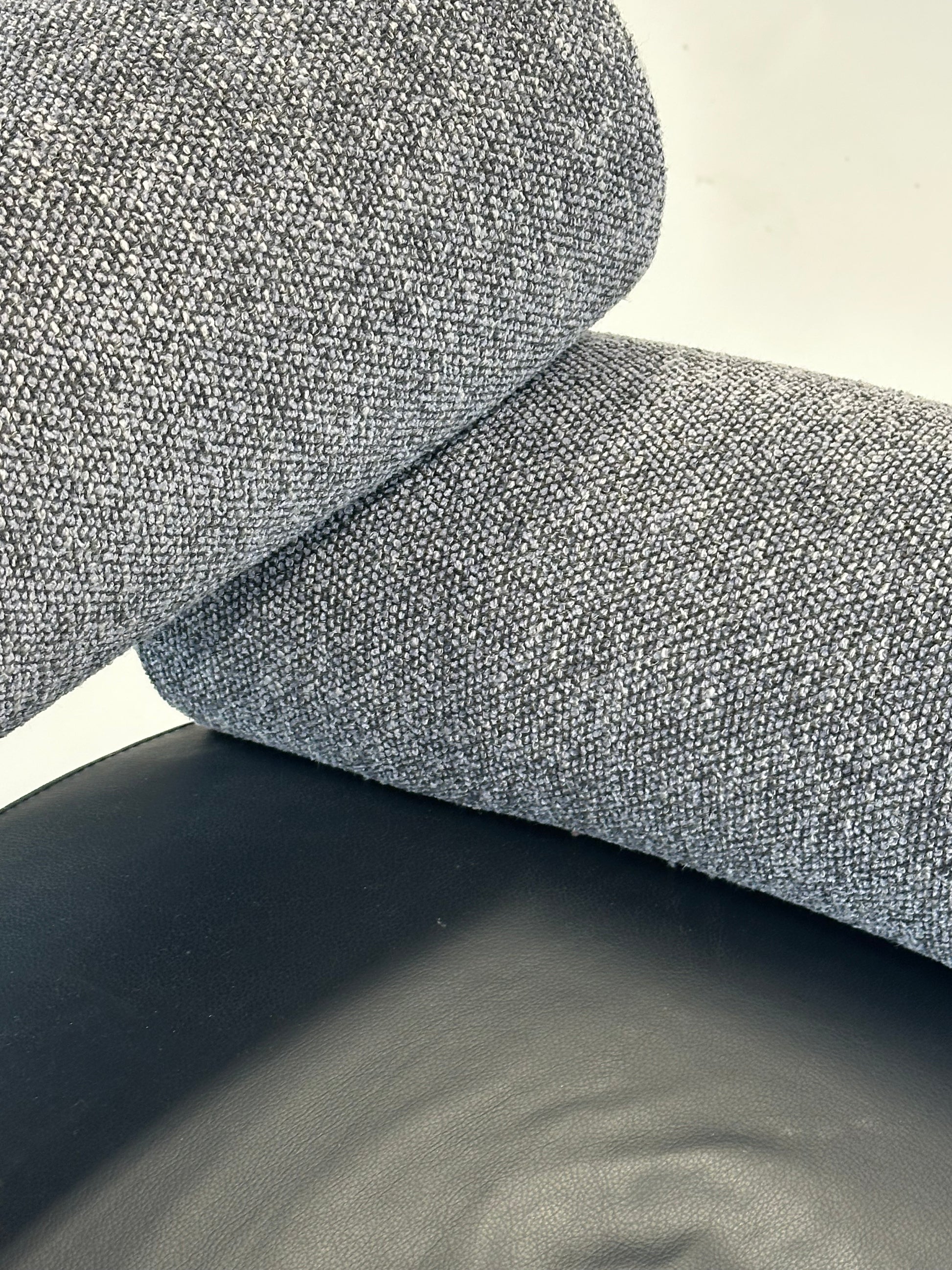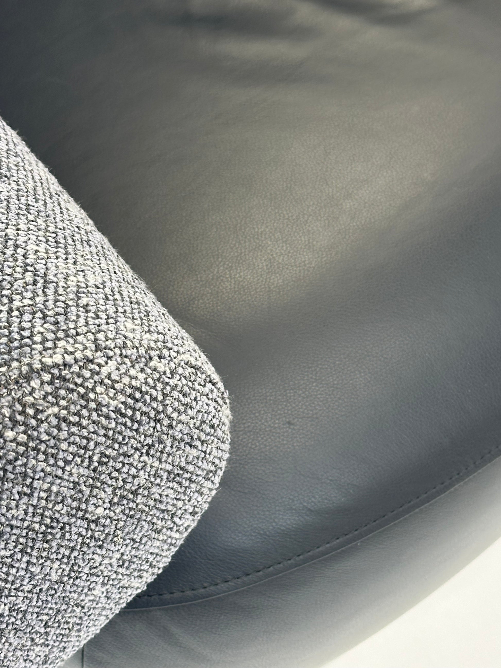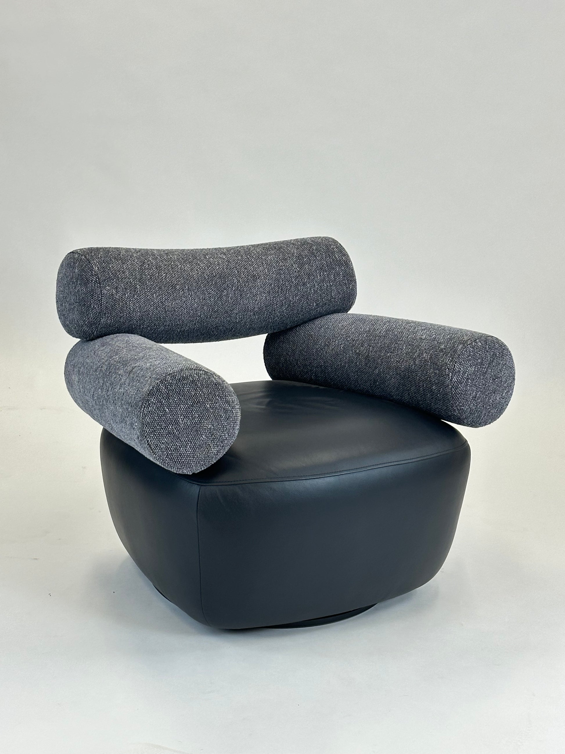 Stolen er polstret med en kombination af mørkeblåt læder på sædet og slidstærkt tekstil på de runde armlæn/rygpuder, hvilket skaber en spændende kontrast mellem materialer og overflader. Det brede sæde giver en afslappet siddeoplevelse, mens de unikke polstrede ryg- og armlæn støtter kroppen og indbyder til afslapning.