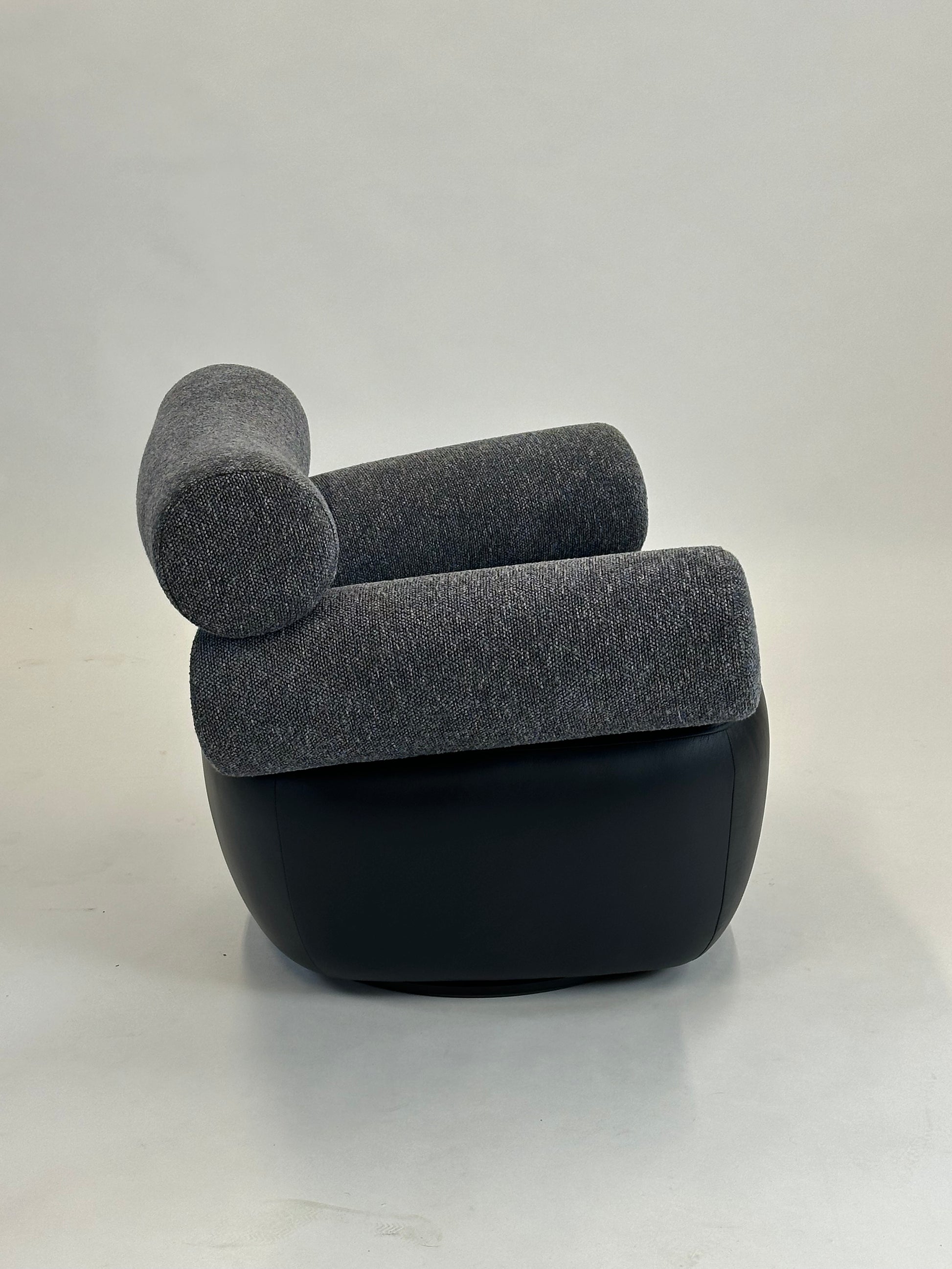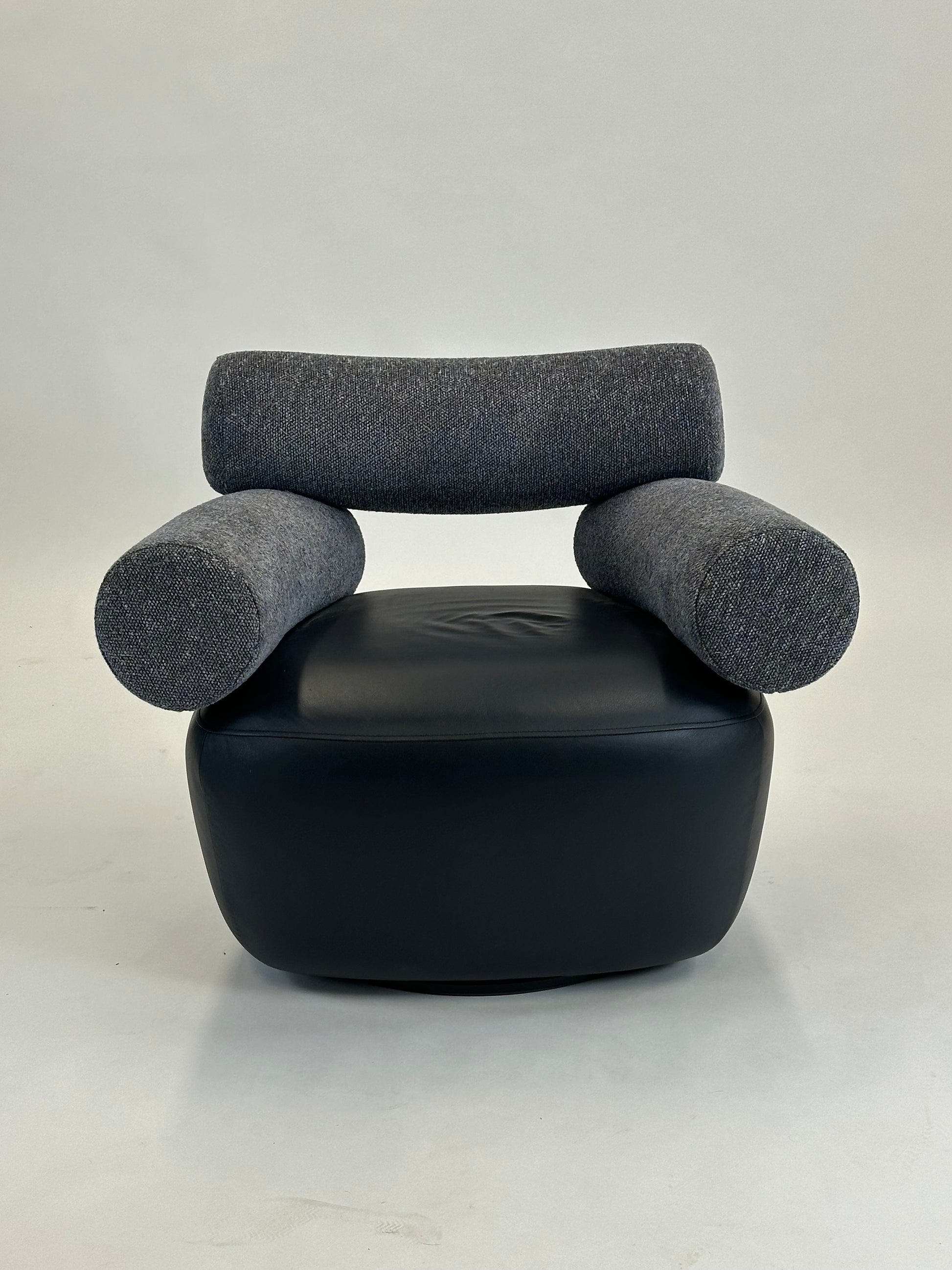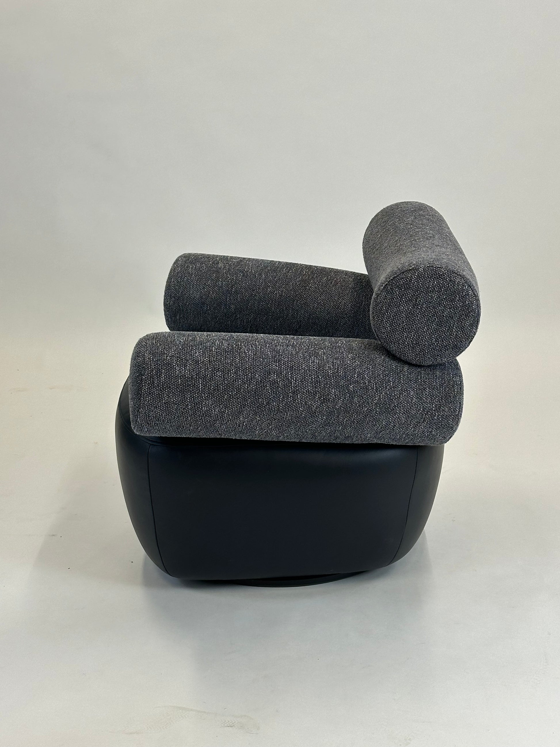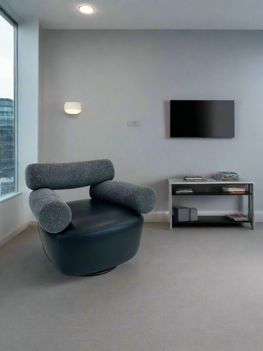 Stolen er polstret med en kombination af mørkeblåt læder på sædet og slidstærkt tekstil på de runde armlæn/rygpuder, hvilket skaber en spændende kontrast mellem materialer og overflader. Det brede sæde giver en afslappet siddeoplevelse, mens de unikke polstrede ryg- og armlæn støtter kroppen og indbyder til afslapning.