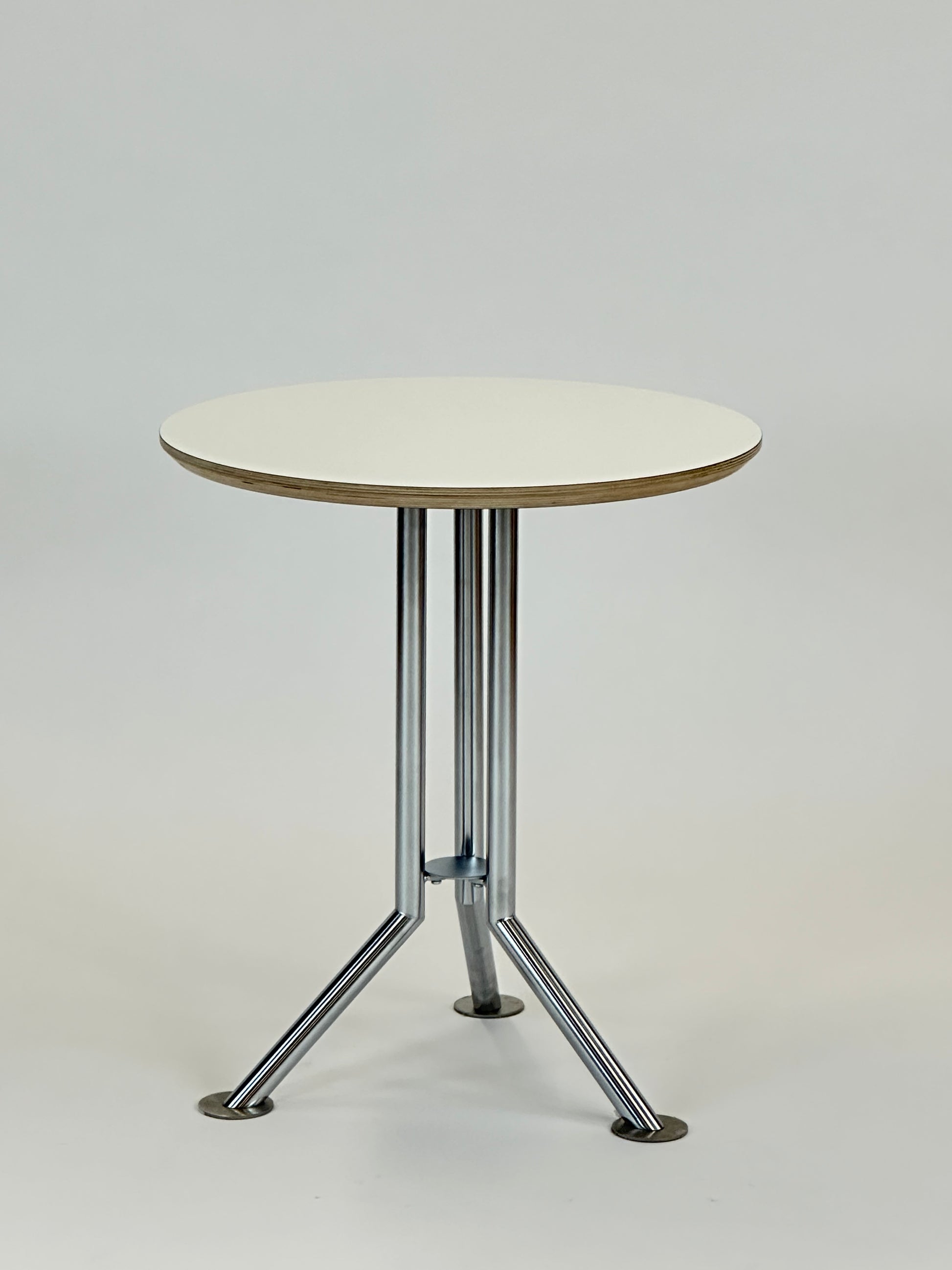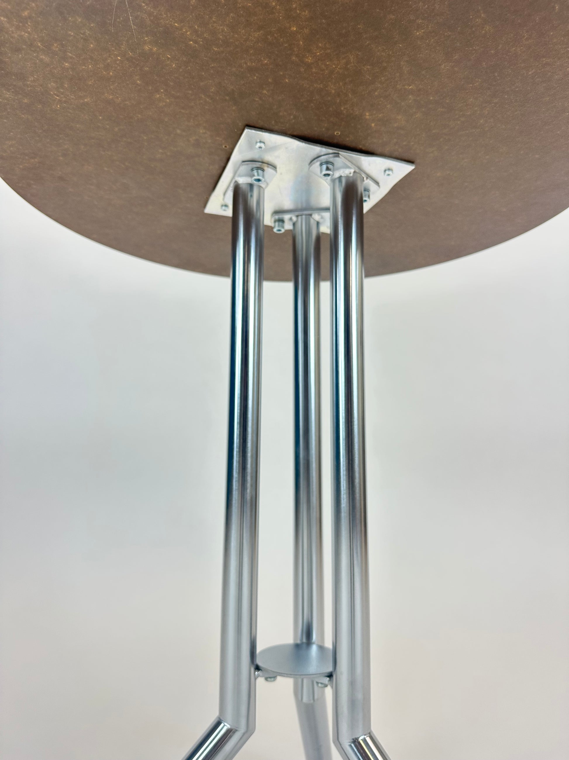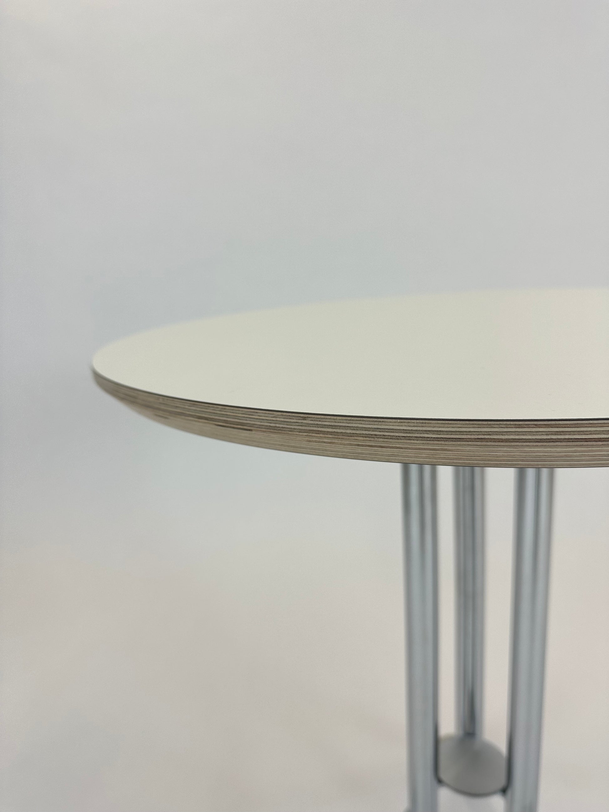 - Bordplade: Rund bordplade i højtrykslaminat med en kontrastkant i træ, der giver et moderne og stilrent look.