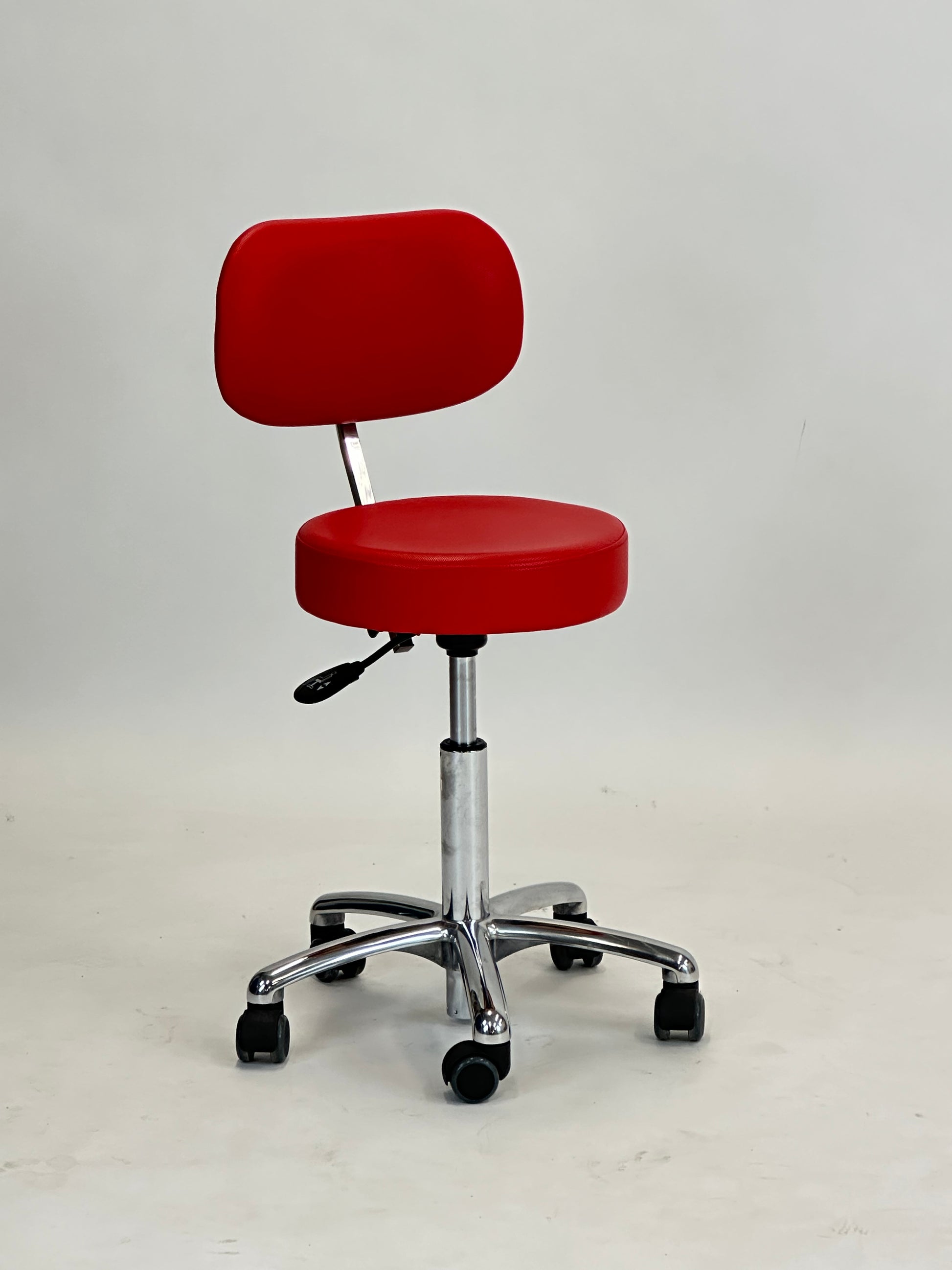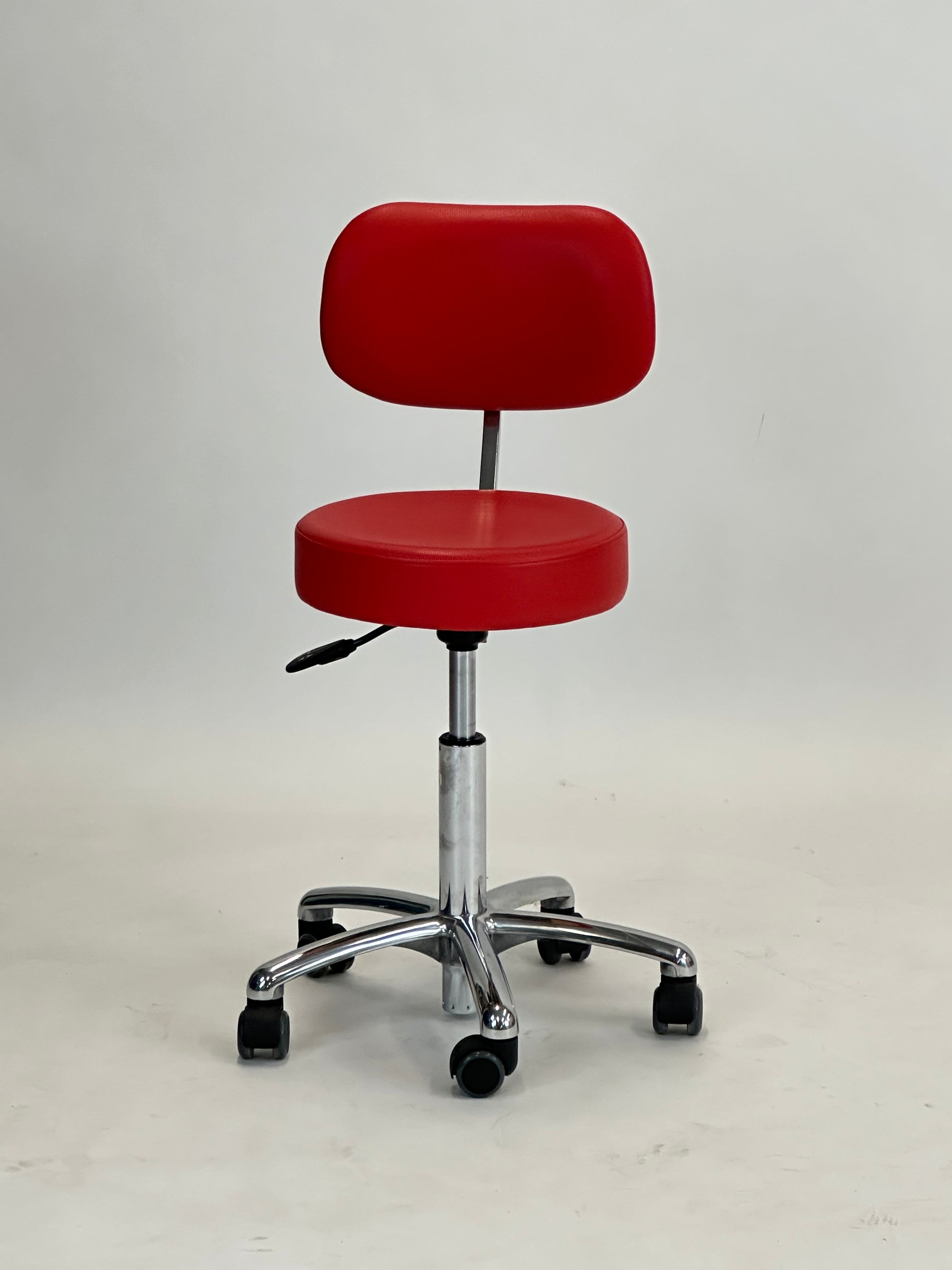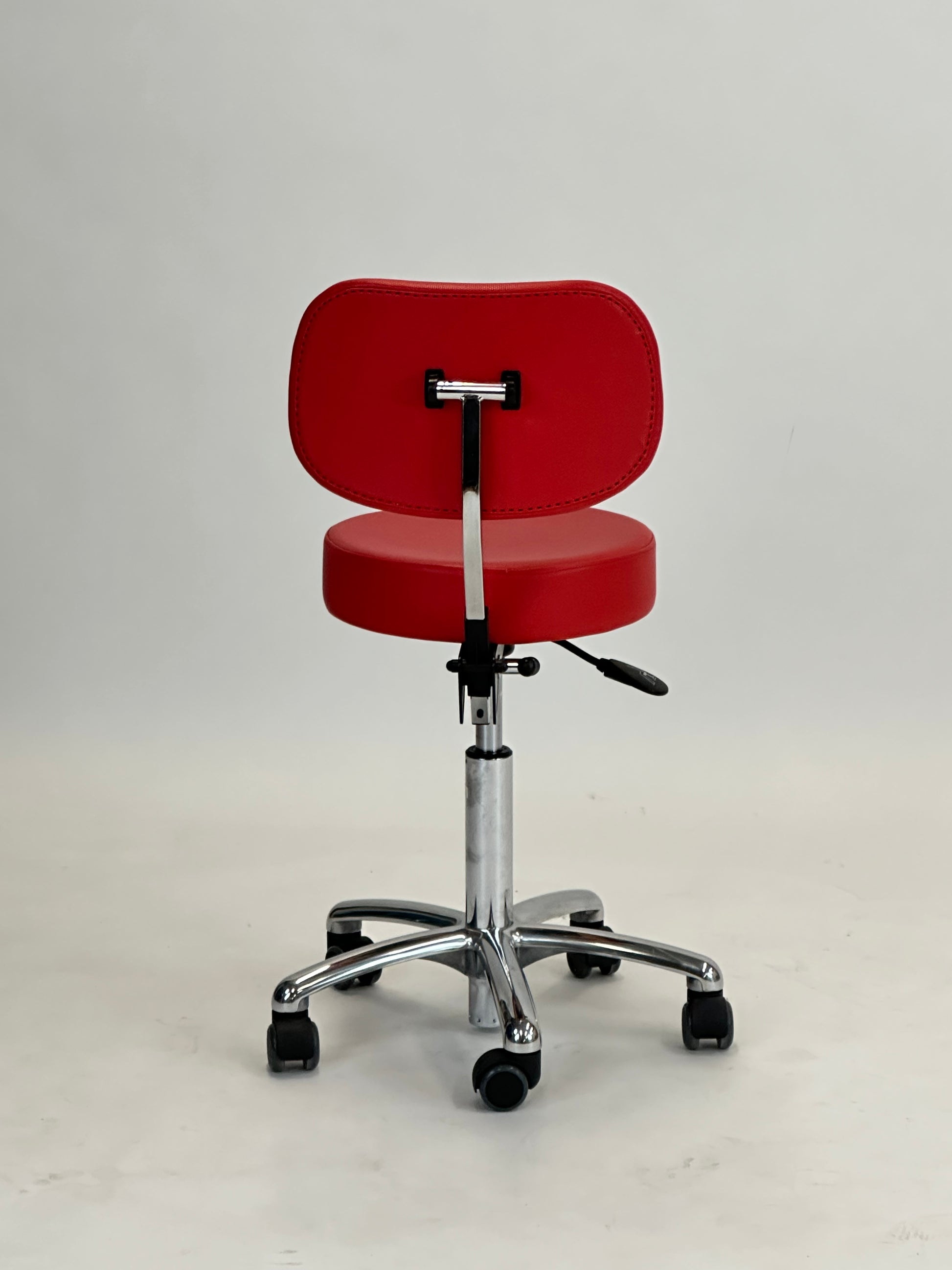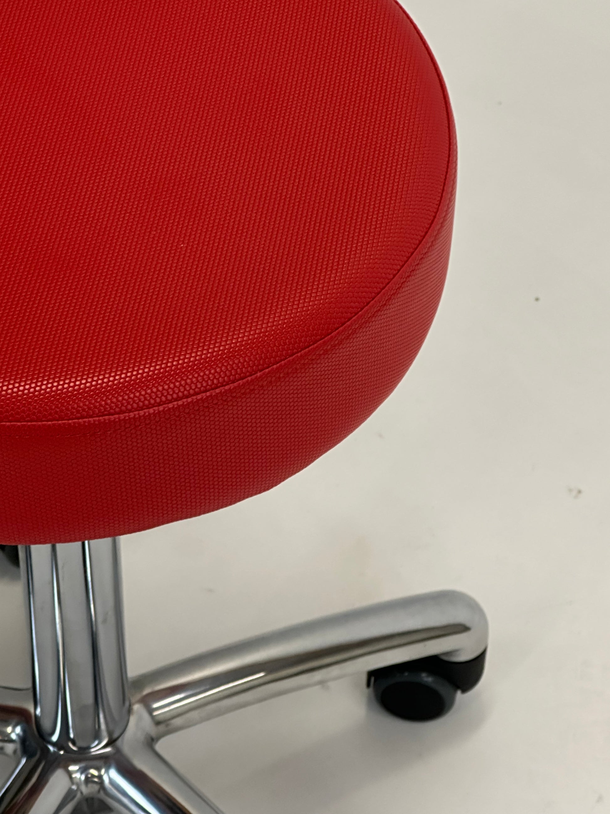 Sædet og ryglænet er betrukket med rød kunstlæder, som ikke blot giver stolen et friskt og markant udtryk, men også gør den nem at rengøre – en klar fordel i professionelle miljøer, hvor hygiejne er i fokus. Højden justeres nemt via den integrerede gaslift, hvilket giver brugeren mulighed for at tilpasse stolen individuelt.