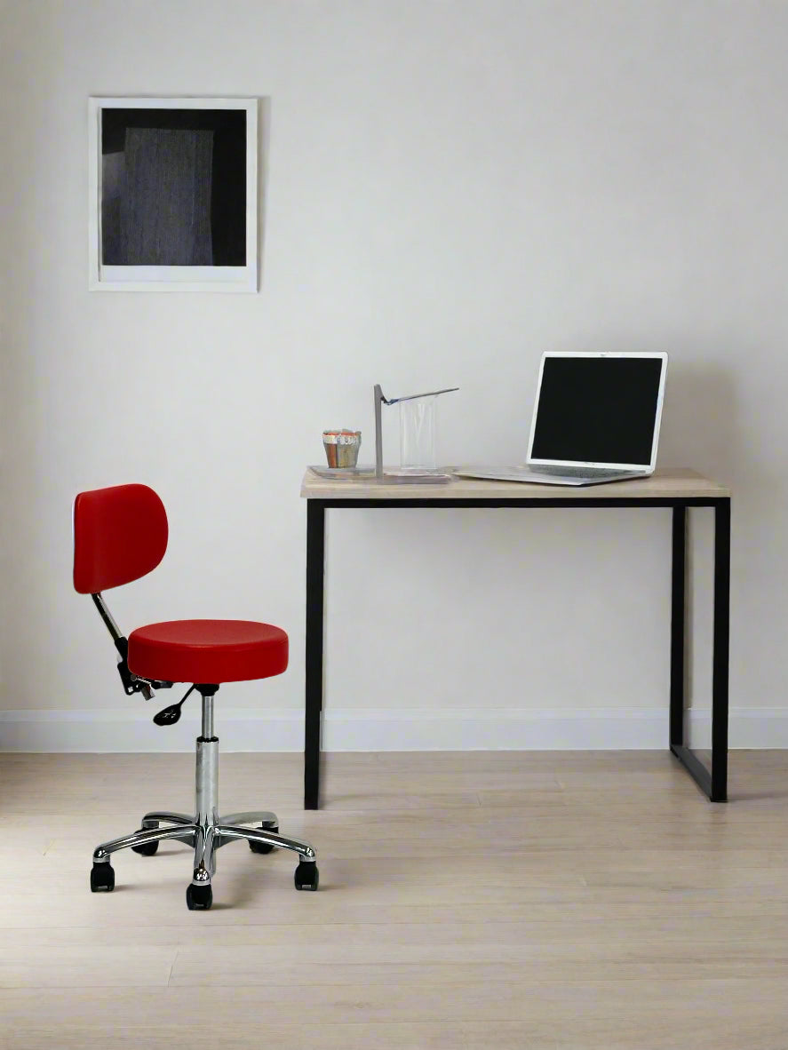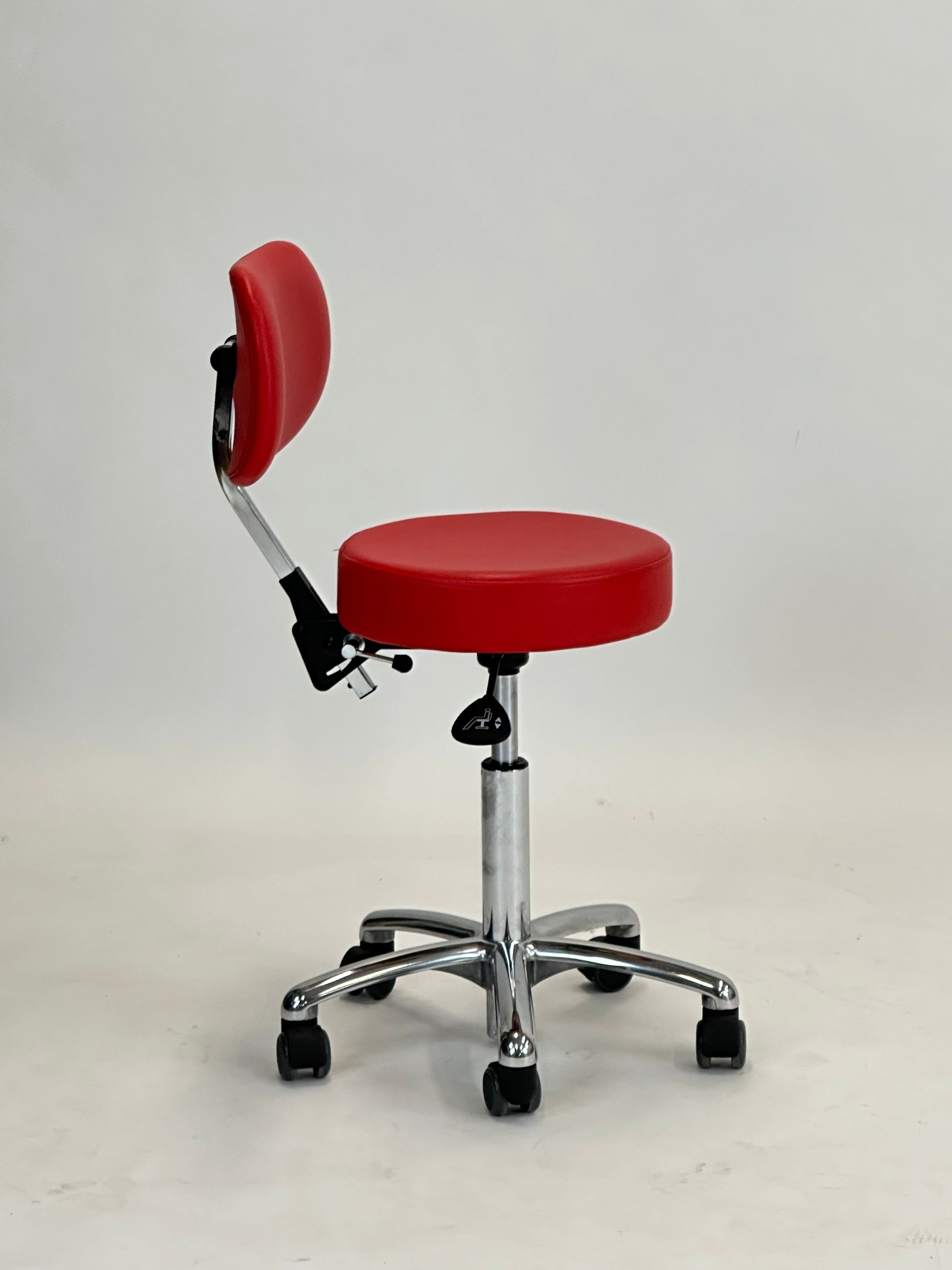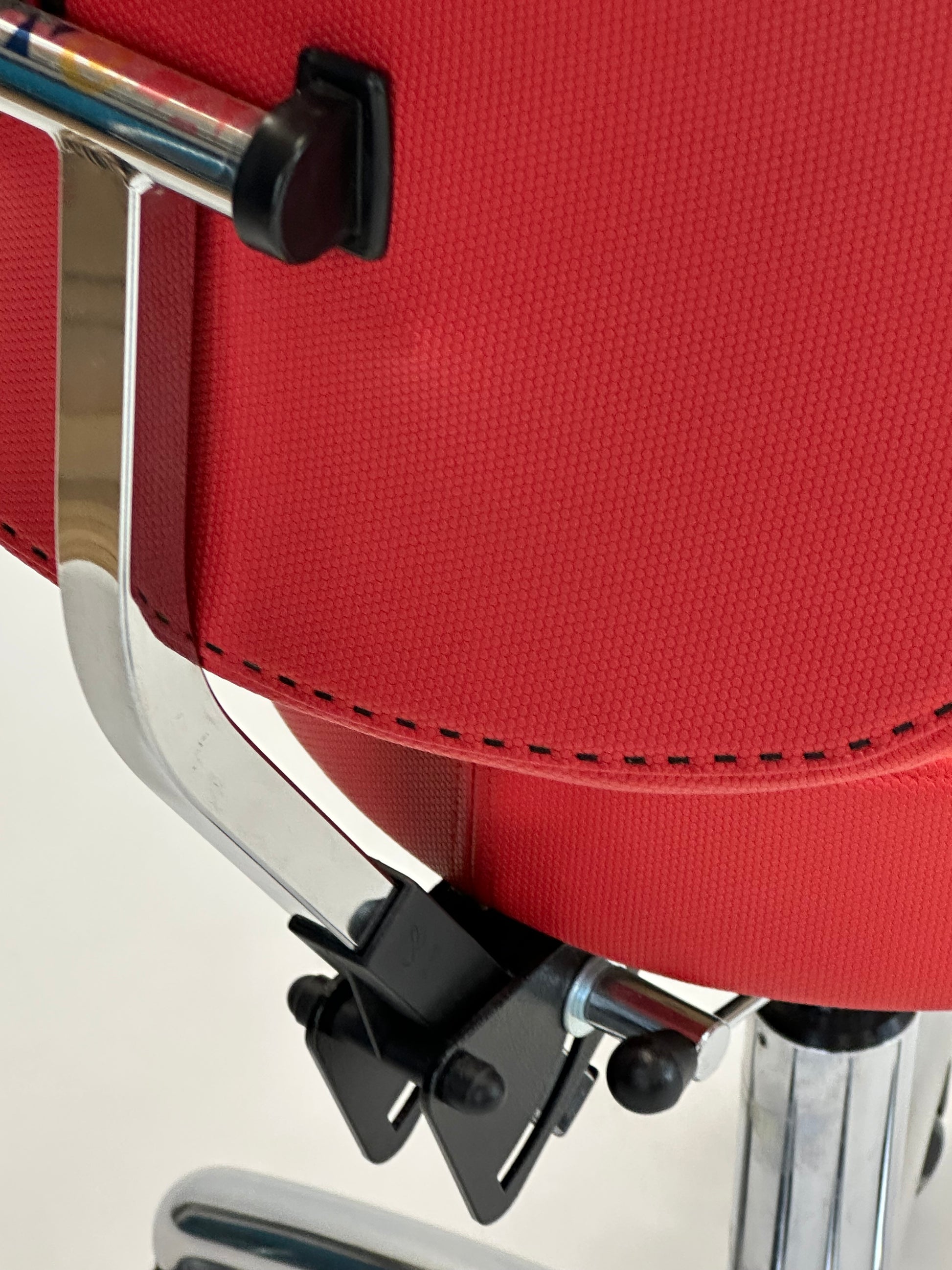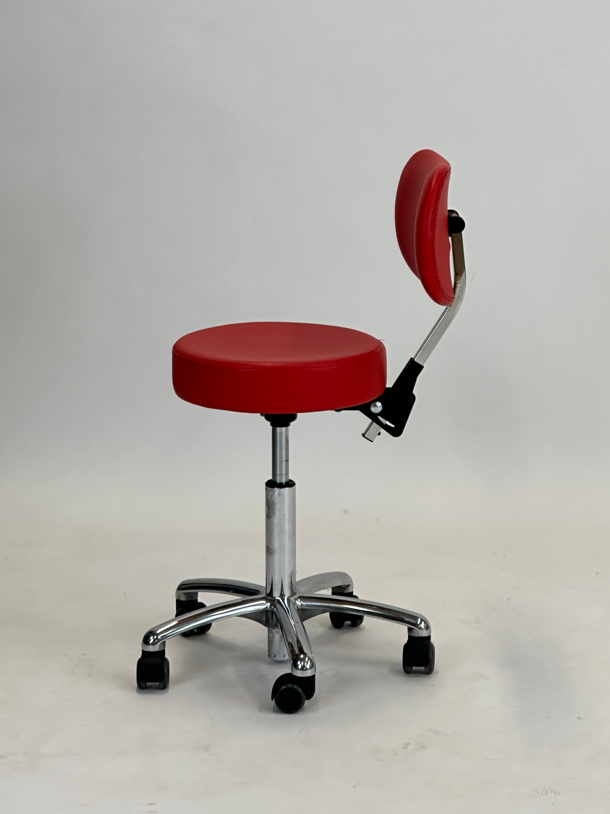 Sædet og ryglænet er betrukket med rød kunstlæder, som ikke blot giver stolen et friskt og markant udtryk, men også gør den nem at rengøre – en klar fordel i professionelle miljøer, hvor hygiejne er i fokus. Højden justeres nemt via den integrerede gaslift, hvilket giver brugeren mulighed for at tilpasse stolen individuelt.