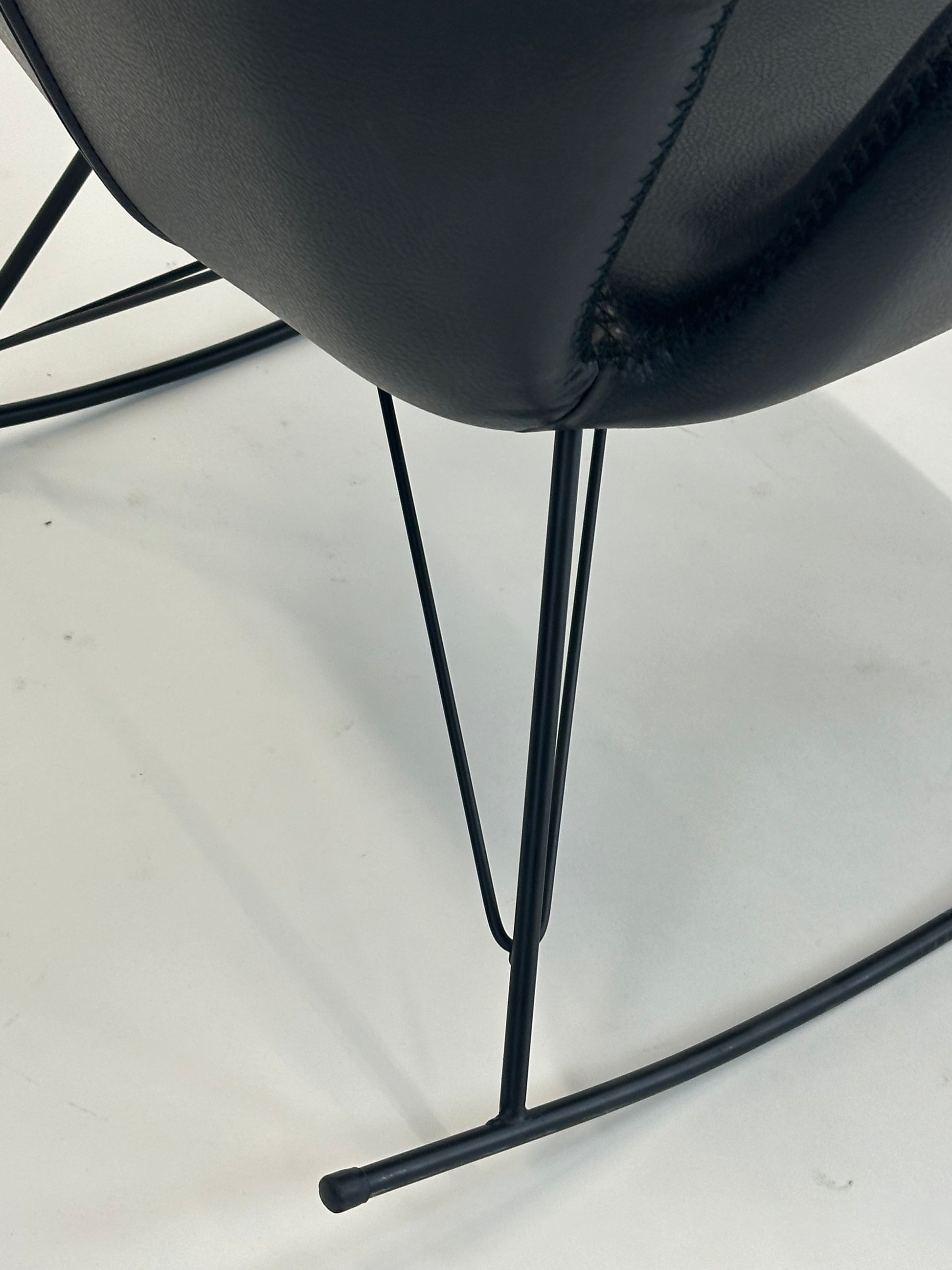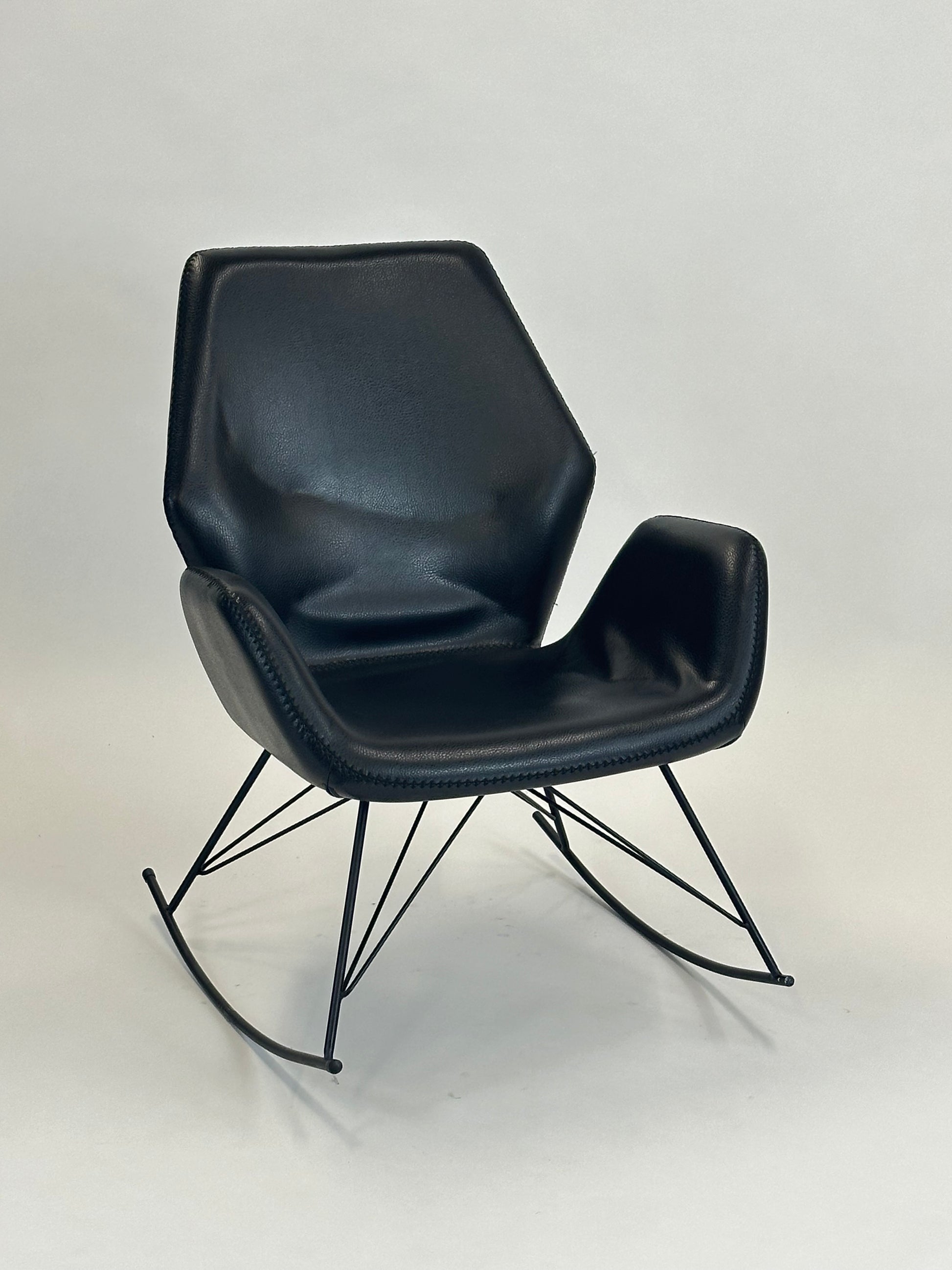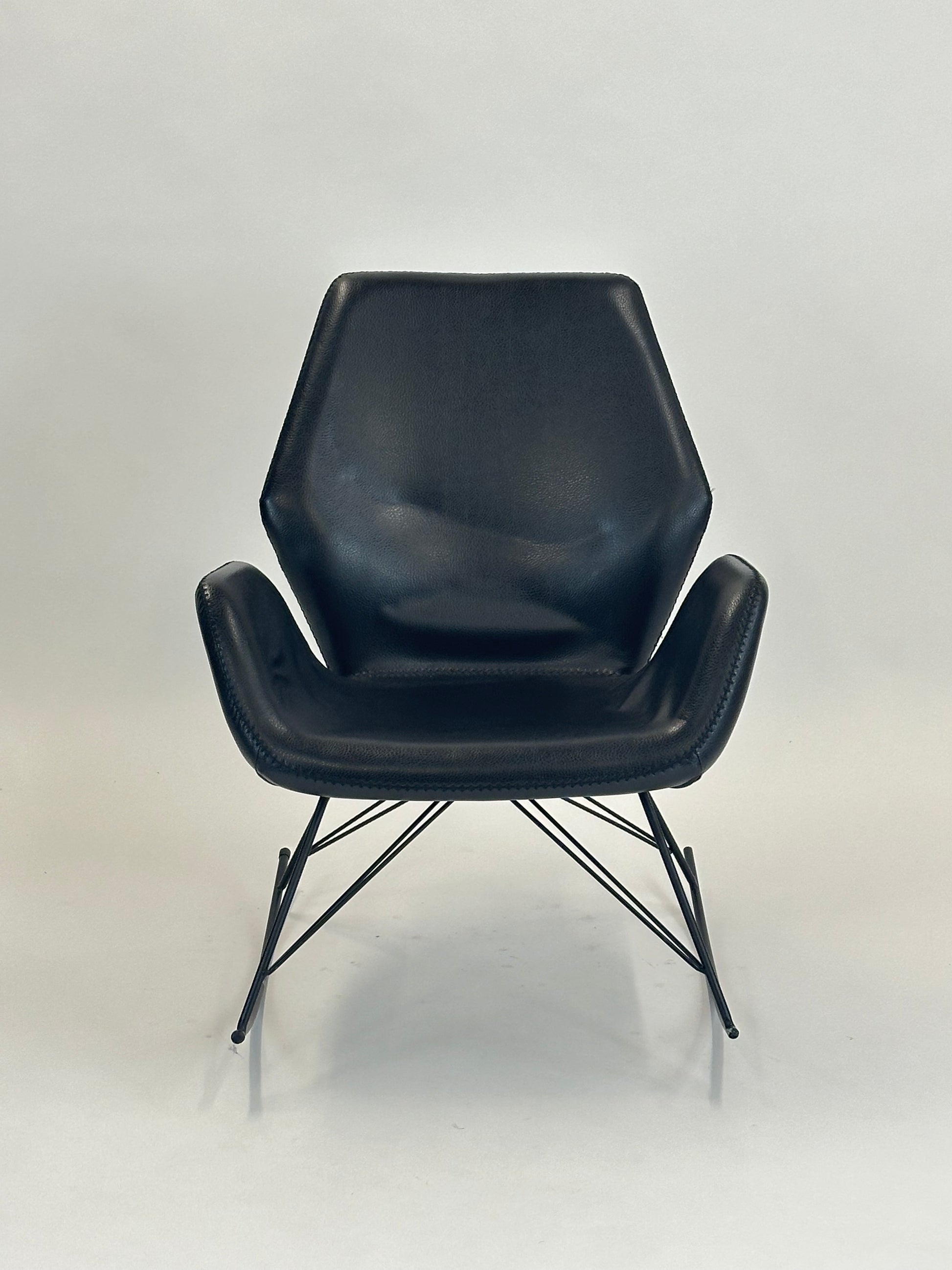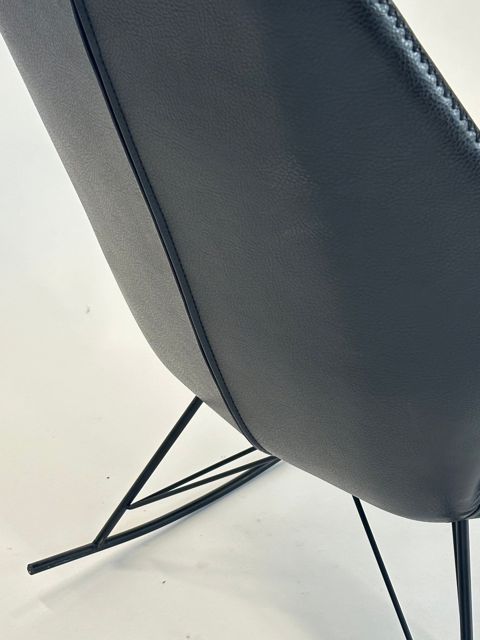 Sædet er polstret i sort kunstlæder, som giver et eksklusivt og sofistikeret look, samtidig med at det er nemt at vedligeholde. Den geometrisk formede ryg og de bløde armlæn sikrer god støtte og komfort. Stellet er udført i sortlakeret stål med gyngemekanik, der skaber en behagelig, let bevægelse og giver stolen et unikt og dynamisk udtryk.