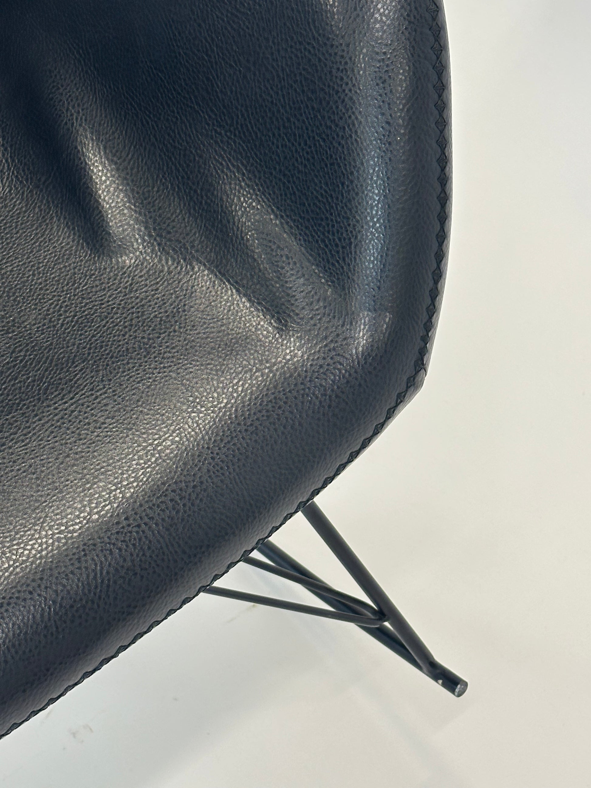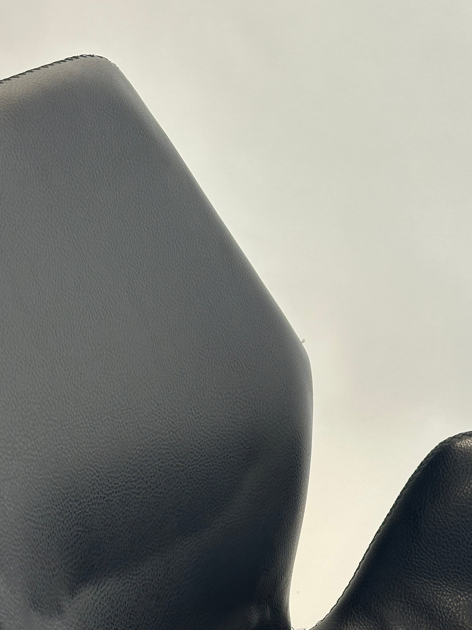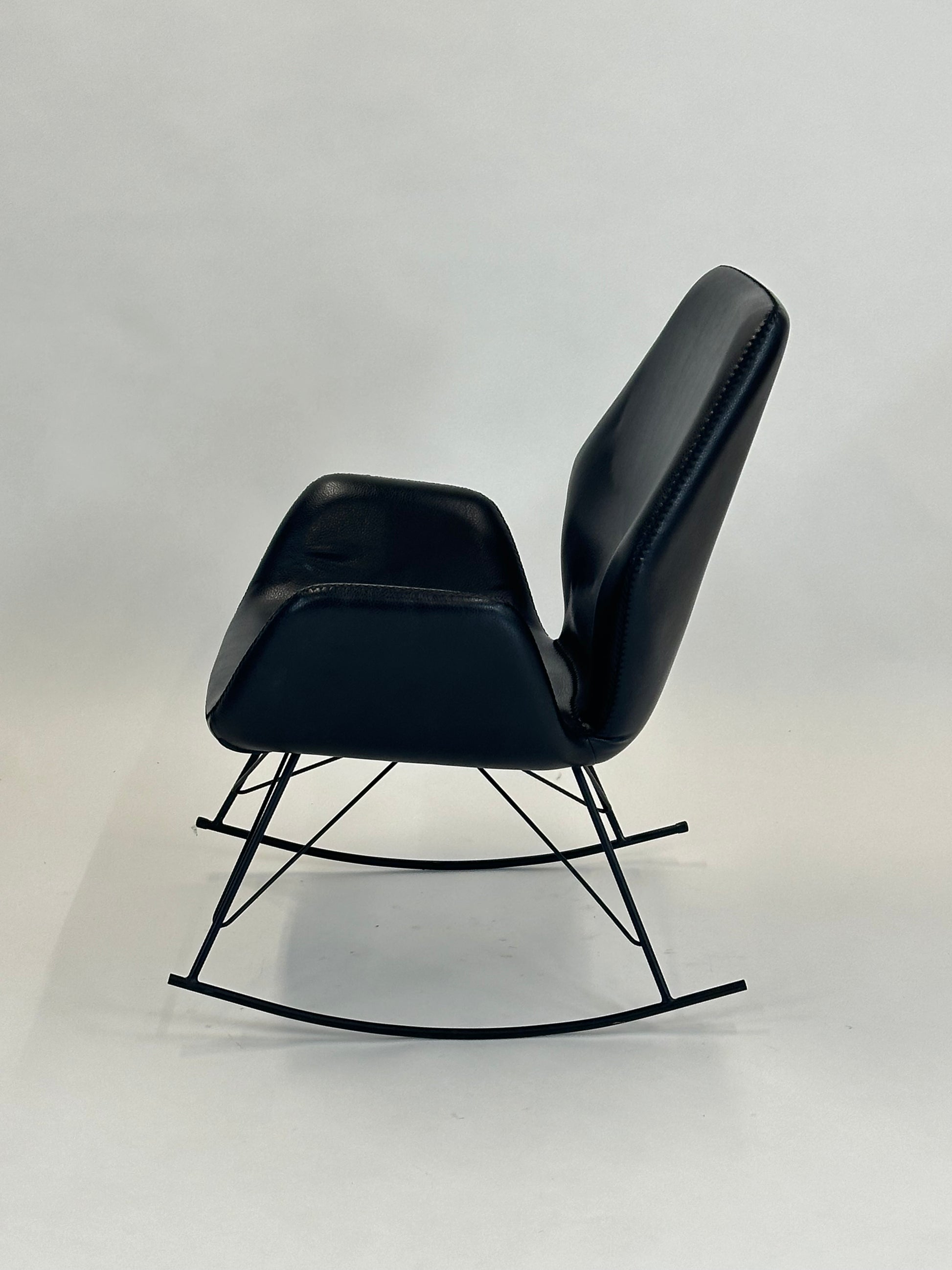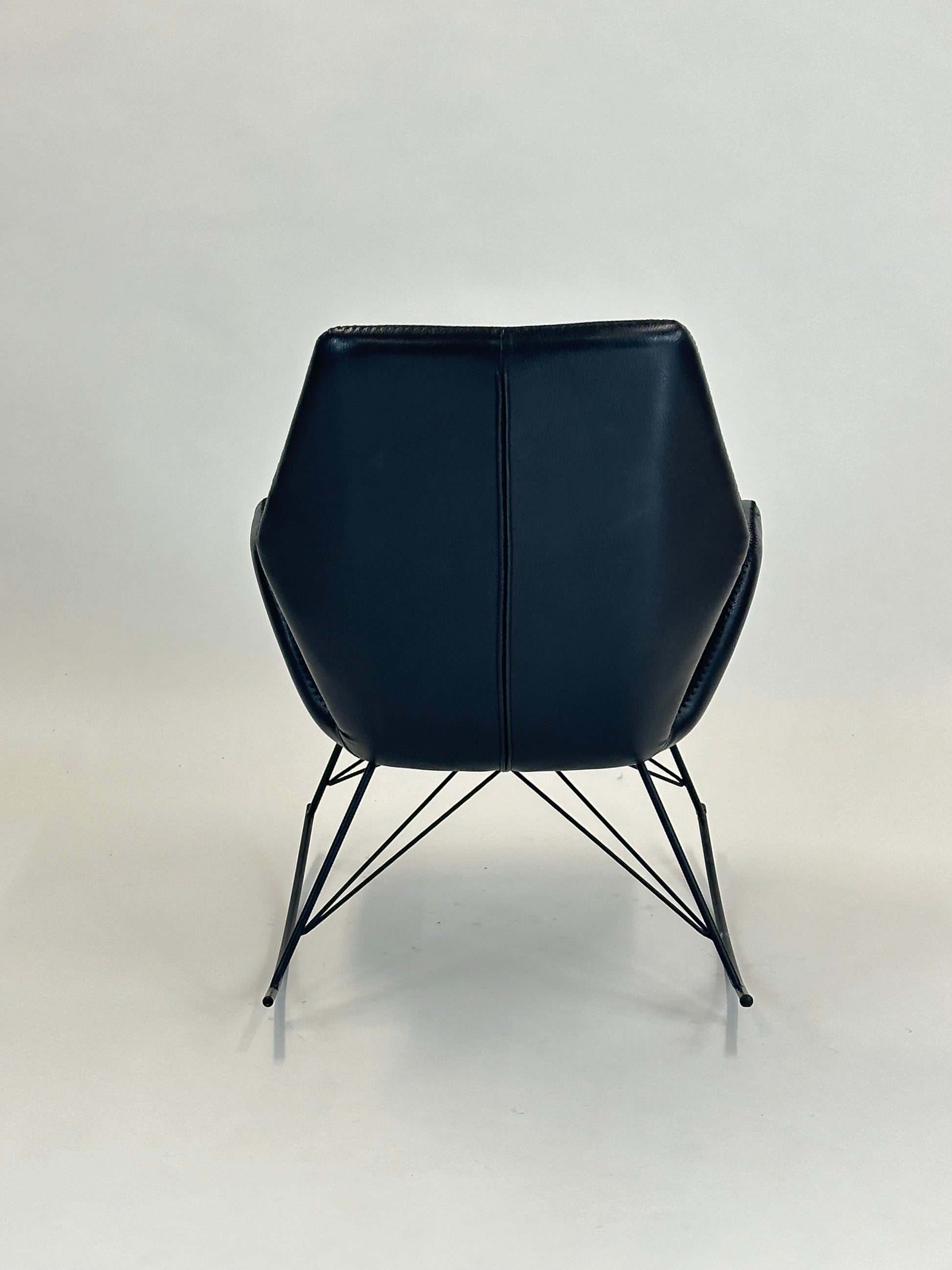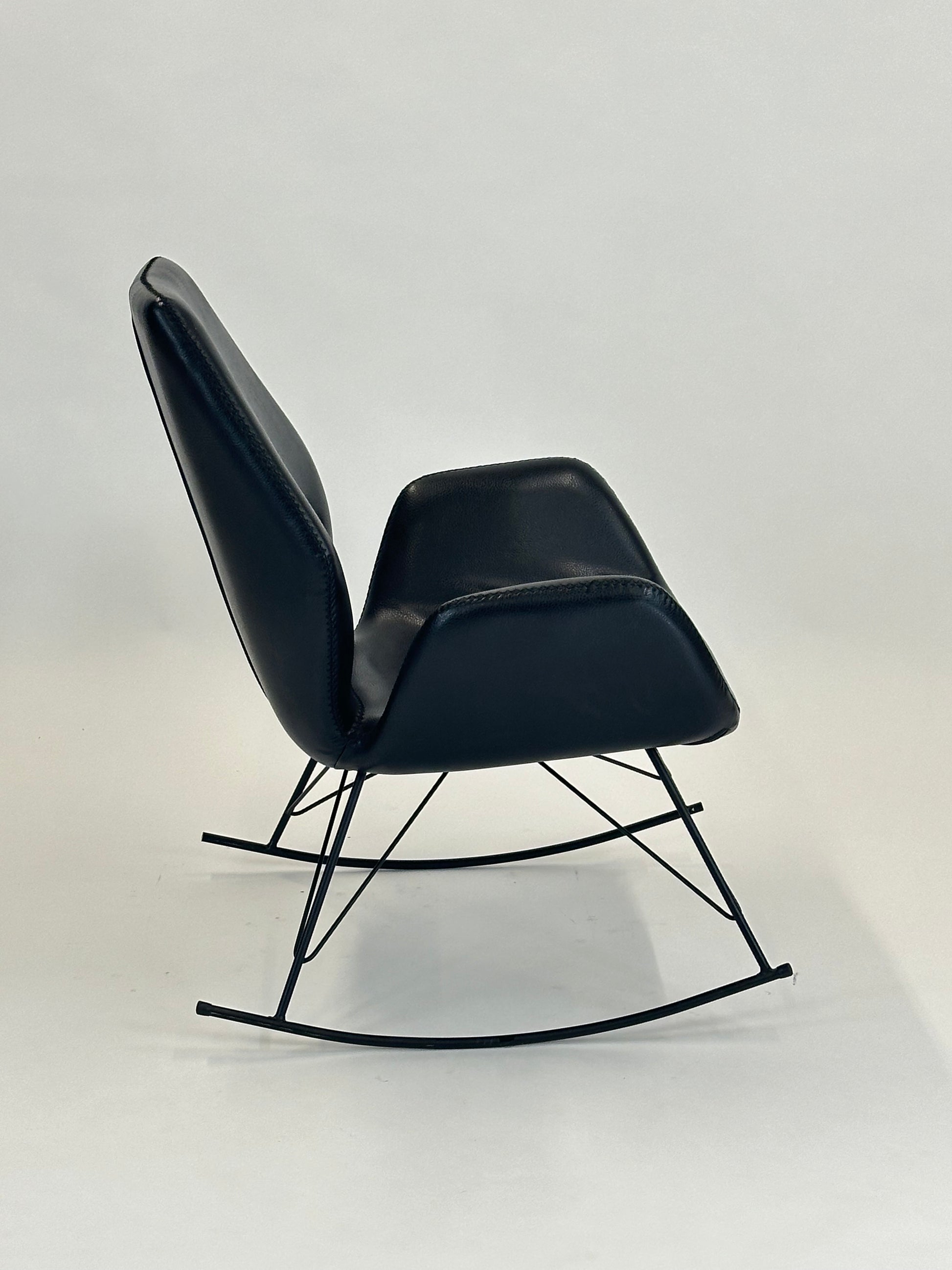 Sædet er polstret i sort kunstlæder, som giver et eksklusivt og sofistikeret look, samtidig med at det er nemt at vedligeholde. Den geometrisk formede ryg og de bløde armlæn sikrer god støtte og komfort. Stellet er udført i sortlakeret stål med gyngemekanik, der skaber en behagelig, let bevægelse og giver stolen et unikt og dynamisk udtryk.