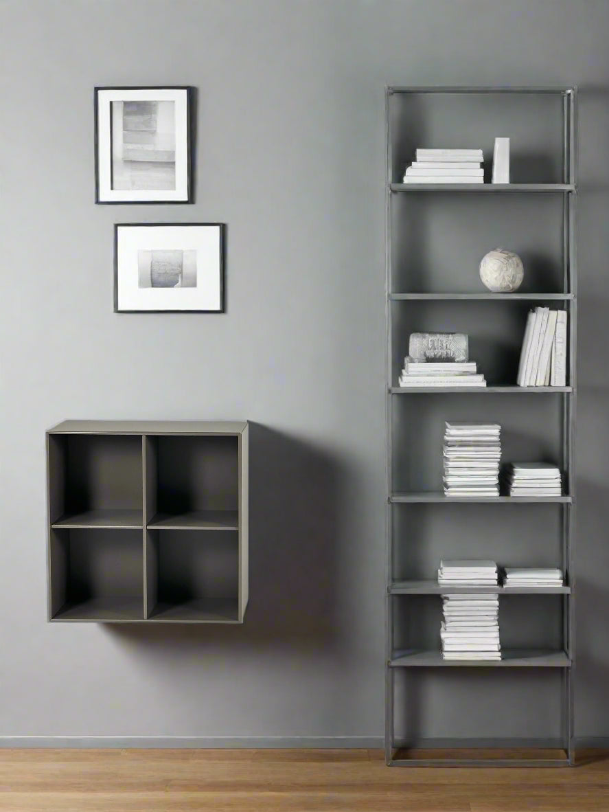 - Fleksibilitet: Kan bruges både stående på gulvet, monteret på væggen eller kombineres med ben eller hjul.