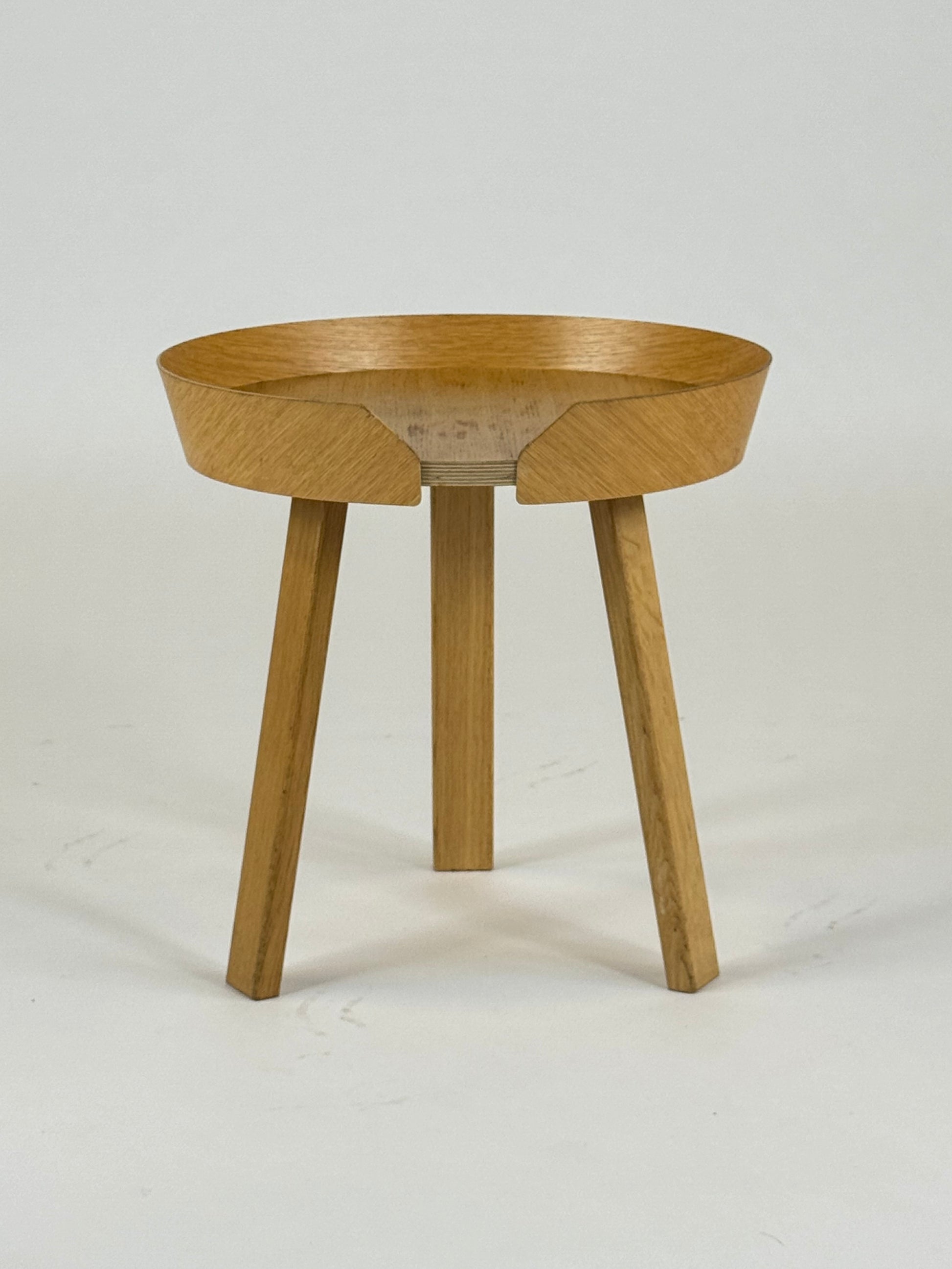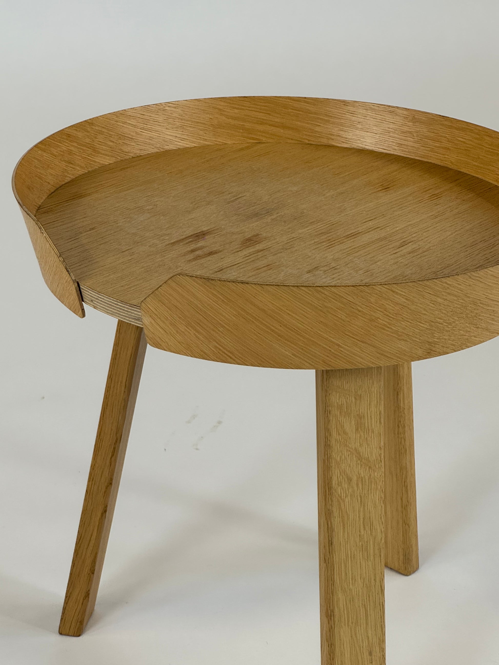 Around Table fra Muuto er designet af Thomas Bentzen og er et fint eksempel på moderne nordisk design, hvor funktionalitet og æstetik går hånd i hånd. Denne version med en diameter på 45 cm er den mindste i serien og egner sig perfekt som sidebord ved sofaen, natbord i soveværelset eller som fleksibelt afsætningsmøbel i loungen. Bordet er udført i finer og massivt egetræ og kendetegnes af sin karakteristiske opadvendte kant, som både indrammer formen og forhindrer genstande i at glide af. De tre let skrånende ben giver bordet et stabilt, men legende udtryk. Med sin varme træfinish og enkle konstruktion tilfører Around Table et tidløst og indbydende element til enhver indretning.
