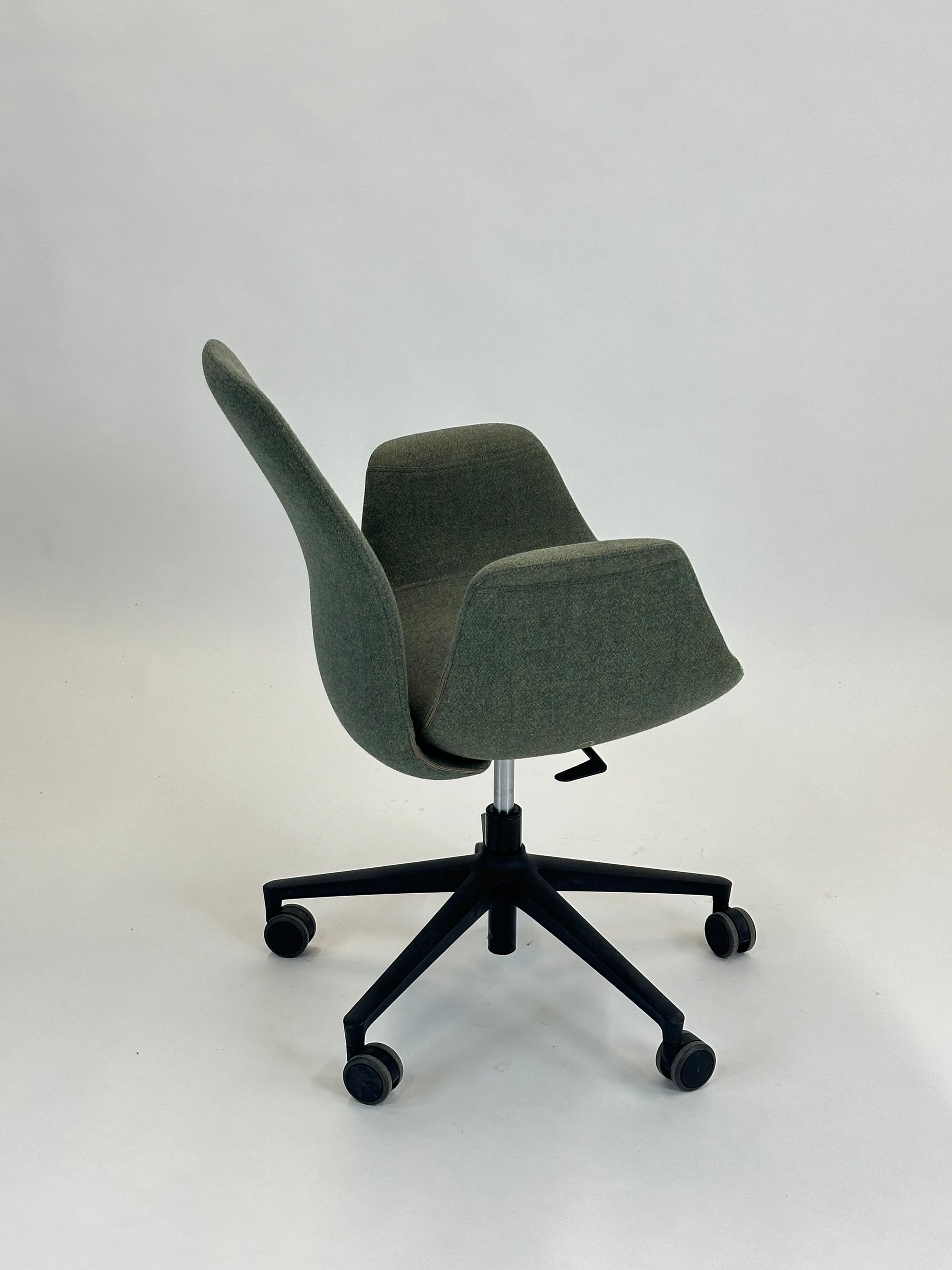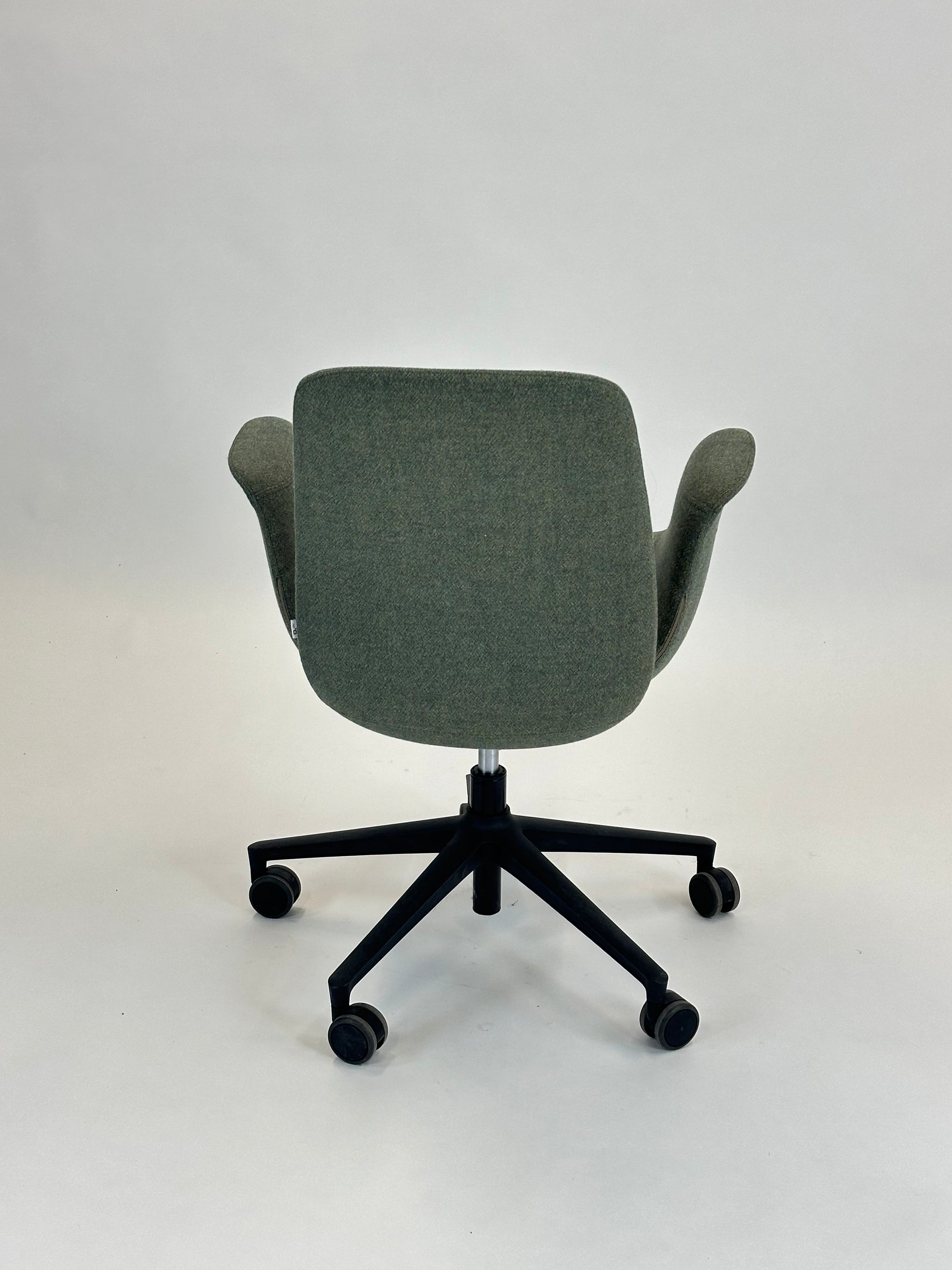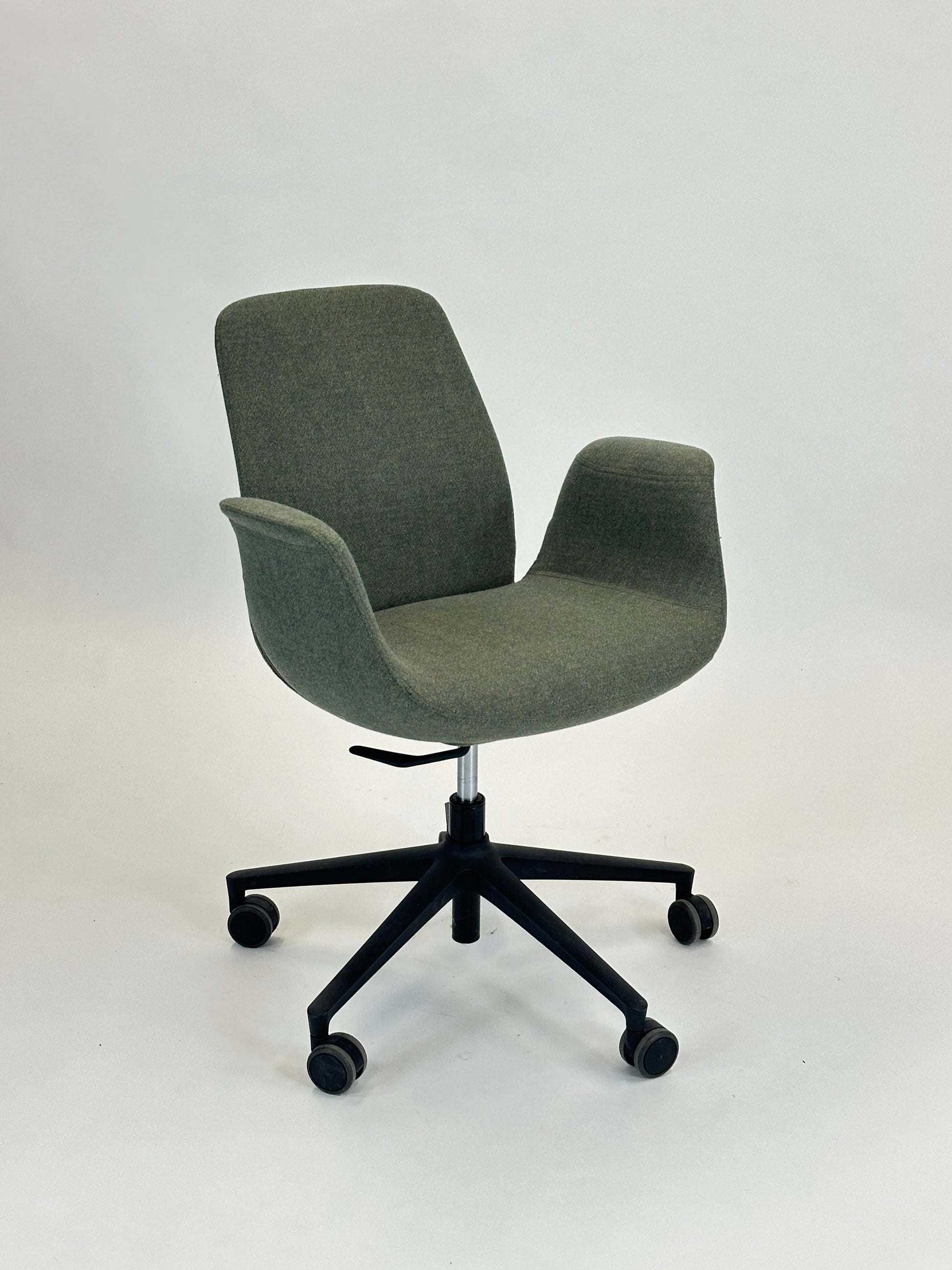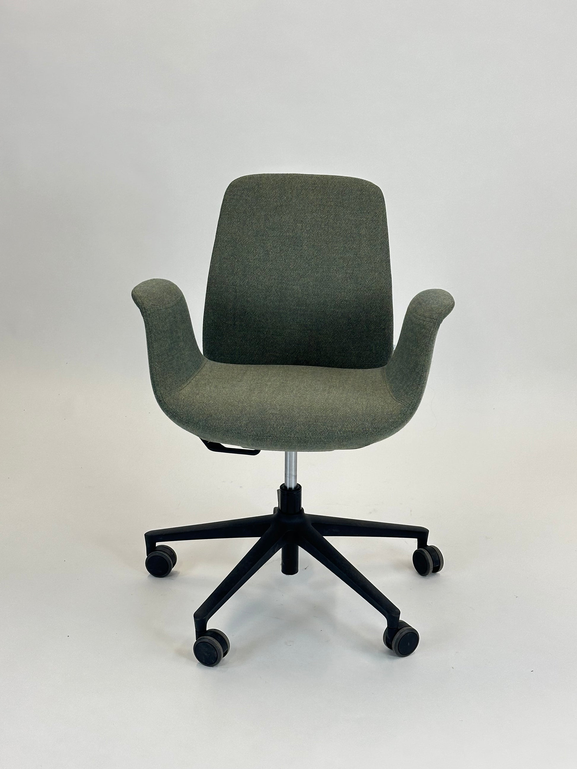 Stolen er polstret i et blødt, grågrønt tekstil, som giver et eksklusivt og behageligt udtryk, mens de integrerede armlæn sikrer ekstra komfort. Den er udstyret med et sort stel med femstjernet fodkryds og hjul, der gør stolen nem at bevæge sig rundt med. Højden kan justeres, så du kan tilpasse stolen til din arbejdsstilling og sikre den bedst mulige ergonomiske støtte.