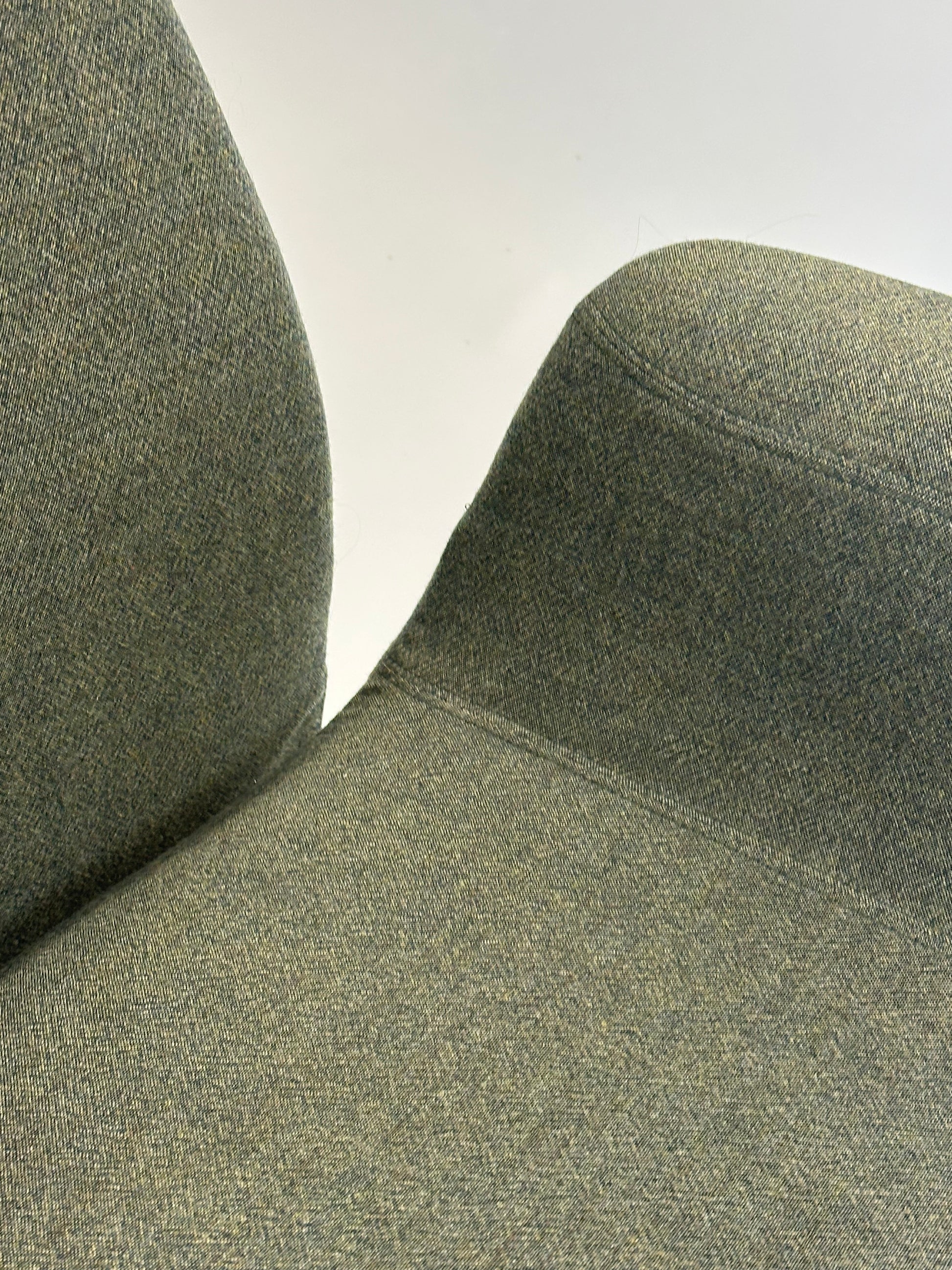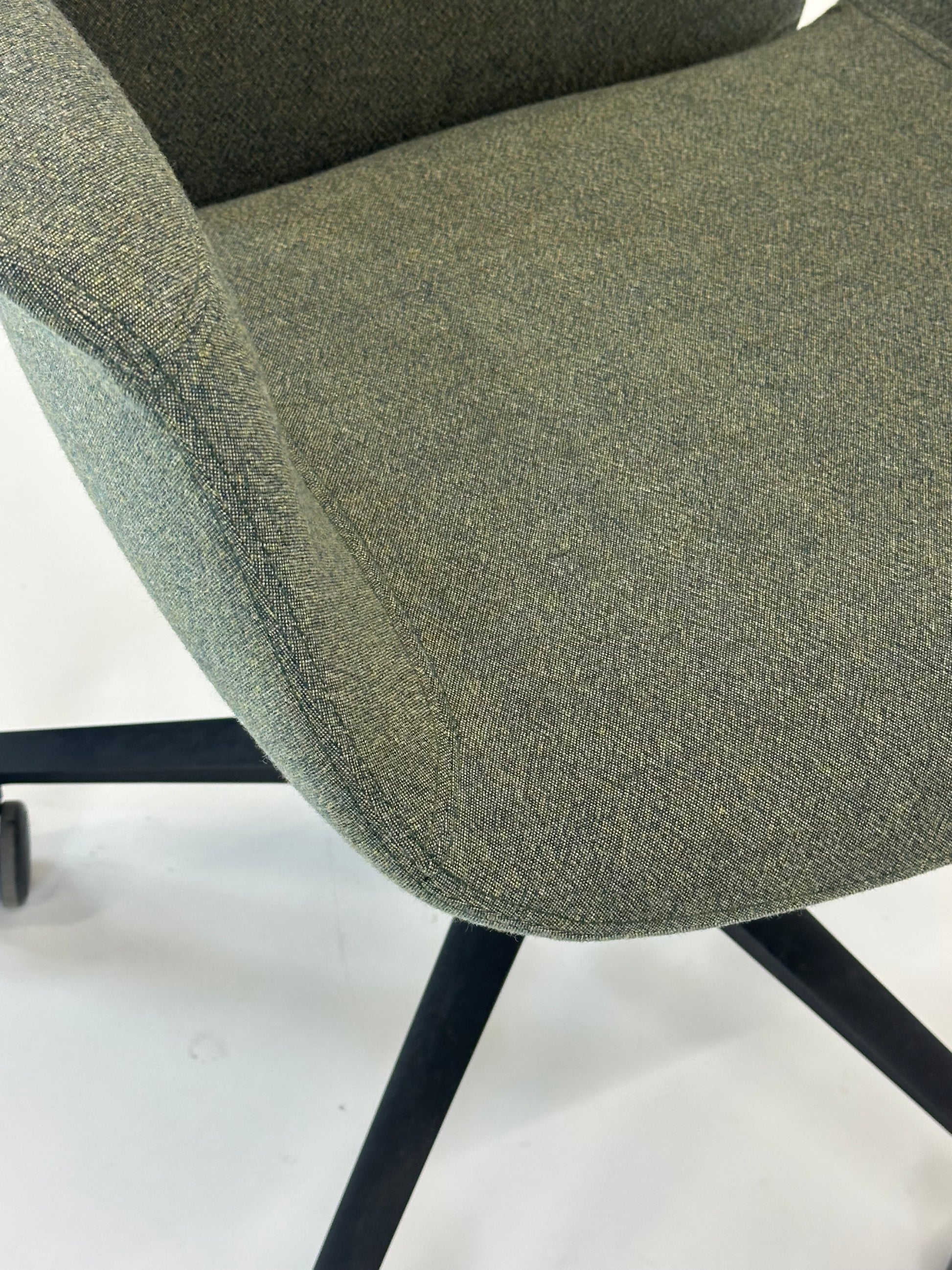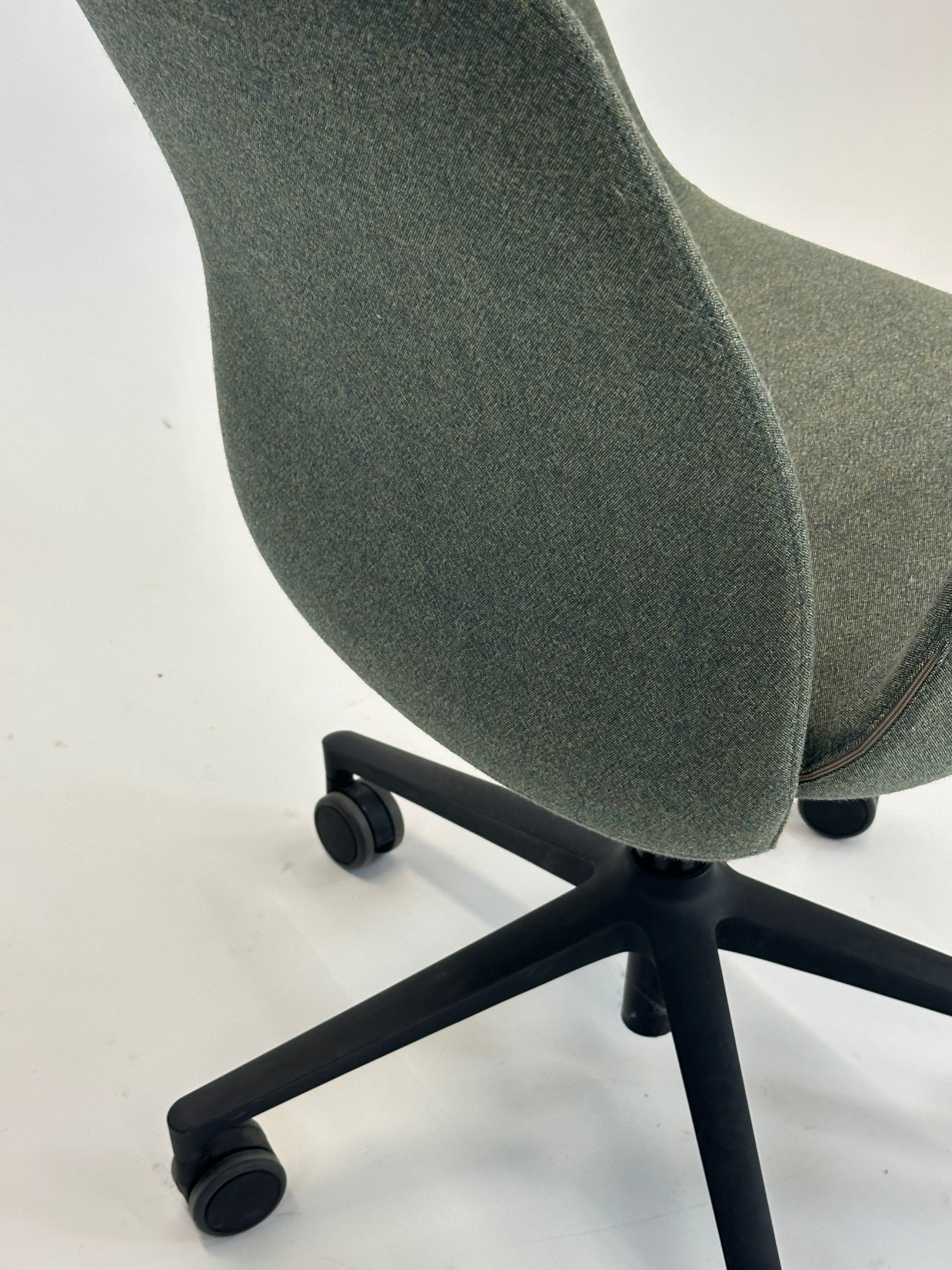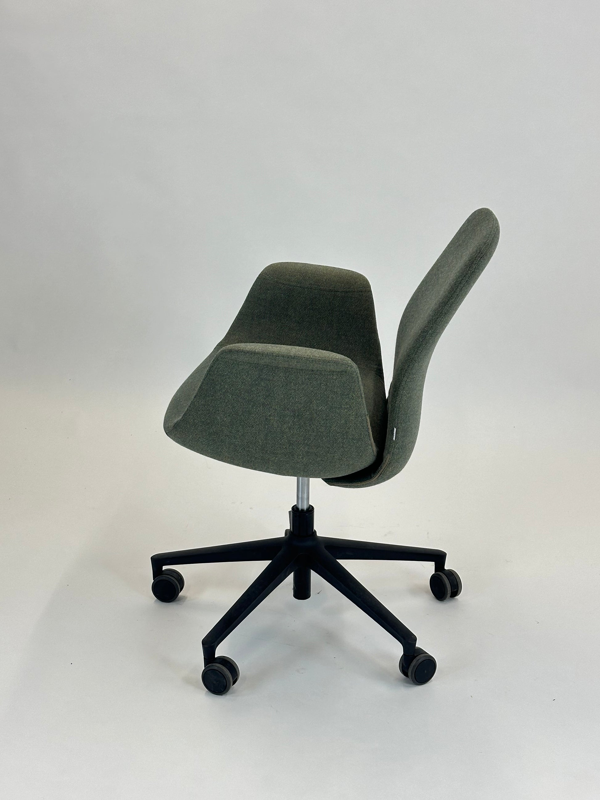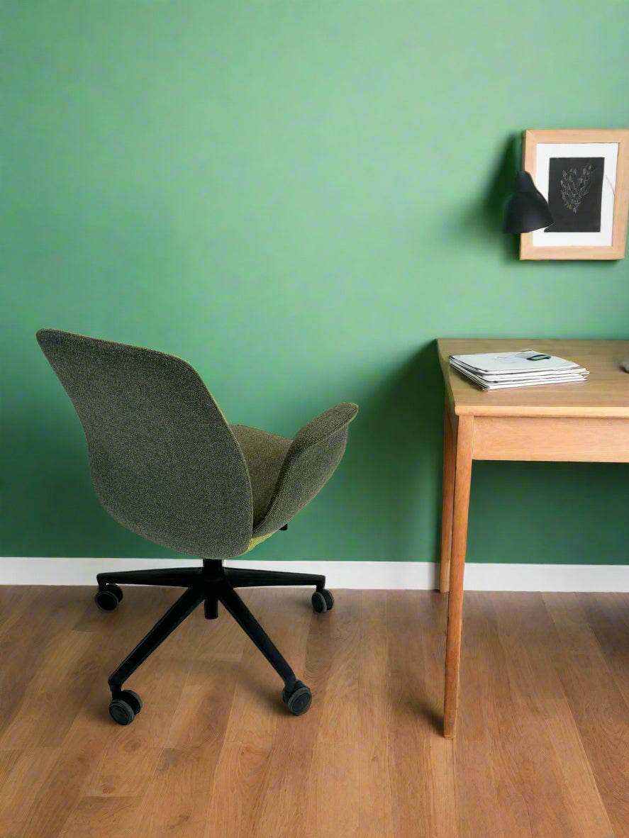 Stolen er polstret i et blødt, grågrønt tekstil, som giver et eksklusivt og behageligt udtryk, mens de integrerede armlæn sikrer ekstra komfort. Den er udstyret med et sort stel med femstjernet fodkryds og hjul, der gør stolen nem at bevæge sig rundt med. Højden kan justeres, så du kan tilpasse stolen til din arbejdsstilling og sikre den bedst mulige ergonomiske støtte.