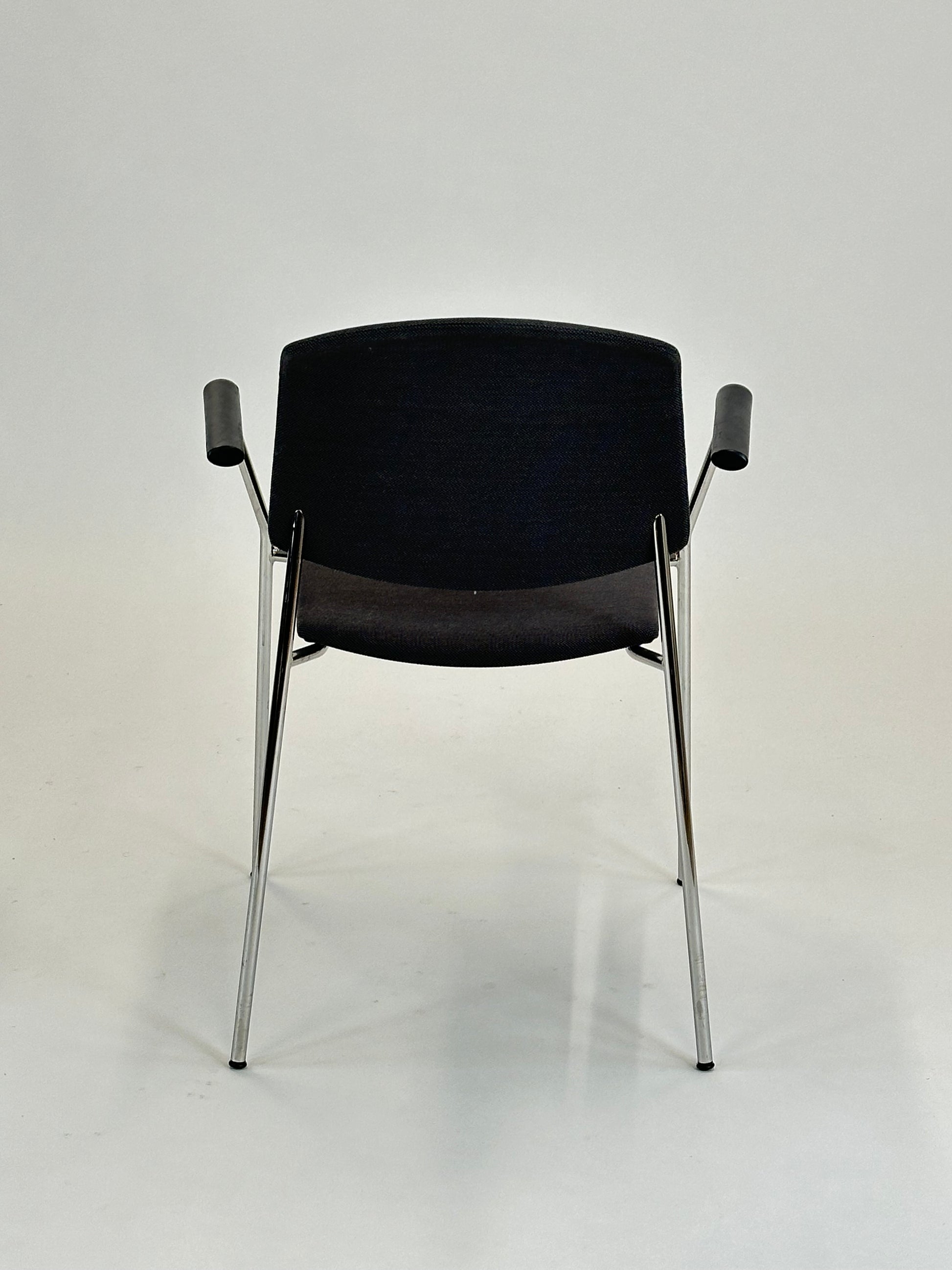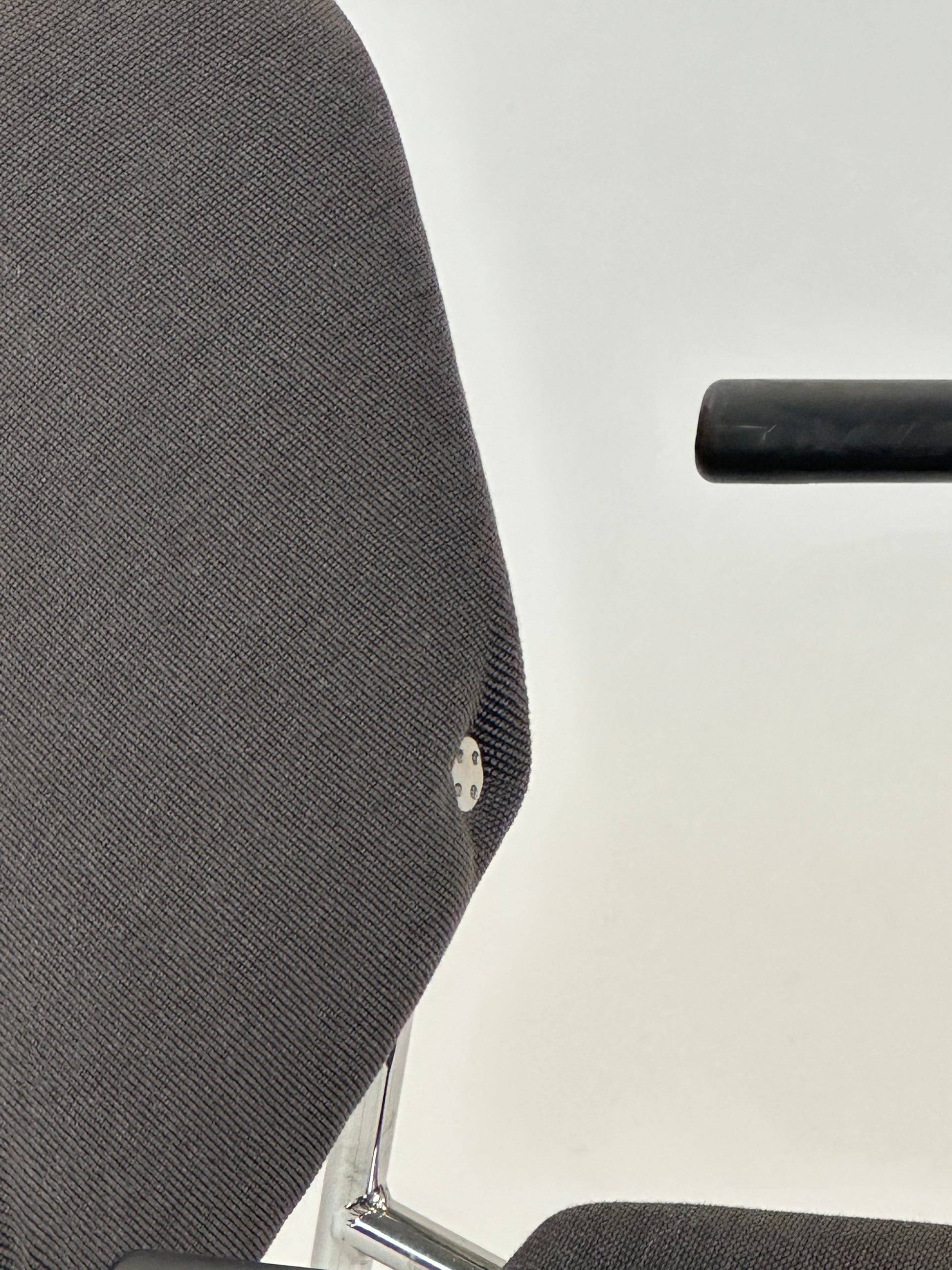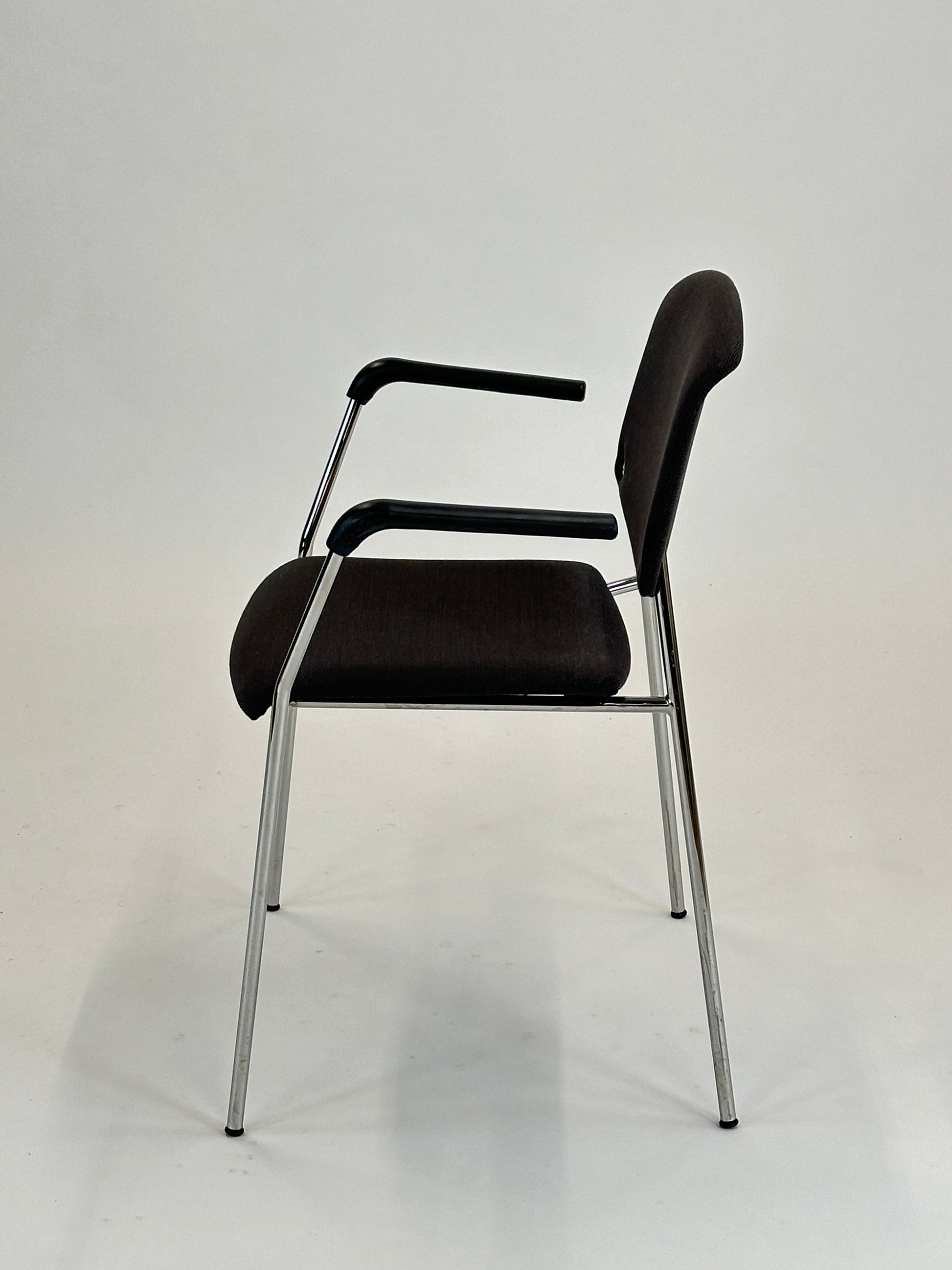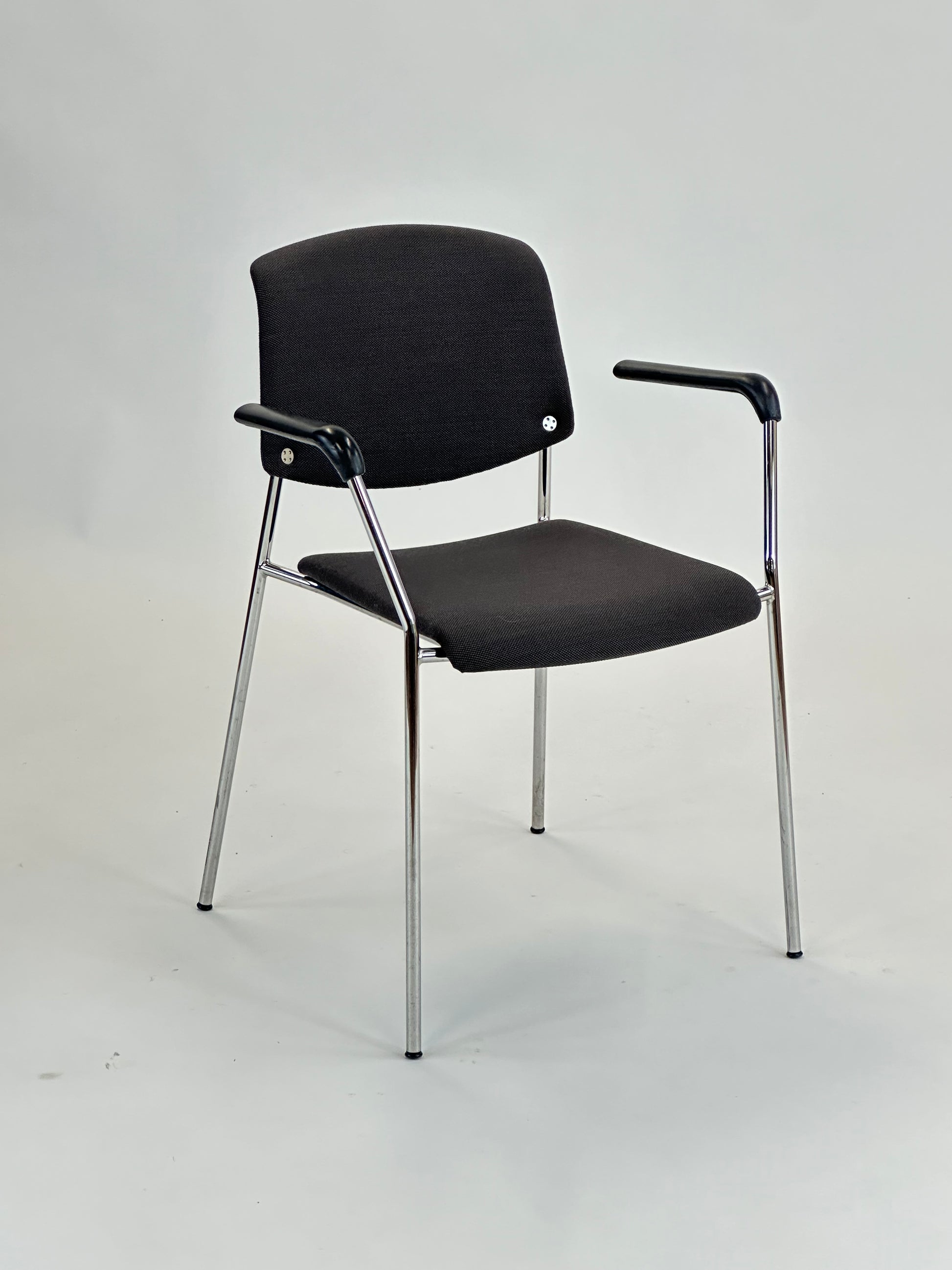 Stolen er polstret i slidstærkt mørkegråt tekstil, der giver en behagelig siddeoplevelse, mens ryglænet tilbyder god støtte til længere perioder af brug. Armlænene i sort plast giver ekstra komfort, og stellet i forkromet stål tilfører et elegant og moderne udtryk, samtidig med at det sikrer stabilitet og lang levetid.