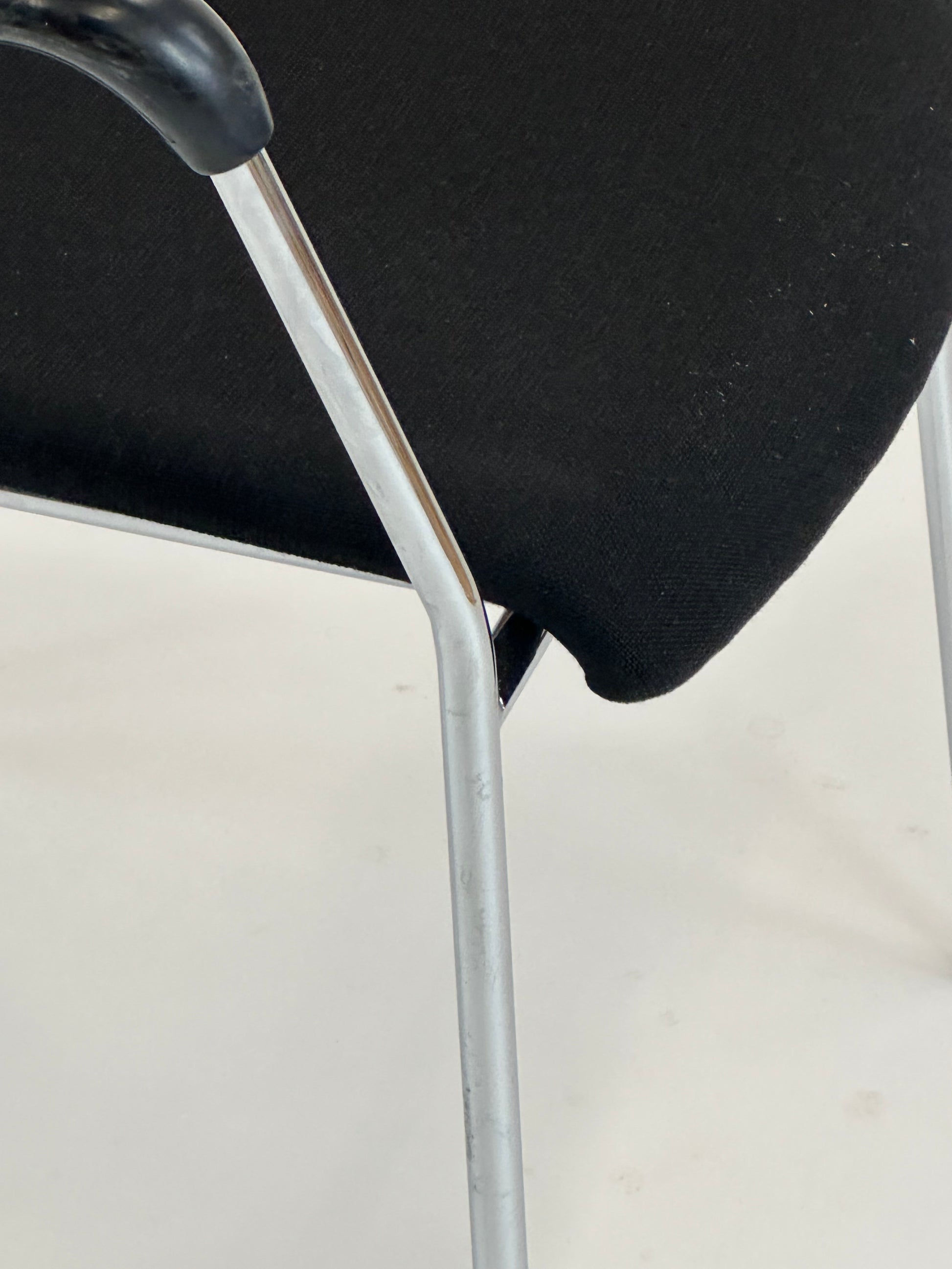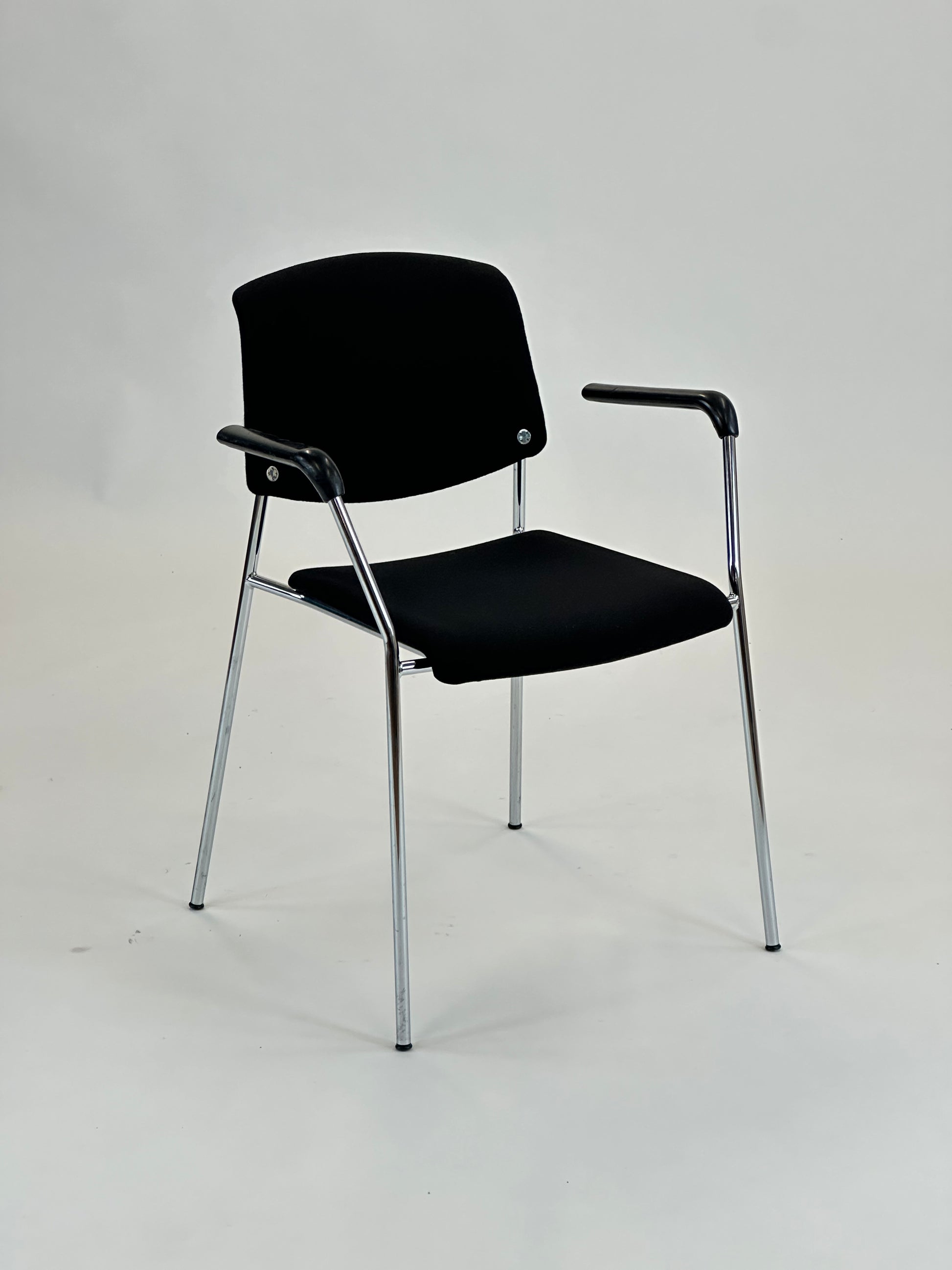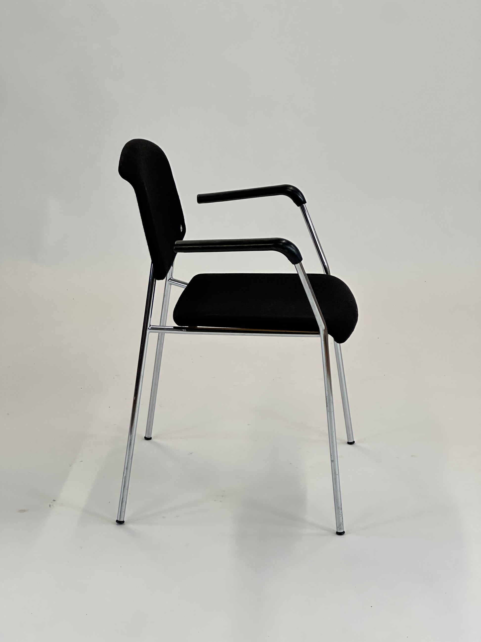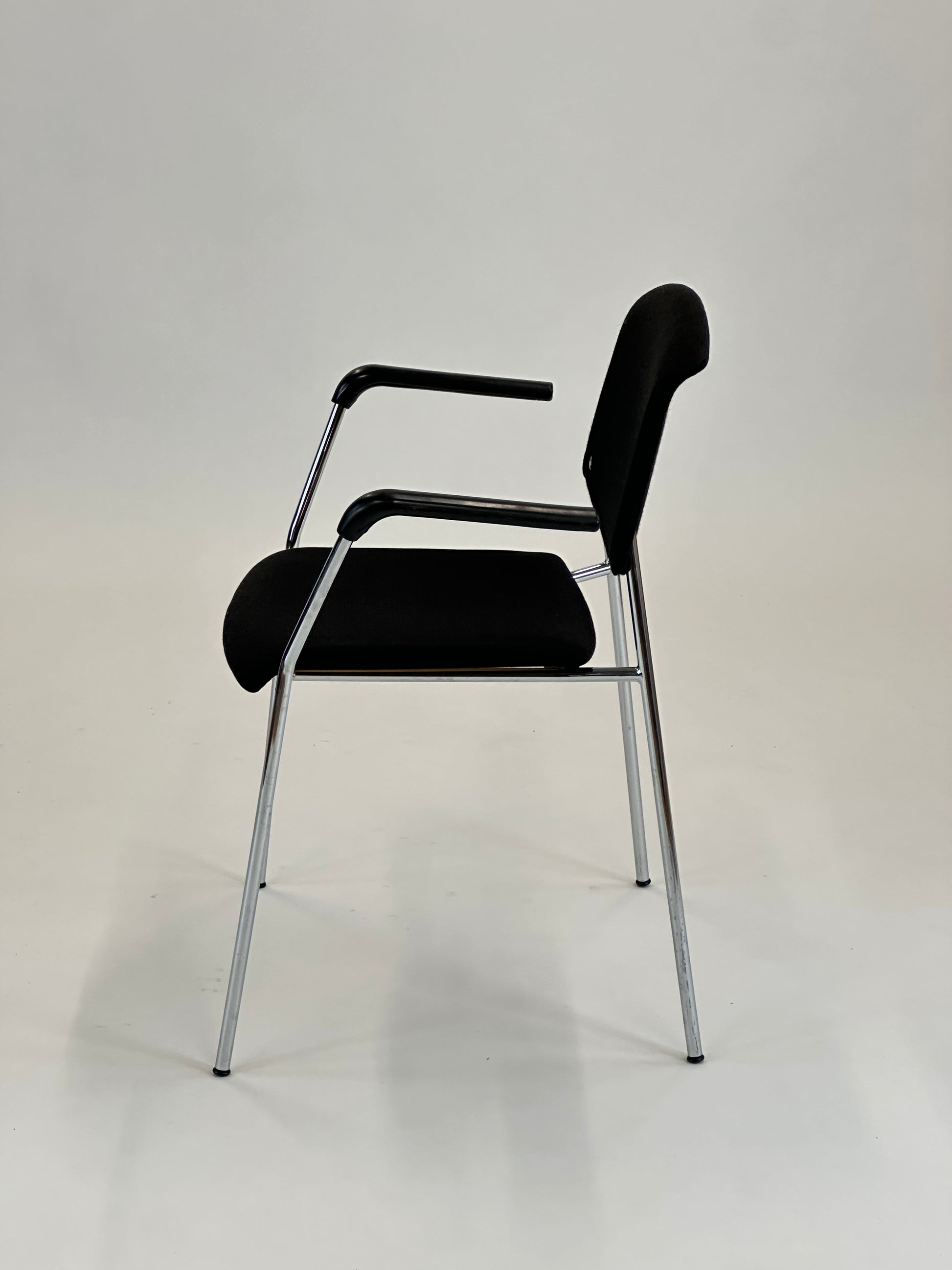 Stolen er polstret i slidstærkt sort tekstil, der giver en behagelig siddeoplevelse, mens ryglænet tilbyder god støtte til længere perioder af brug. Armlænene i sort plast giver ekstra komfort, og stellet i forkromet stål tilfører et elegant og moderne udtryk, samtidig med at det sikrer stabilitet og lang levetid.