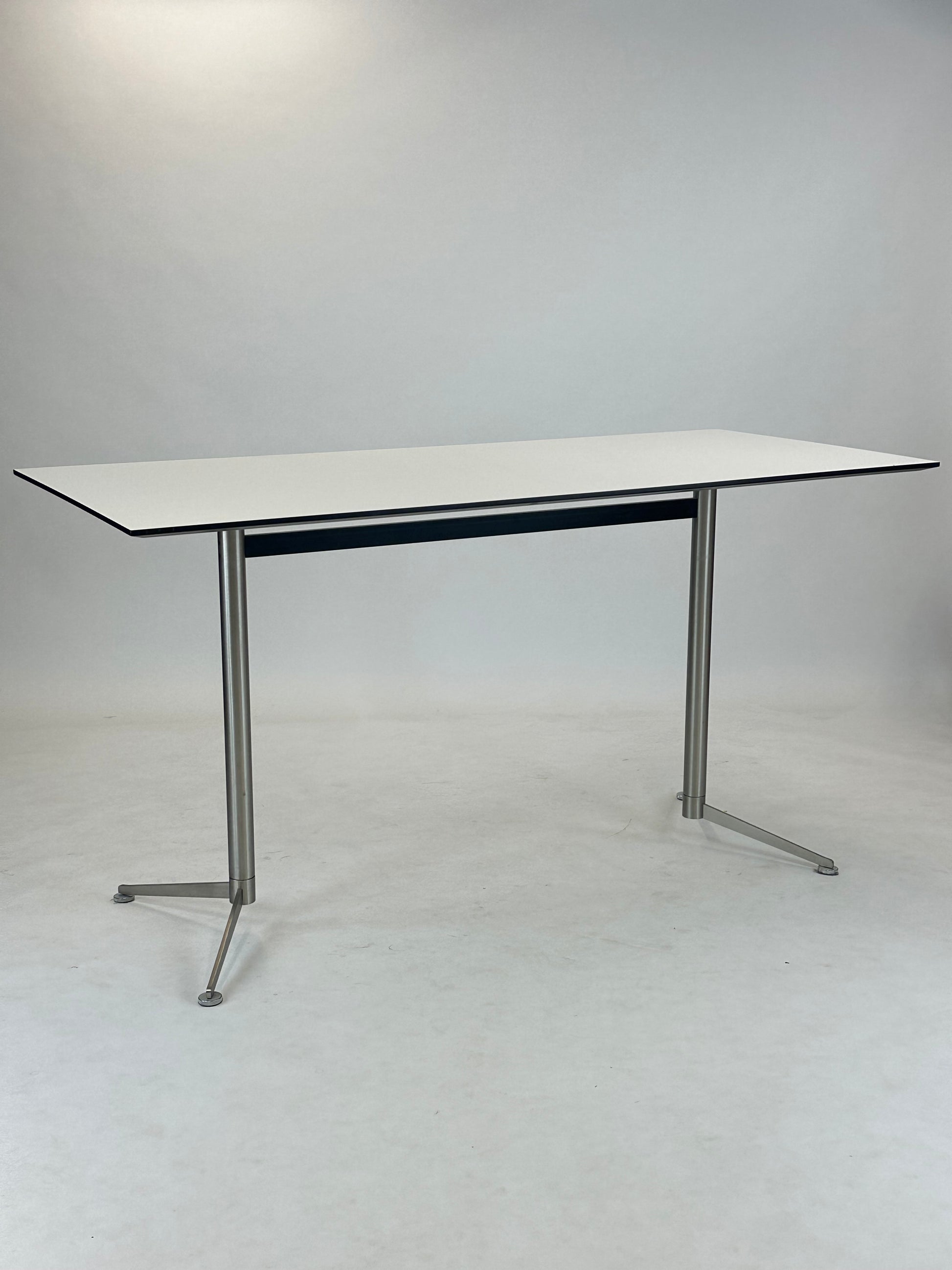 Dette højbord fra Paustians Spinal-serie forener klassisk dansk design med funktionel lethed. Med sin slanke bordplade og børstede stålstel er bordet et oplagt valg til uformelle mødezoner, kantiner eller stående arbejdsstationer.