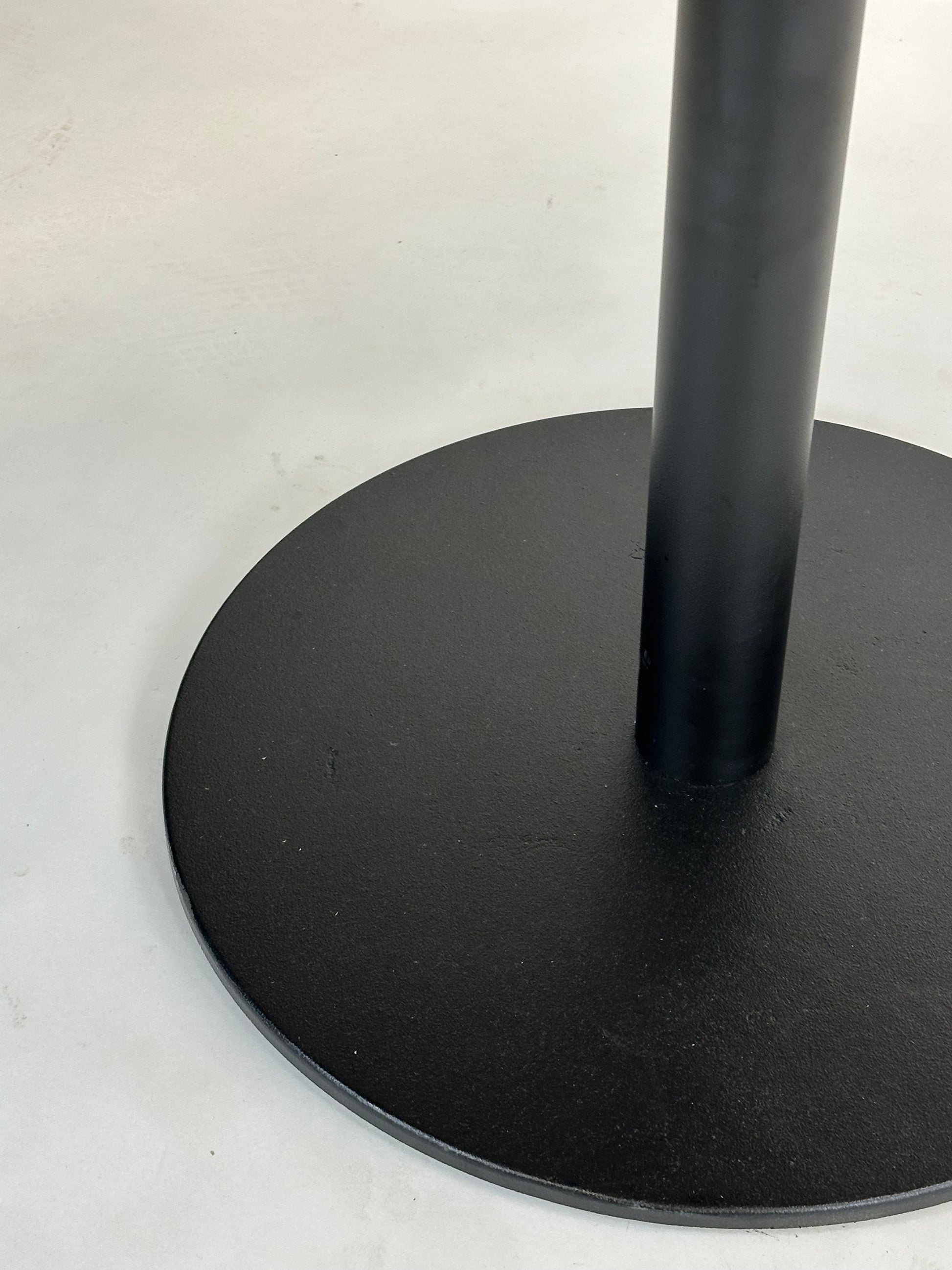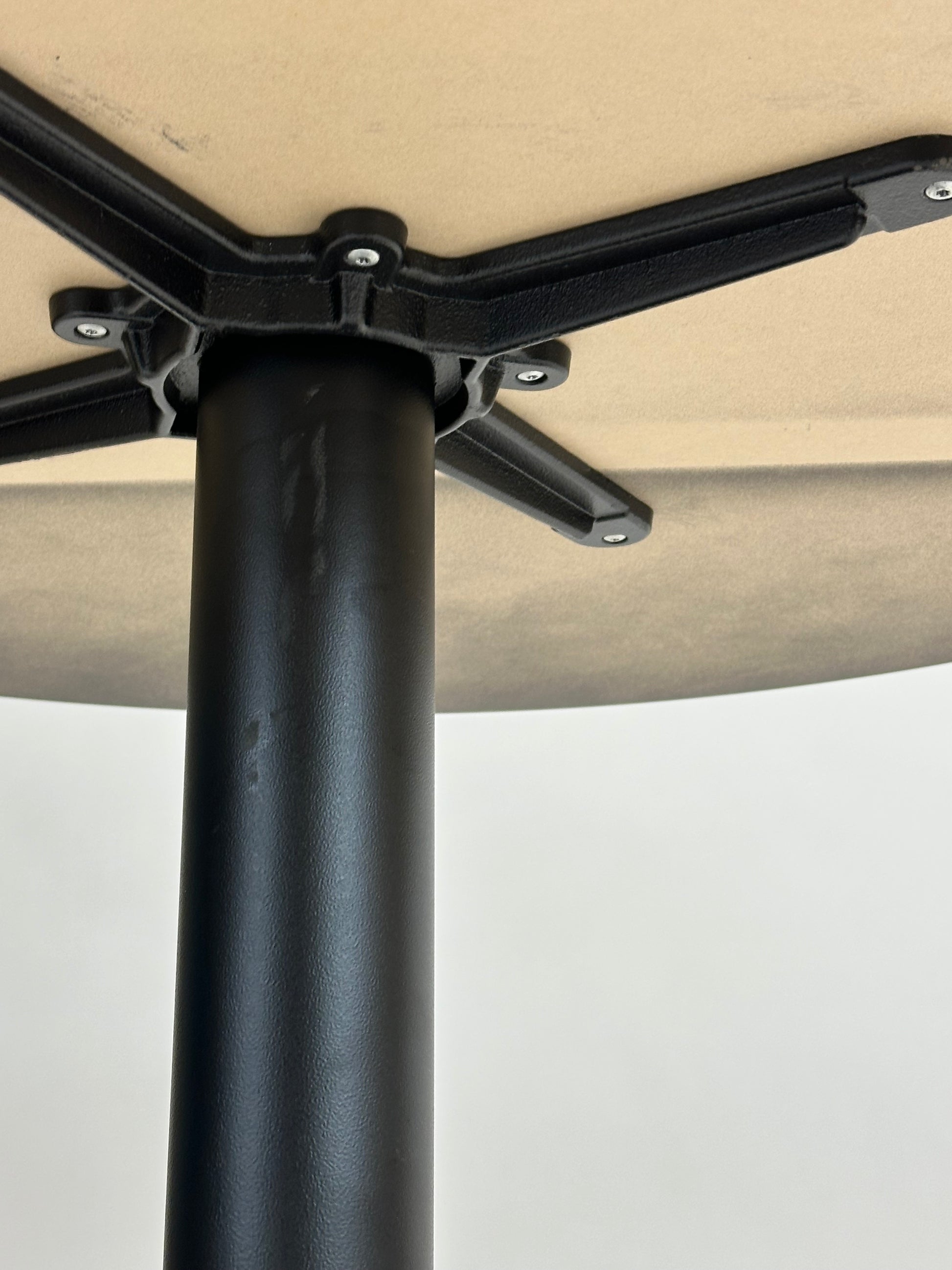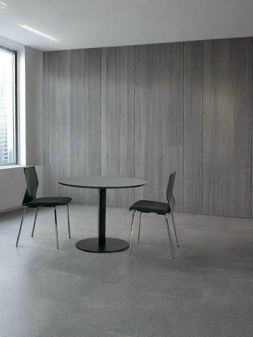 Bordpladen er grå med en slank profil, der giver bordet et stilrent og professionelt udtryk. Den enkle søjlebase og den runde fod i sortlakeret metal sikrer stabilitet og balance uden at dominere rummet visuelt. Designet passer perfekt ind i kontormiljøer, møderum, kantiner eller kreative arbejdszoner.