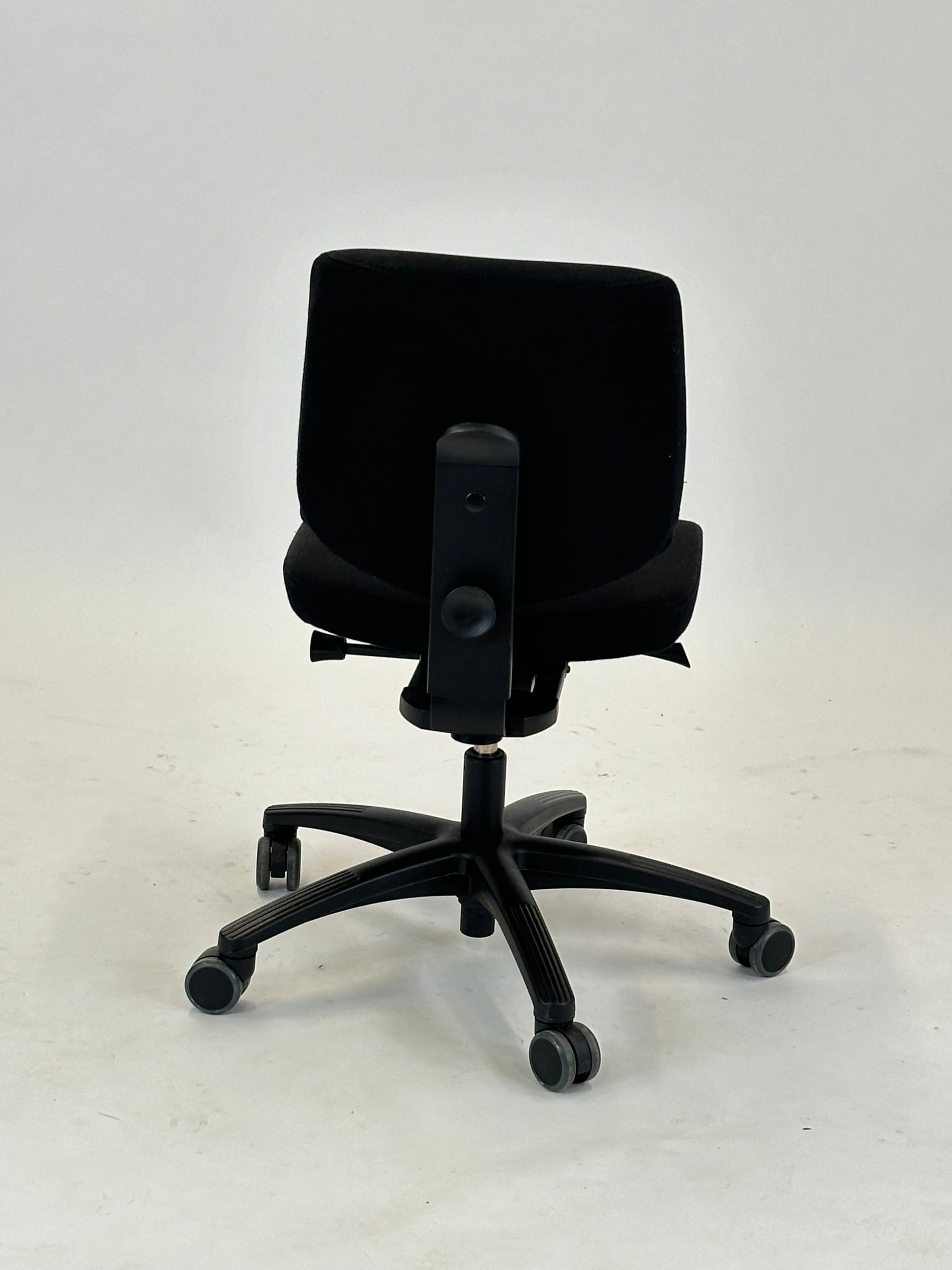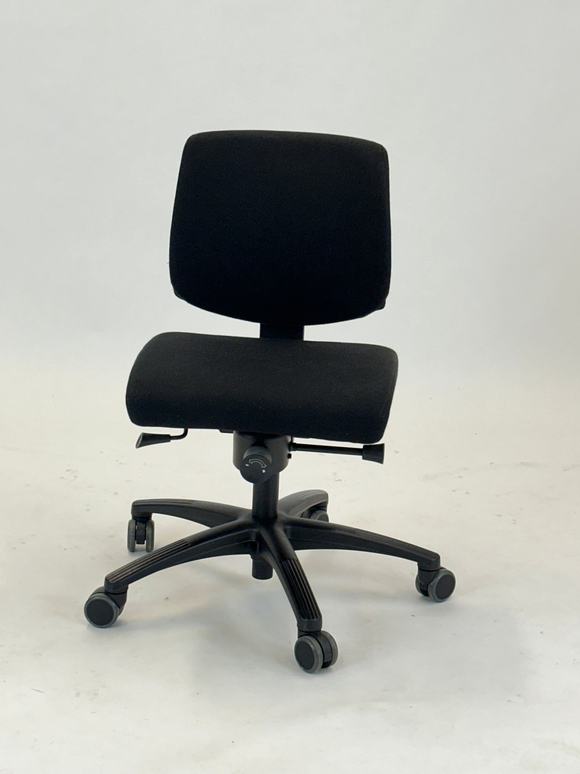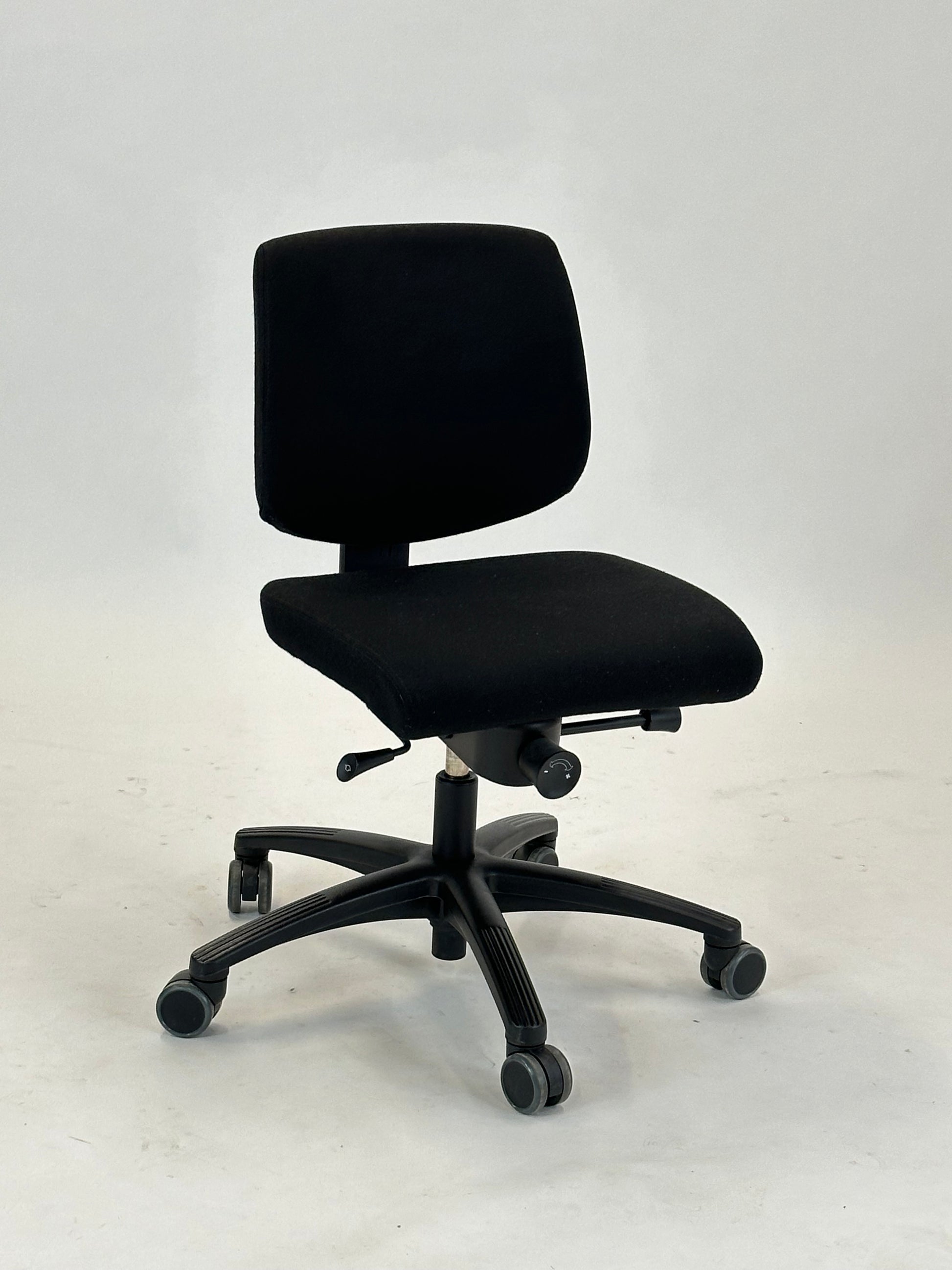 Sædet og ryglænet er polstret med slidstærkt sort stof, der giver en behagelig og støttende siddeoplevelse gennem hele arbejdsdagen. Stolen er udstyret med justeringsmuligheder for højde og ryg, hvilket gør det nemt at tilpasse stolen til den enkelte bruger og sikre korrekt ergonomi.