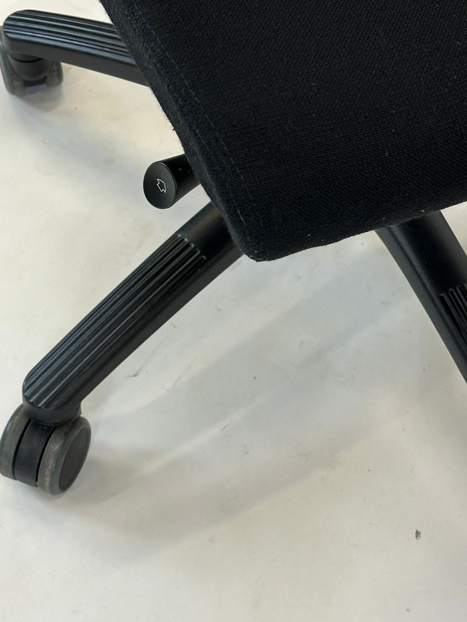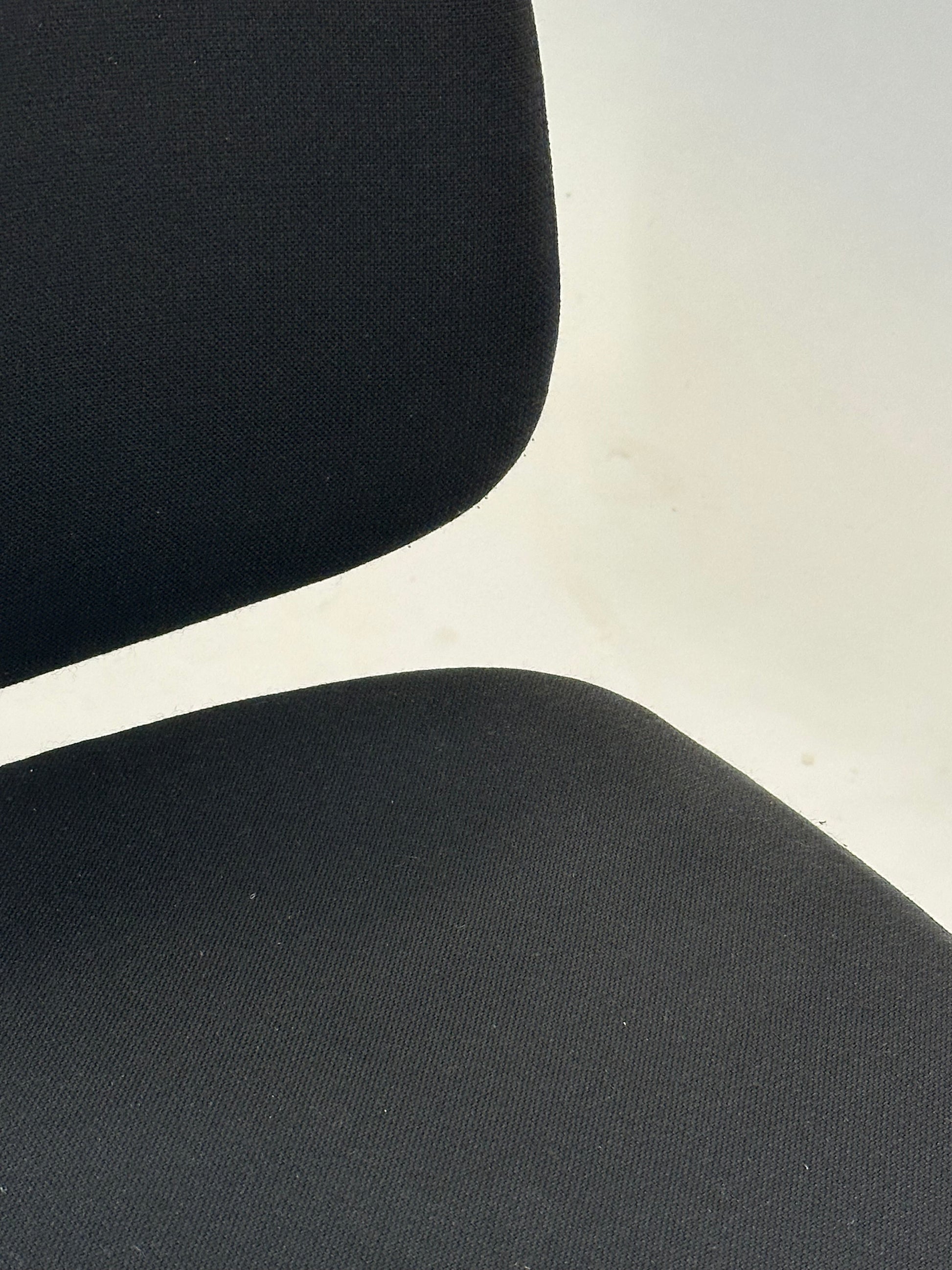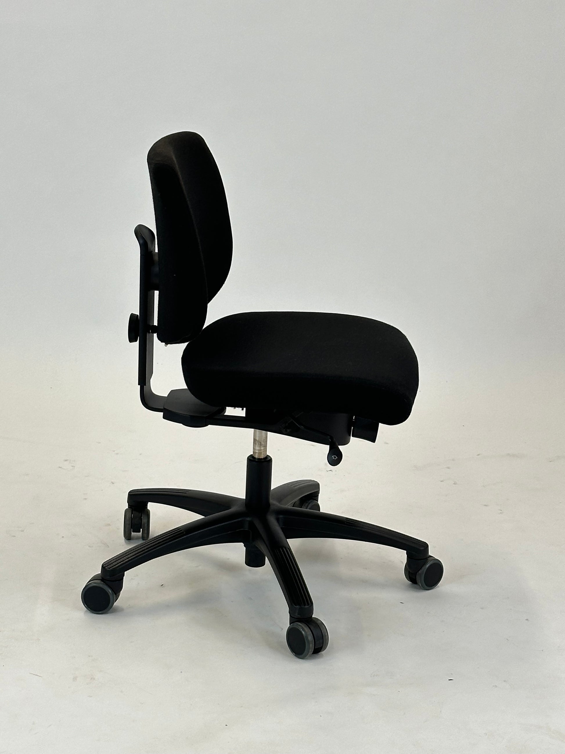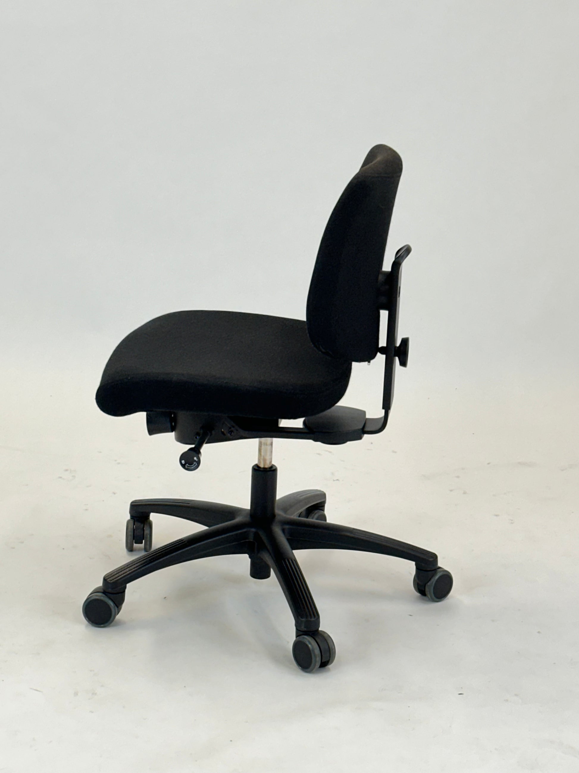 Sædet og ryglænet er polstret med slidstærkt sort stof, der giver en behagelig og støttende siddeoplevelse gennem hele arbejdsdagen. Stolen er udstyret med justeringsmuligheder for højde og ryg, hvilket gør det nemt at tilpasse stolen til den enkelte bruger og sikre korrekt ergonomi.