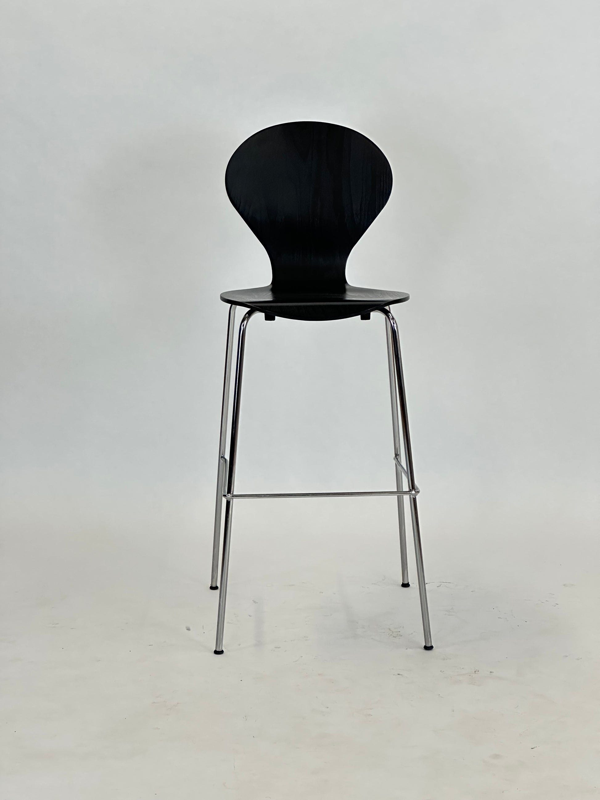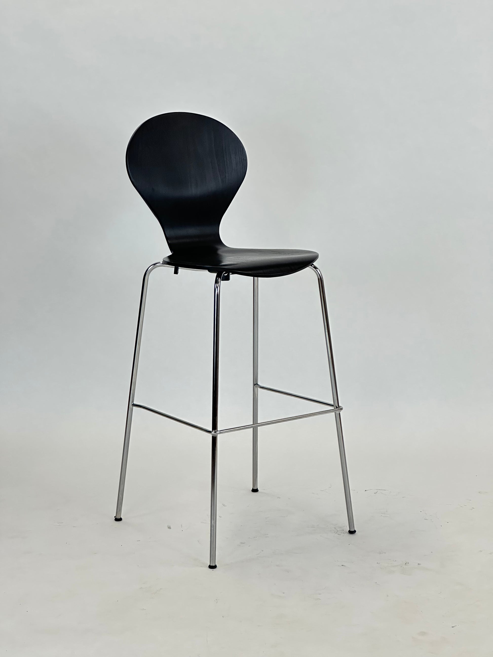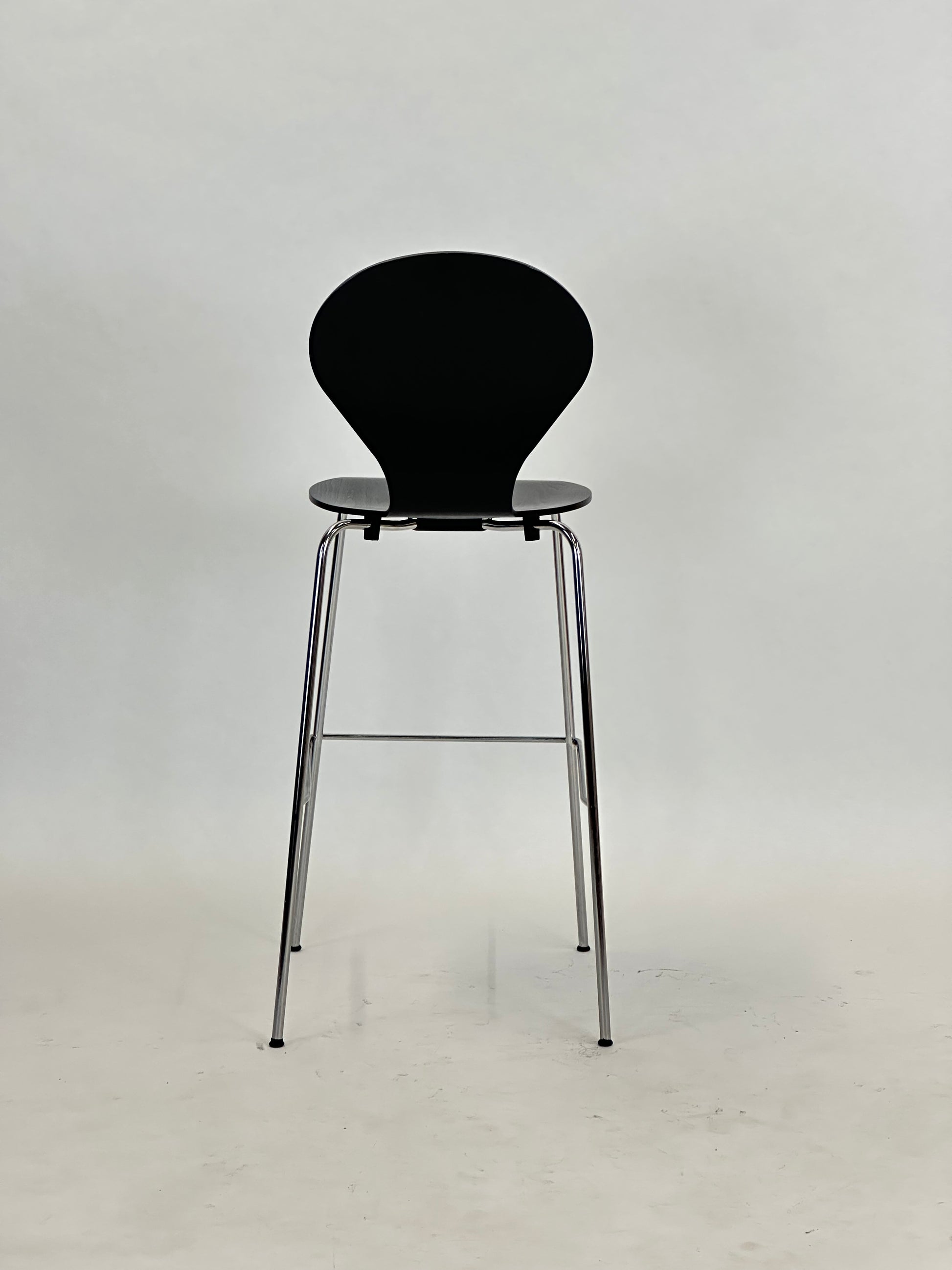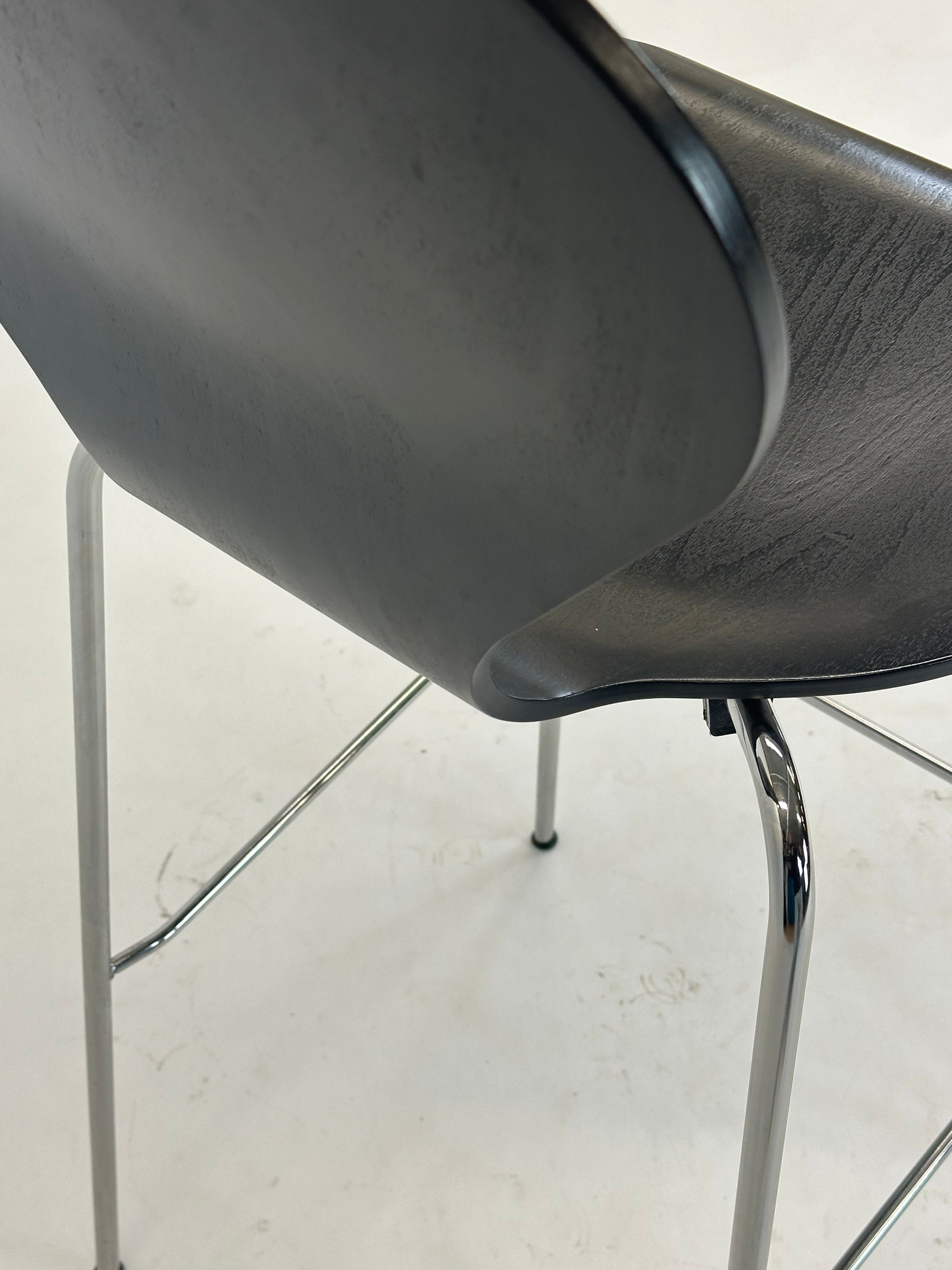 - Sæde: Det ikoniske, formpressede træsæde med sin karakteristiske runde ryg giver både visuel lethed og fremragende ergonomisk støtte. Den sorte finish tilføjer et tidløst og elegant udtryk.