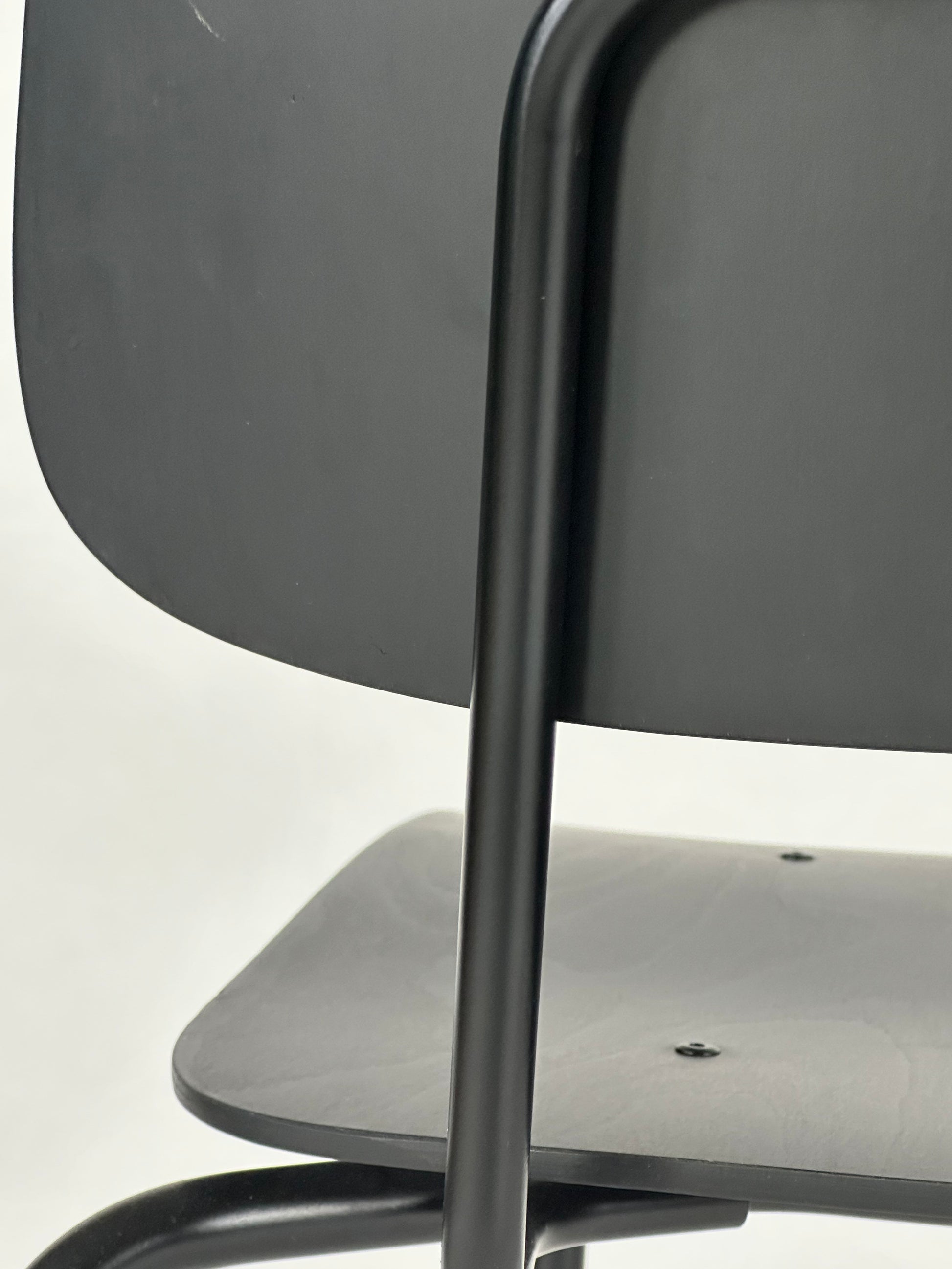 - Sæde & Ryg: Fremstillet i sortlakeret træfiner, der giver en elegant og klassisk finish. De diskrete skruedetaljer tilføjer et industrielt præg.
