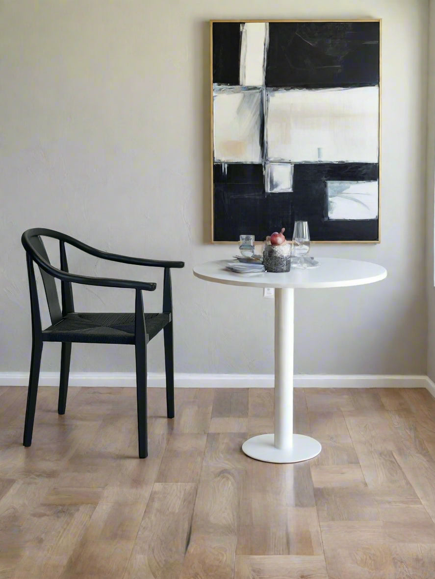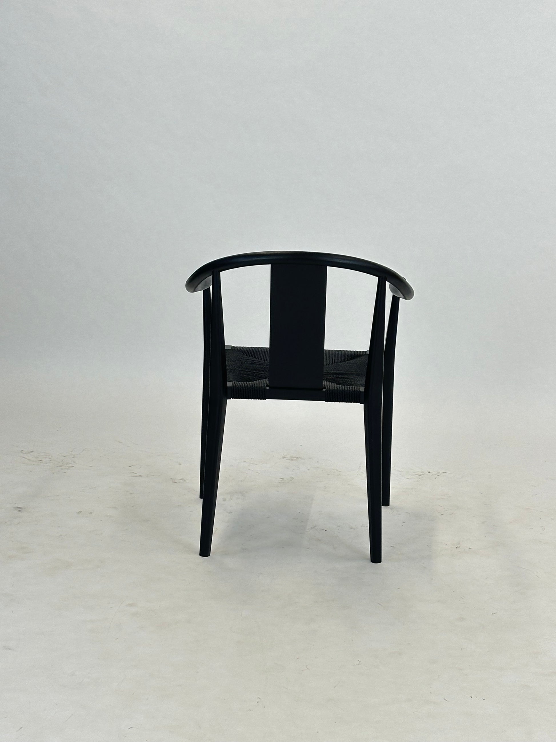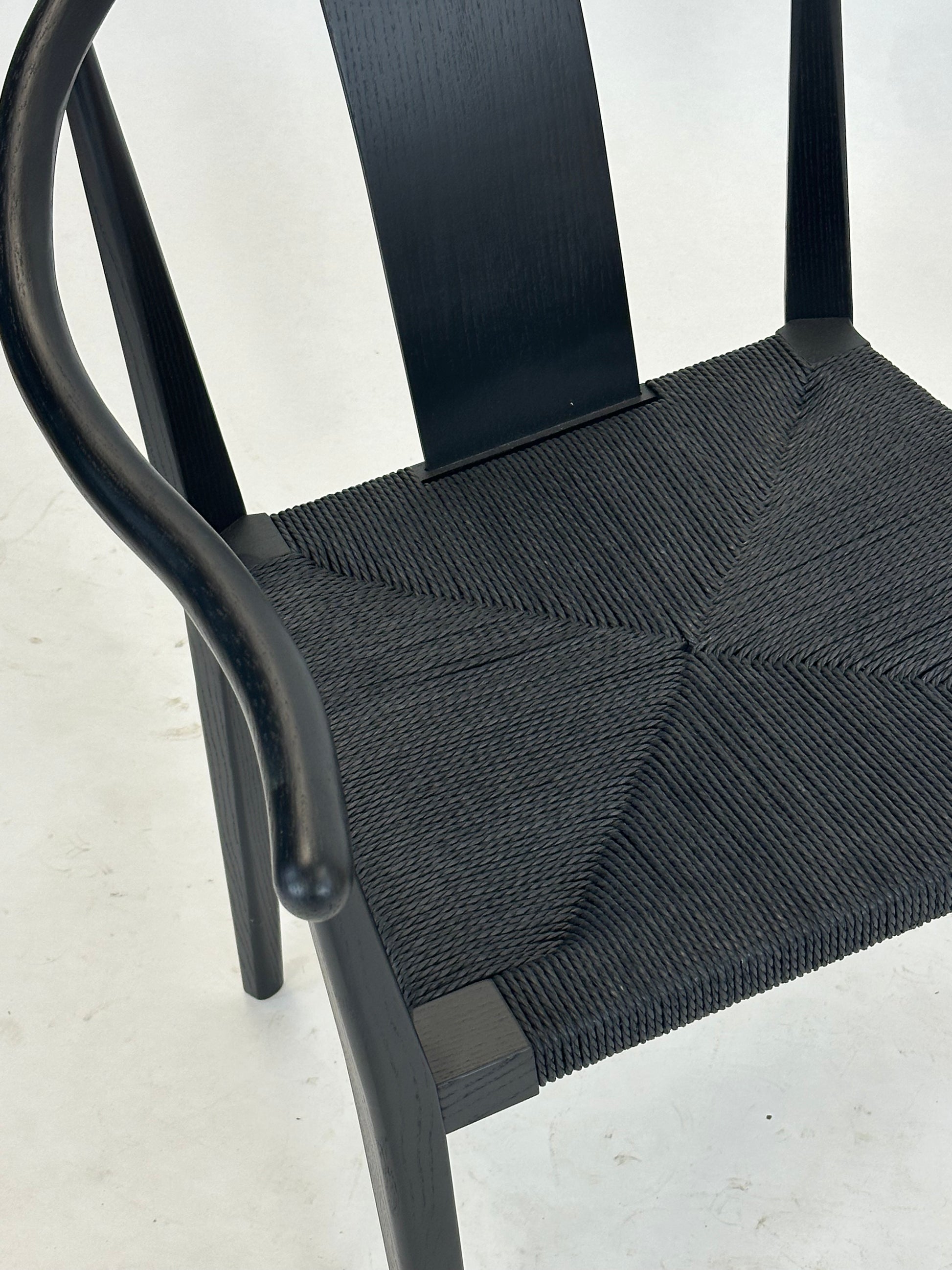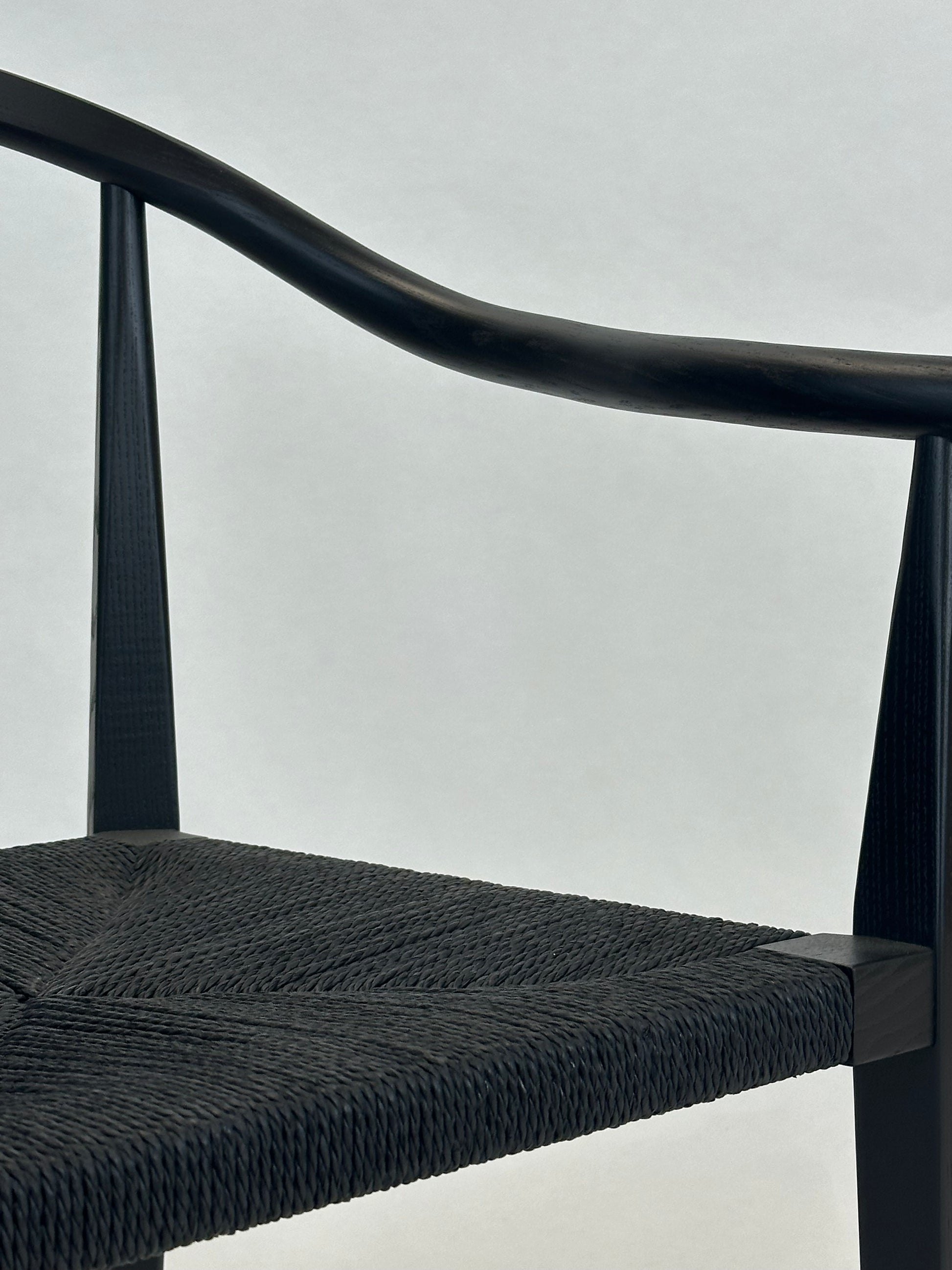 - Materiale: Stolen er fremstillet af massivt sort træ, hvilket sikrer en robust og holdbar konstruktion. Sædet er håndflettet med naturligt papirgarn, som giver både komfort og et æstetisk udtryk.