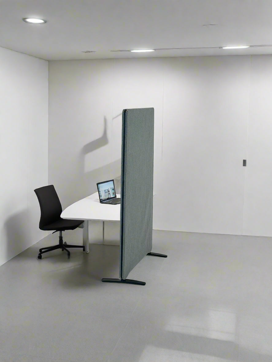 Denne elegante skærmvæg i gråt tekstil er en praktisk og æstetisk løsning til at skabe ro og struktur i åbne kontorlandskaber, mødelokaler eller fællesområder. Skærmvæggen fungerer både som visuel afskærmning og som akustisk dæmpning, hvilket gør den ideel i støjfølsomme arbejdsmiljøer.