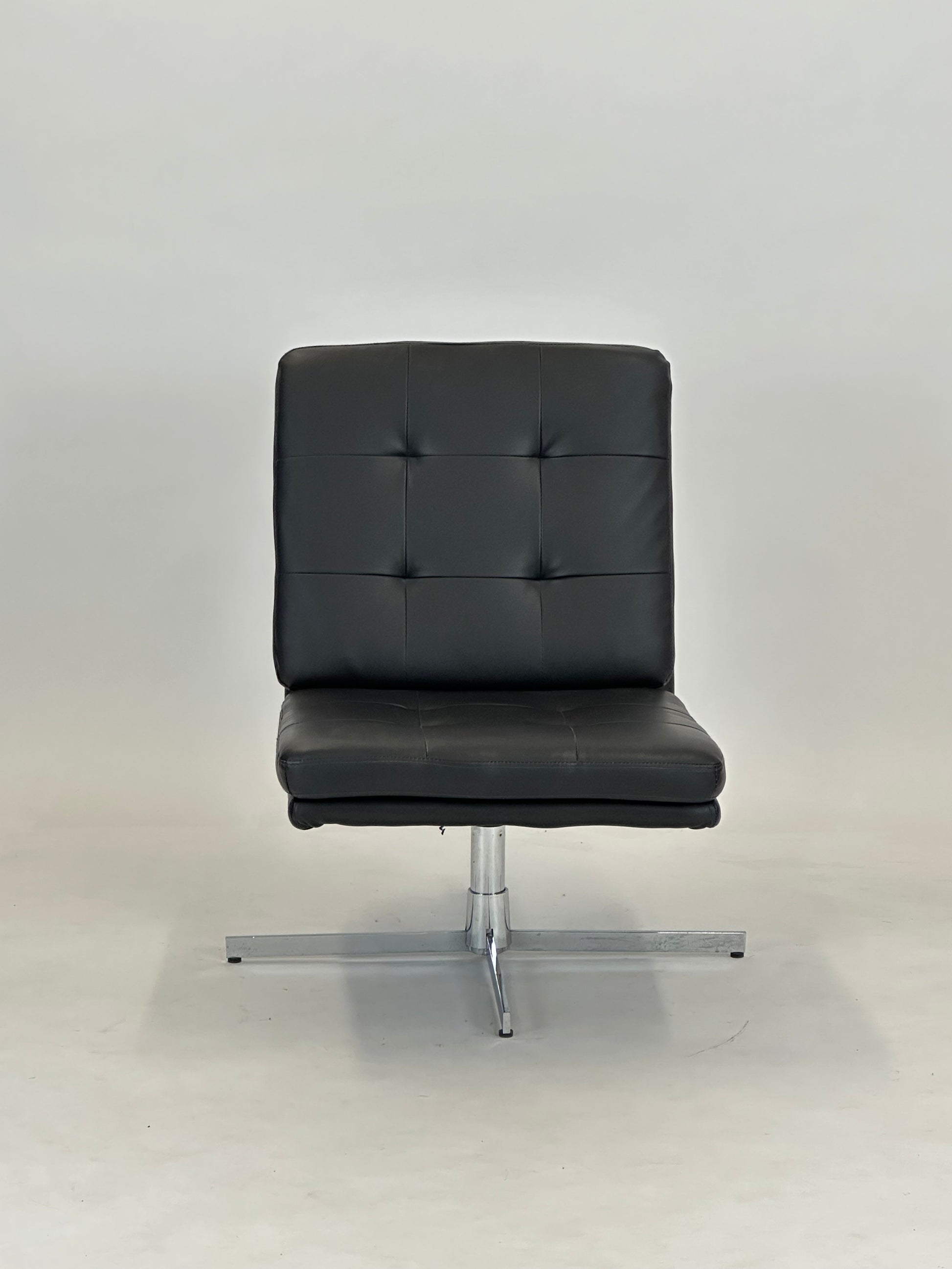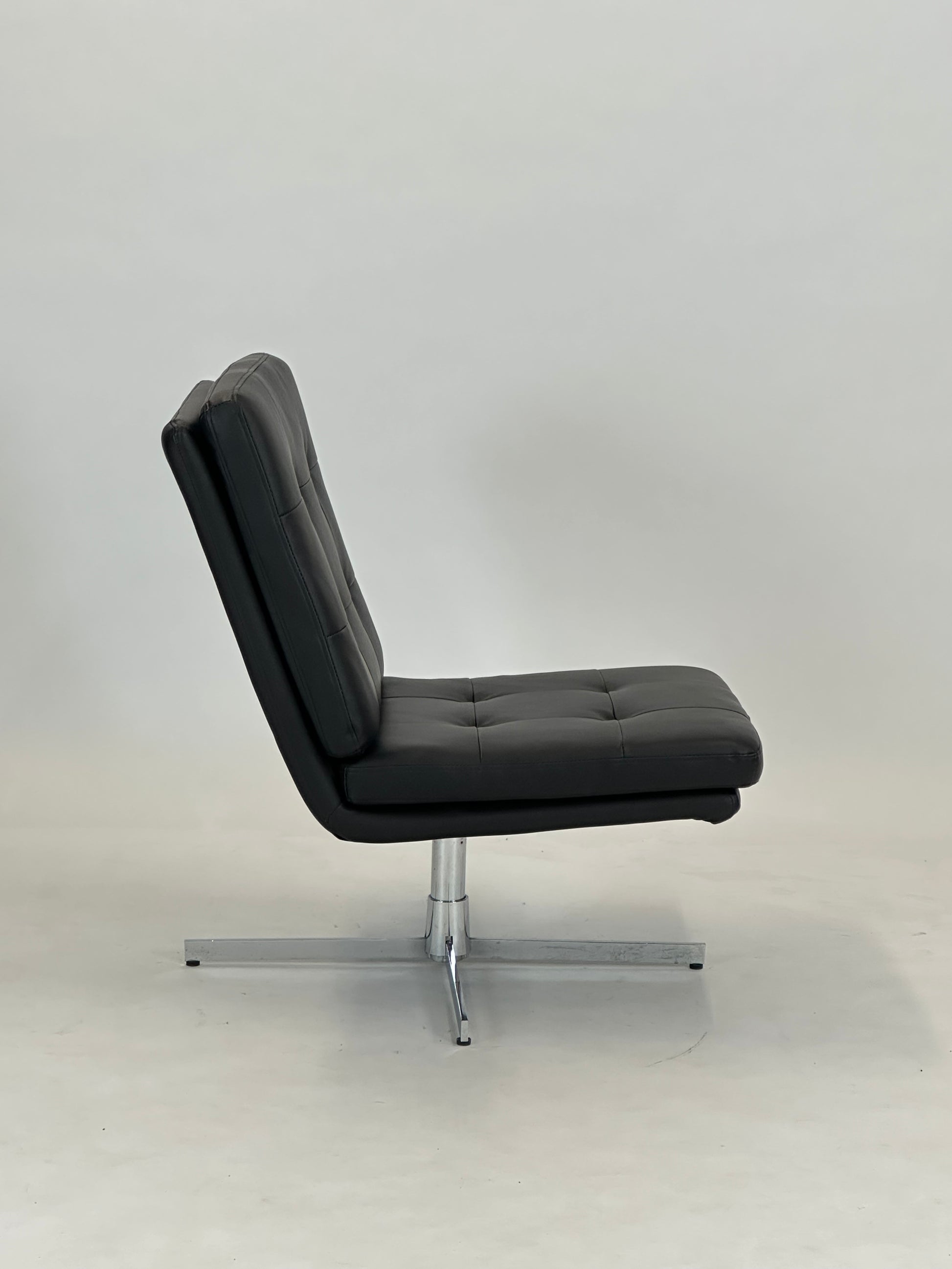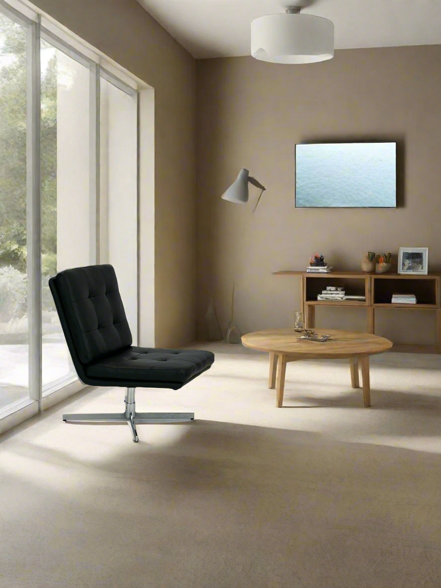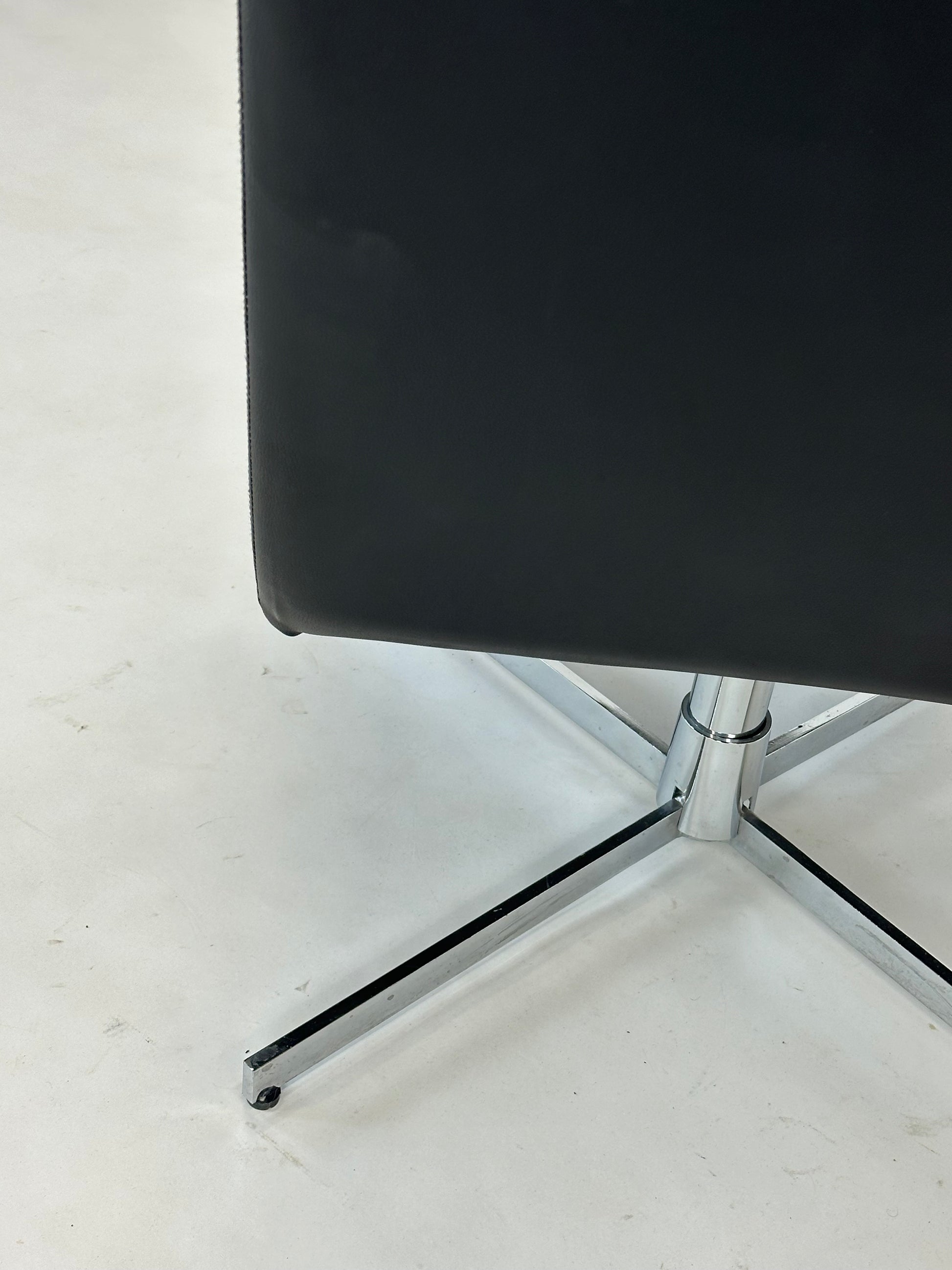 Denne eksklusive loungestol kombinerer klassisk design med moderne funktionalitet og tilbyder en komfortabel siddeoplevelse i et elegant udtryk. Med sin sorte læderpolstring og kromstel er stolen oplagt til både loungeområder, receptioner, kontorer og stilfulde hjem.