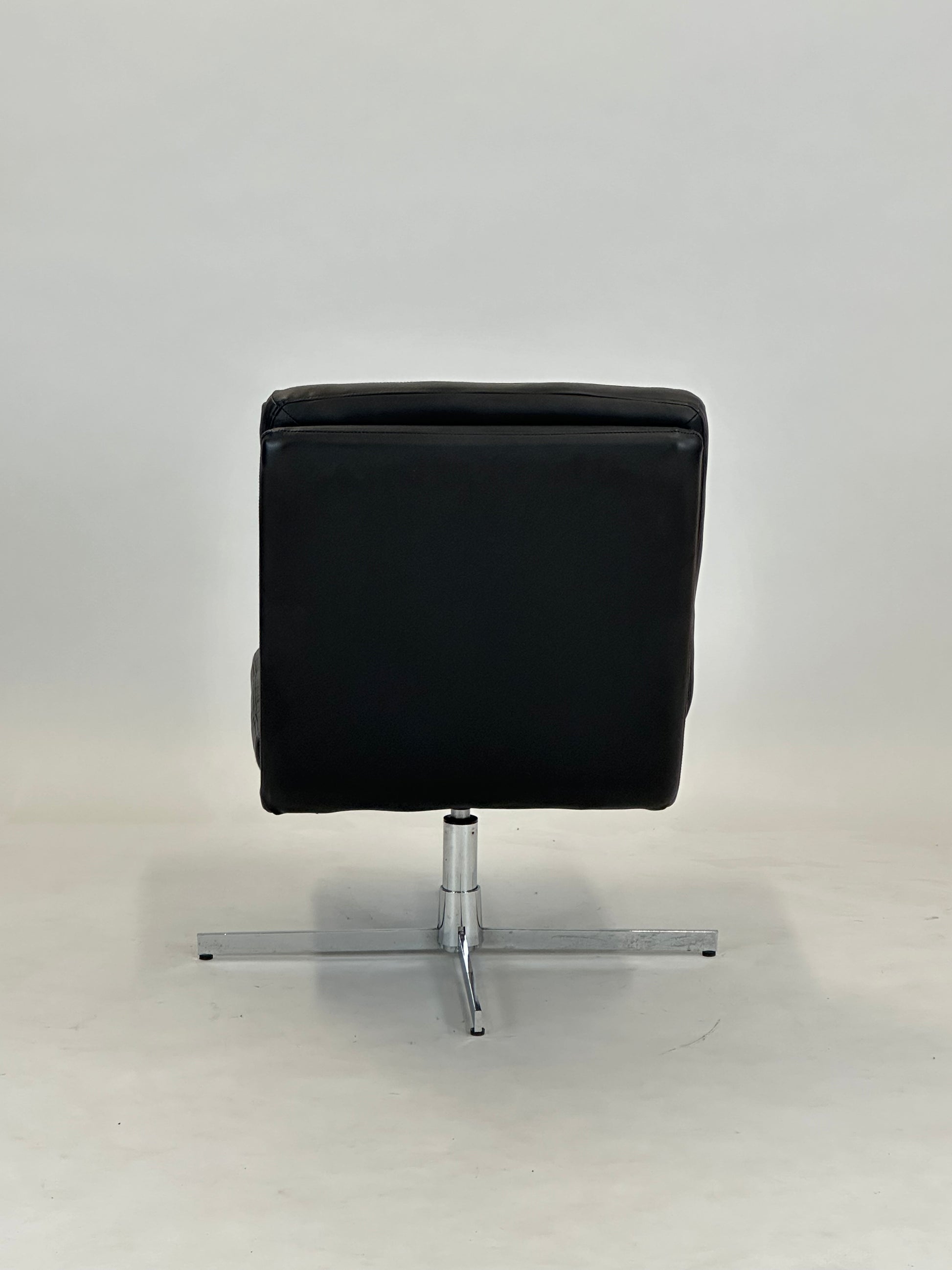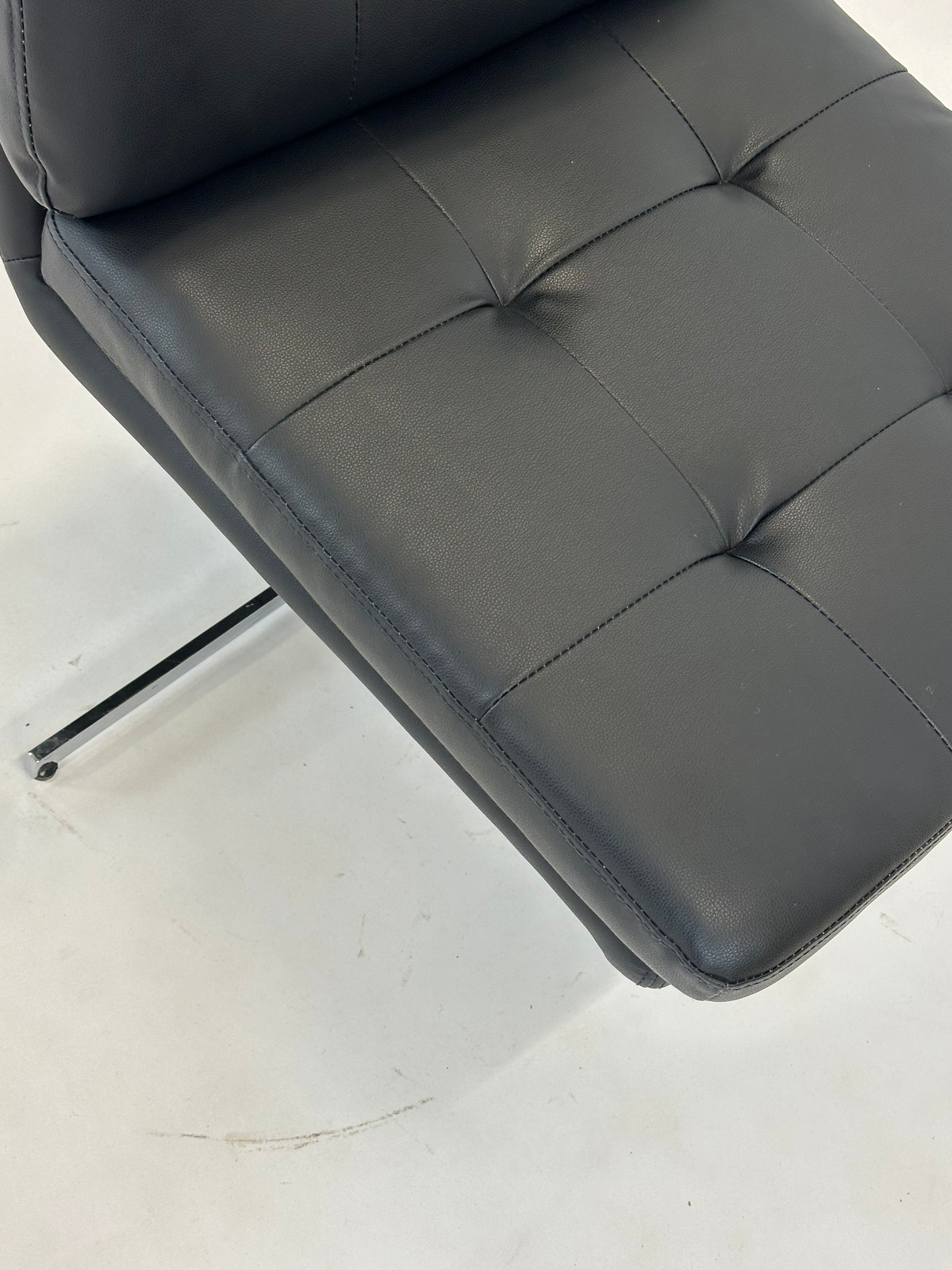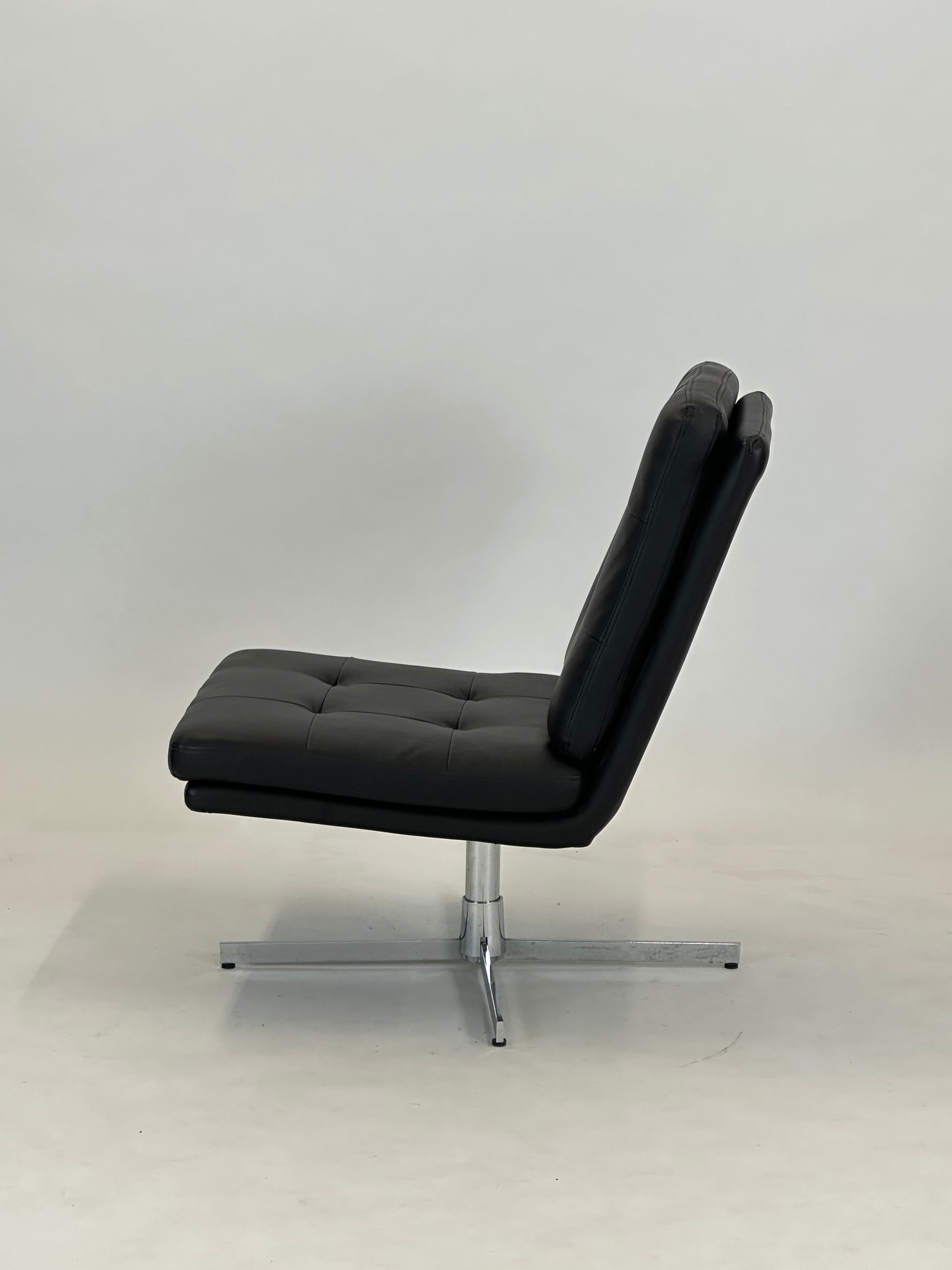 Denne eksklusive loungestol kombinerer klassisk design med moderne funktionalitet og tilbyder en komfortabel siddeoplevelse i et elegant udtryk. Med sin sorte læderpolstring og kromstel er stolen oplagt til både loungeområder, receptioner, kontorer og stilfulde hjem.