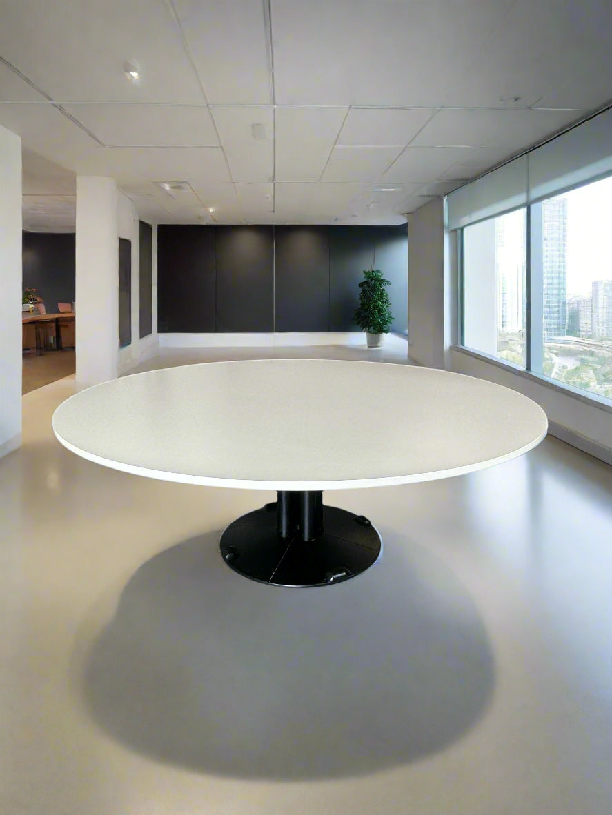 Dette imponerende runde bord med en diameter på hele 200 cm er skabt til at samle mange mennesker i både professionelle og sociale sammenhænge. Bordet har en hvid bordplade i slidstærkt laminat og en robust sort søjlebase, som giver både visuel balance og stabilitet. Det enkle og funktionelle design gør det ideelt til mødelokaler, kantiner, konferencerum eller som fællesbord i kreative kontormiljøer.