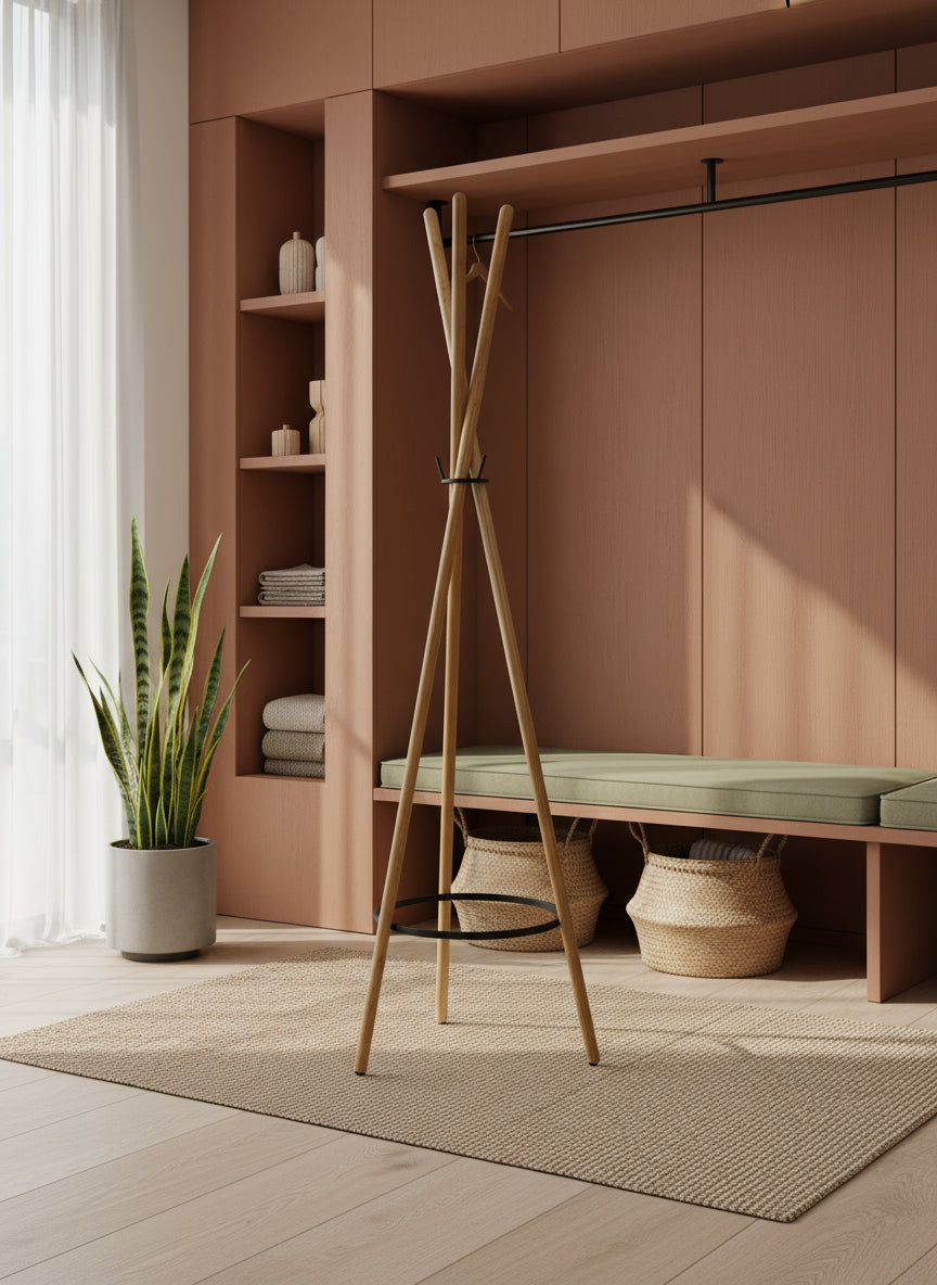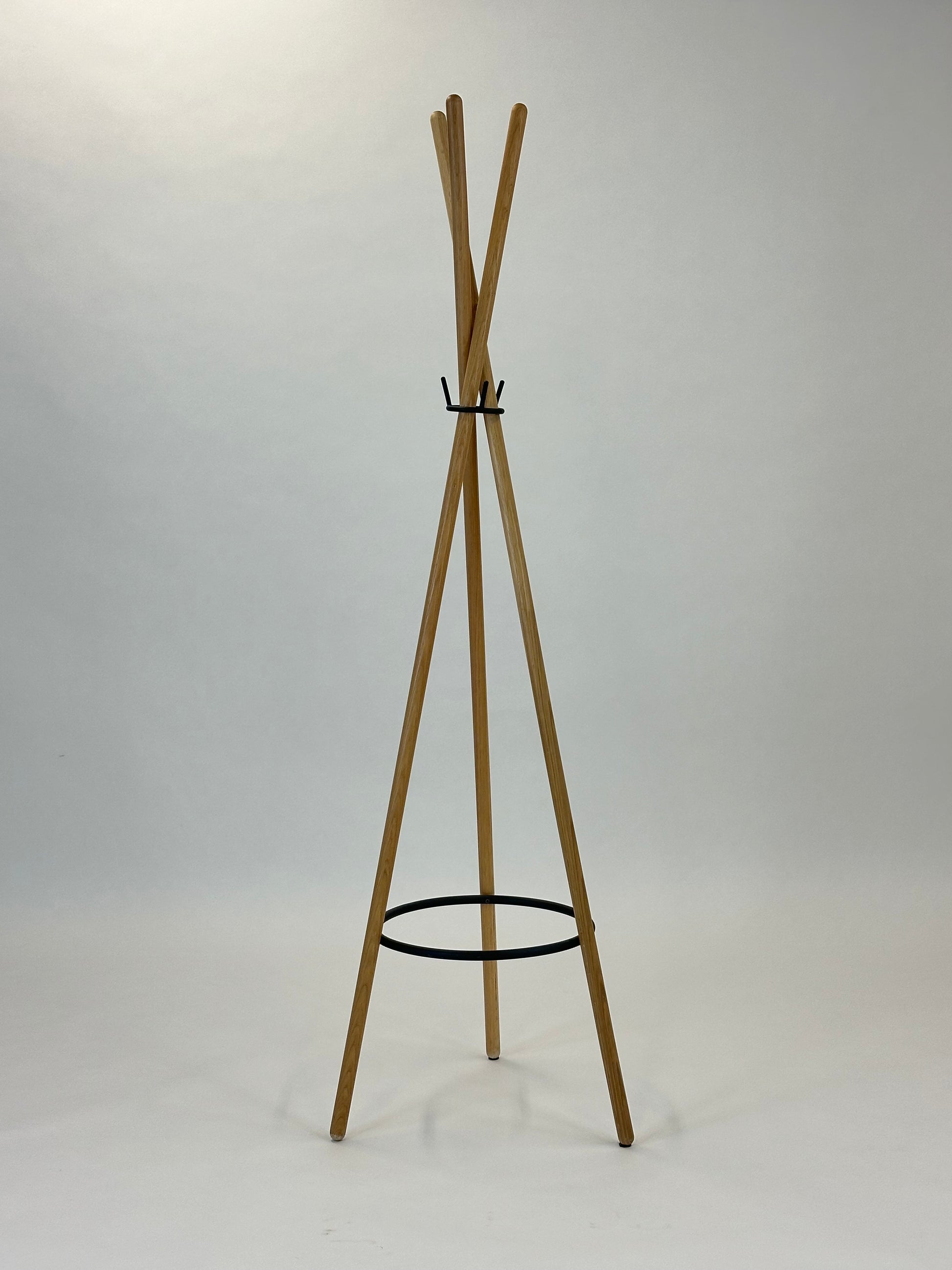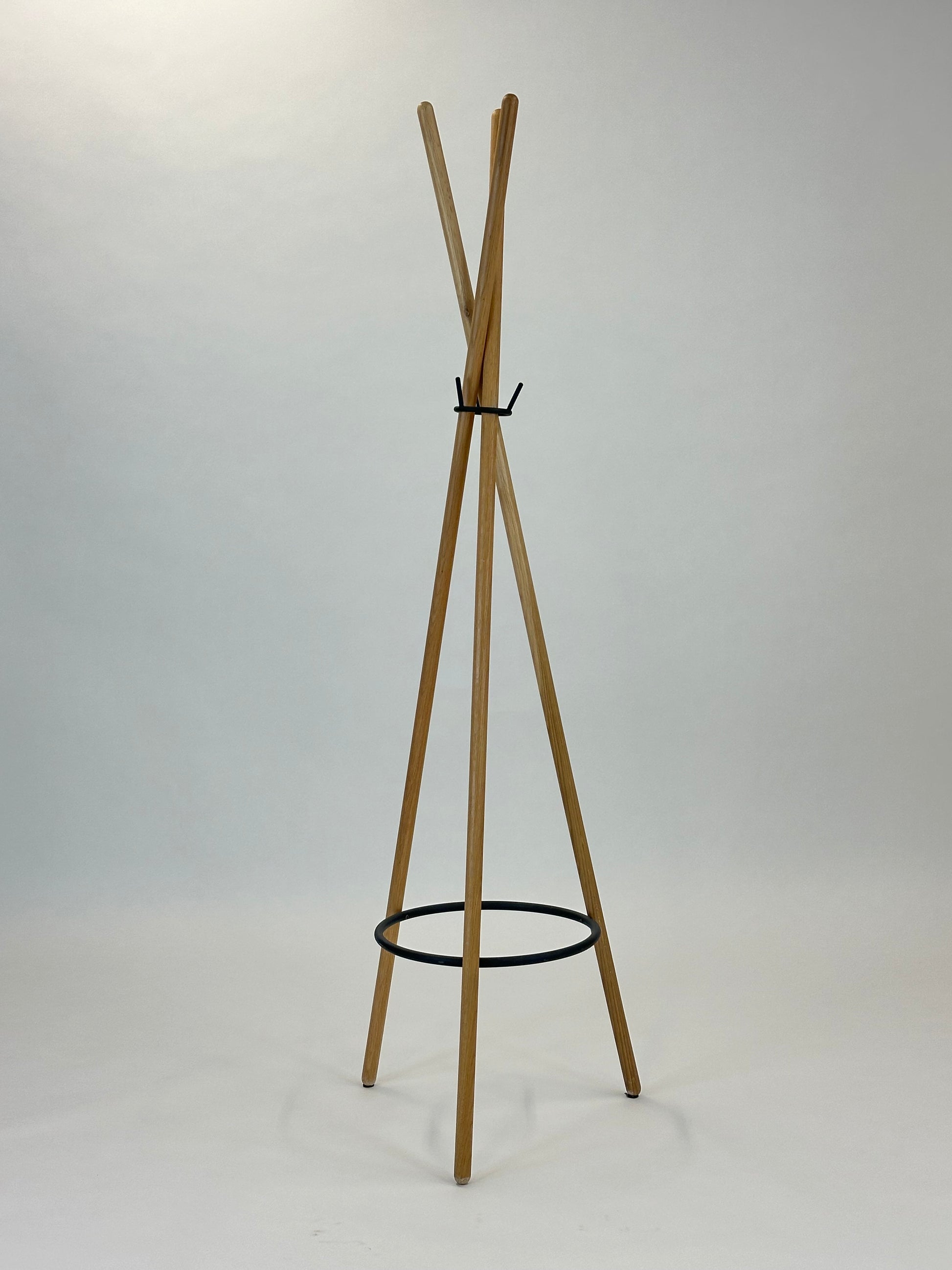 De tre slanke træben danner en stabil base, mens den karakteristiske twist-konstruktion giver stumtjeneren sit unikke og luftige udseende. Den sorte metalring tilføjer visuel balance og giver mulighed for praktisk ophæng, mens de diskrete kroge sikrer plads til jakker, tasker og accessories.