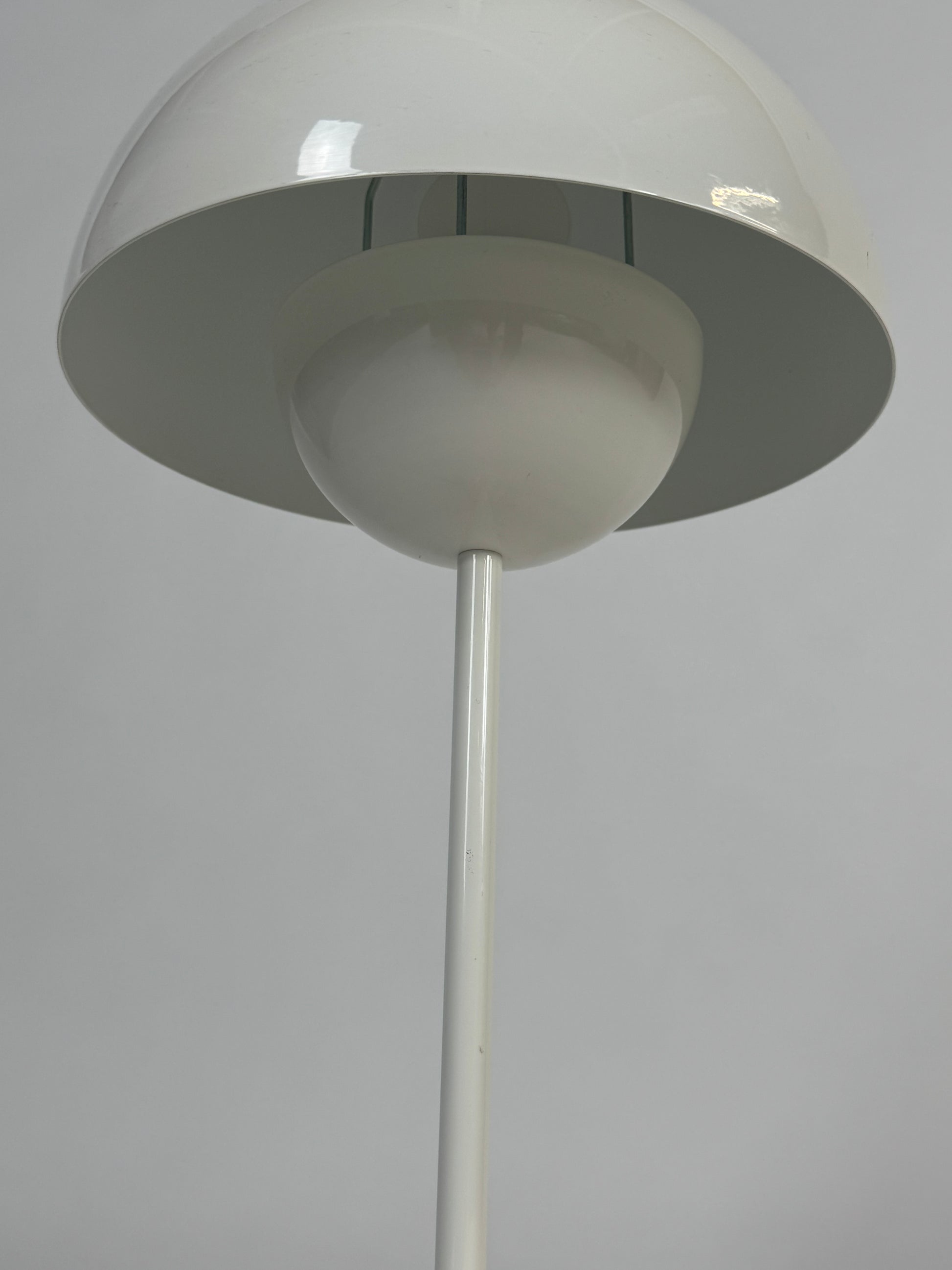 Denne model er udført i en blank hvid lakering, som understreger lampens rene linjer og gør den særligt velegnet til både moderne og klassiske indretninger. Flowerpot VP3 er ideel som bordlampe i kontormiljøer, loungeområder eller private hjem, hvor der ønskes både stemning og designværdi i ét produkt.