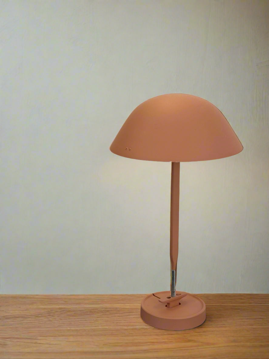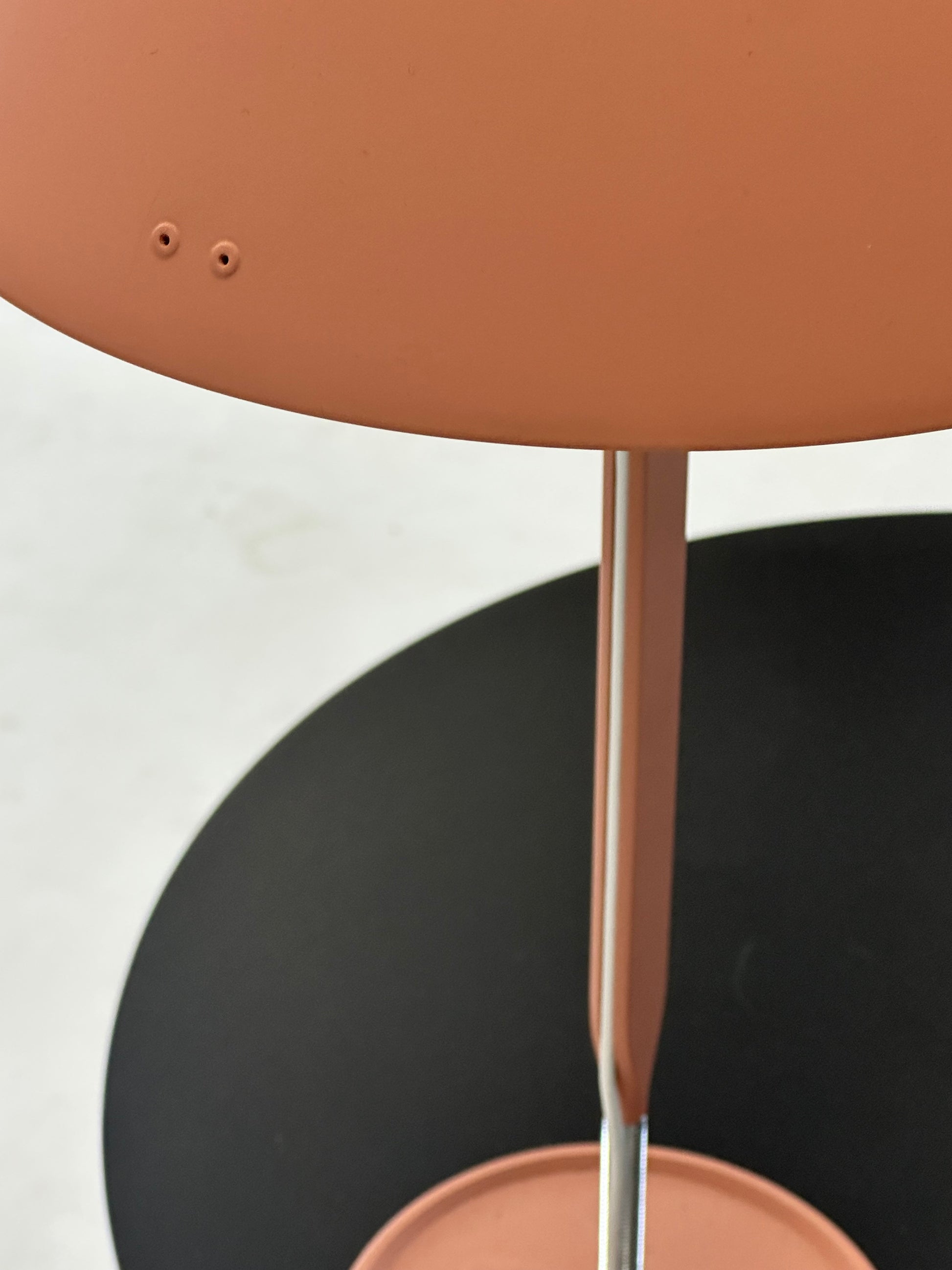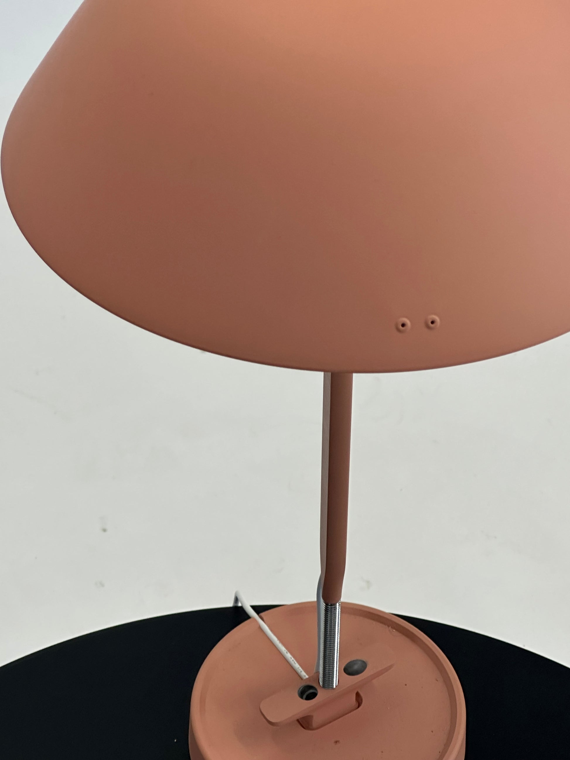Lampen er udført i pulverlakeret aluminium i en varm terrakottafarve, hvilket tilfører varme og personlighed til indretningen. Den diskrete ledningsføring langs standeren understreger det minimalistiske design, mens den stabile base sikrer, at lampen står sikkert på skriveborde og reoler.